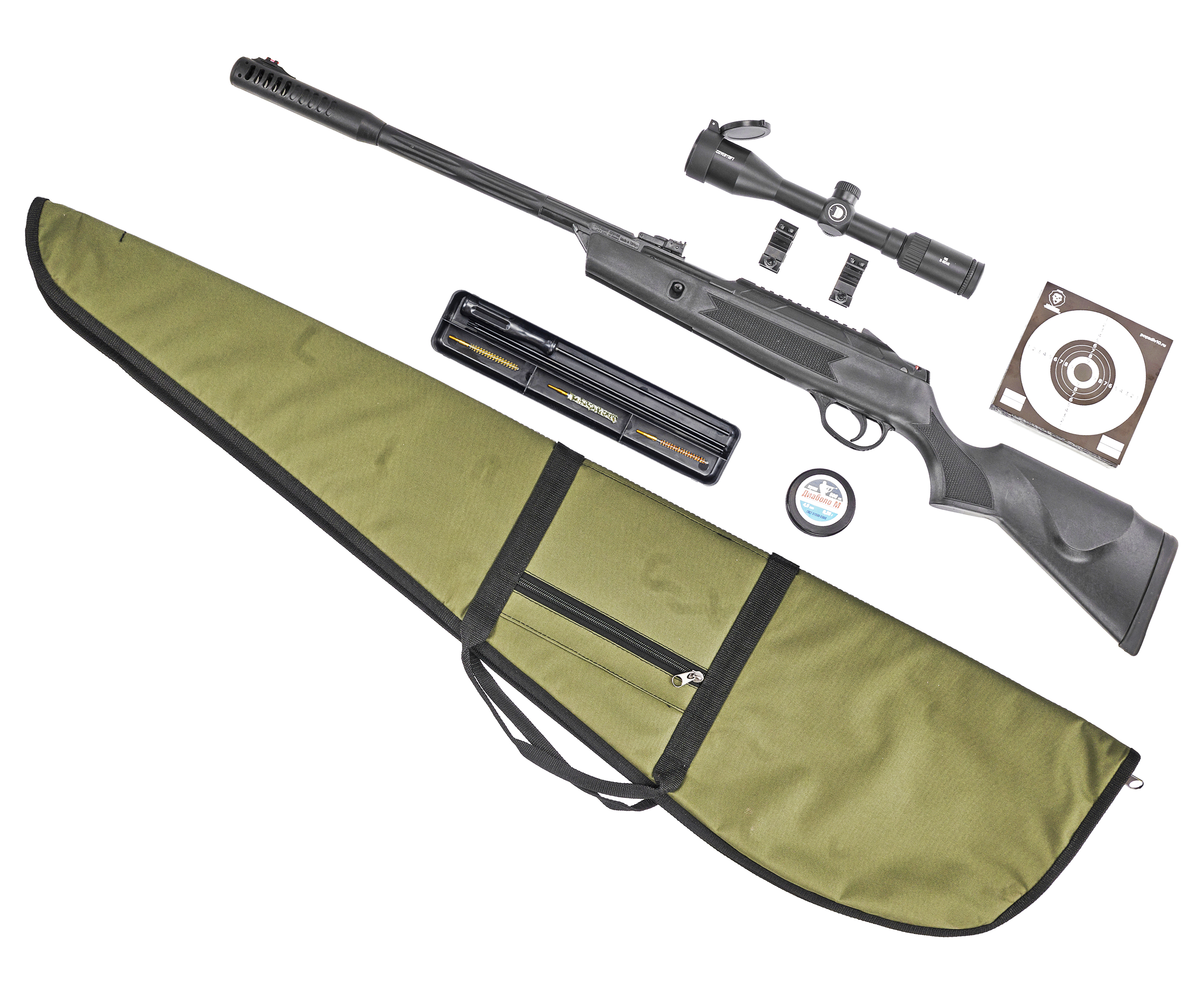 Перечисленным выше подборка не ограничивается. Дополнительно в составе присутствуют мишени, которые требуются для отработки навыков стрельбы. Кроме того, включен набор для чистки пневматики и тканевый чехол для транспортировки к месту эксплуатации, который подобран под габариты оружия.
