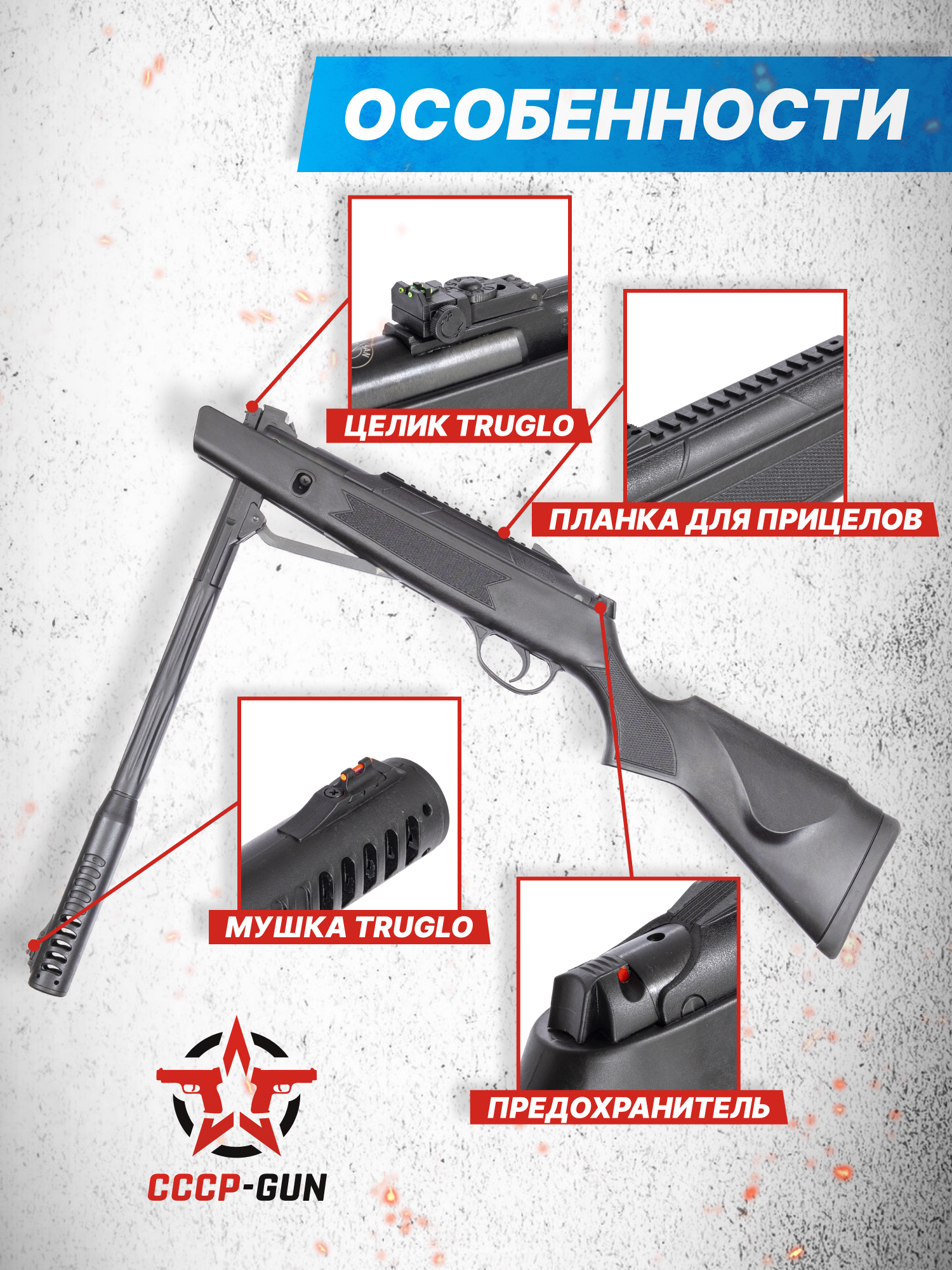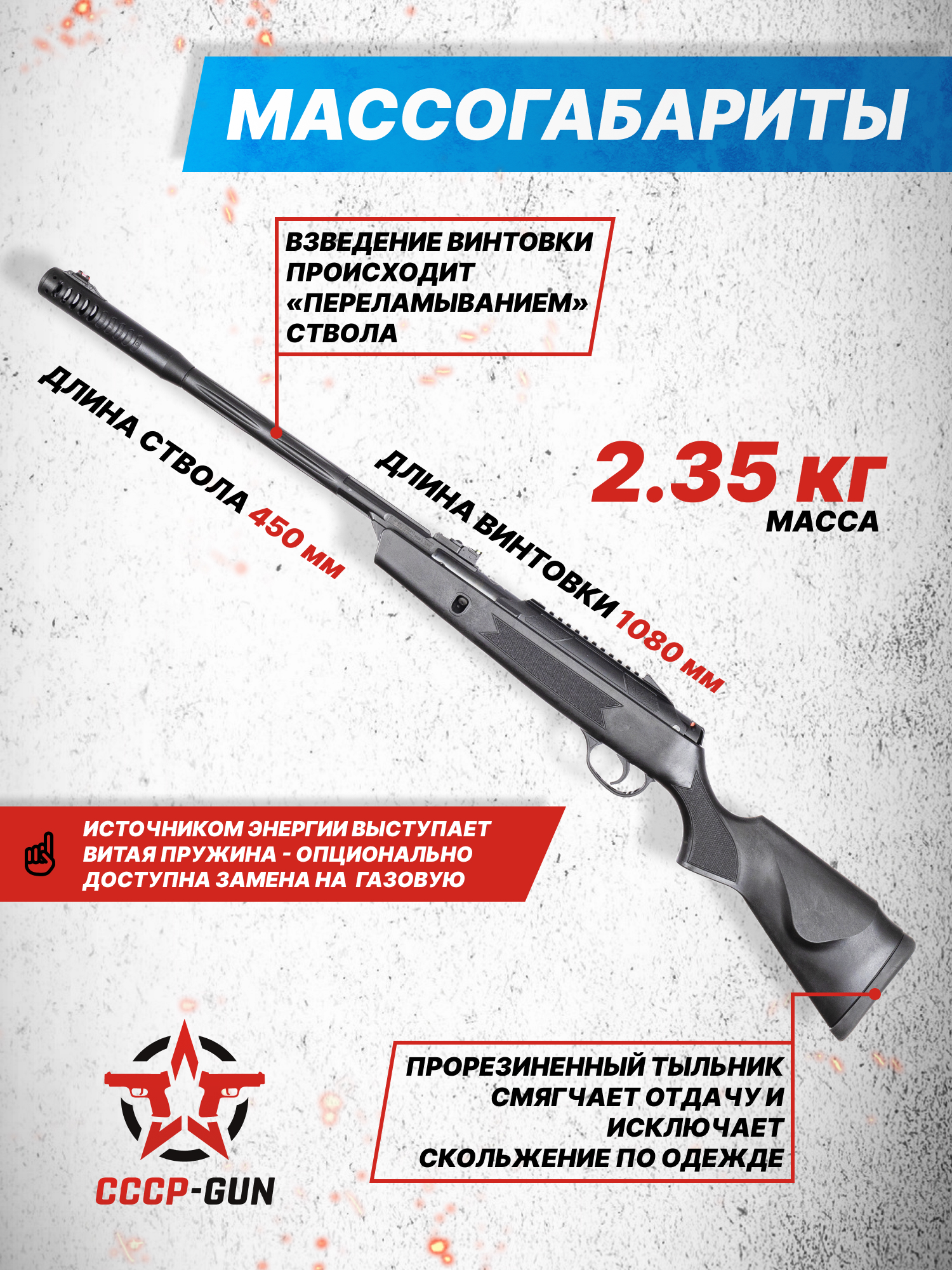 Внимание! Данная модель поставляется в разрешенной мощности для свободного приобретения на территории Российской Федерации. При этом в модели имеется возможность увеличения мощности путем замены части деталей или настройки конструкции, однако не стоит забывать о Федеральном законе «Об оружии» № 150 - ФЗ. В случае необходимости, опираясь на данный закон и руководствуясь им, возможно, потребуется получить разрешение от ЛЛР ГУ МВД России после вмешательства в конструкцию.