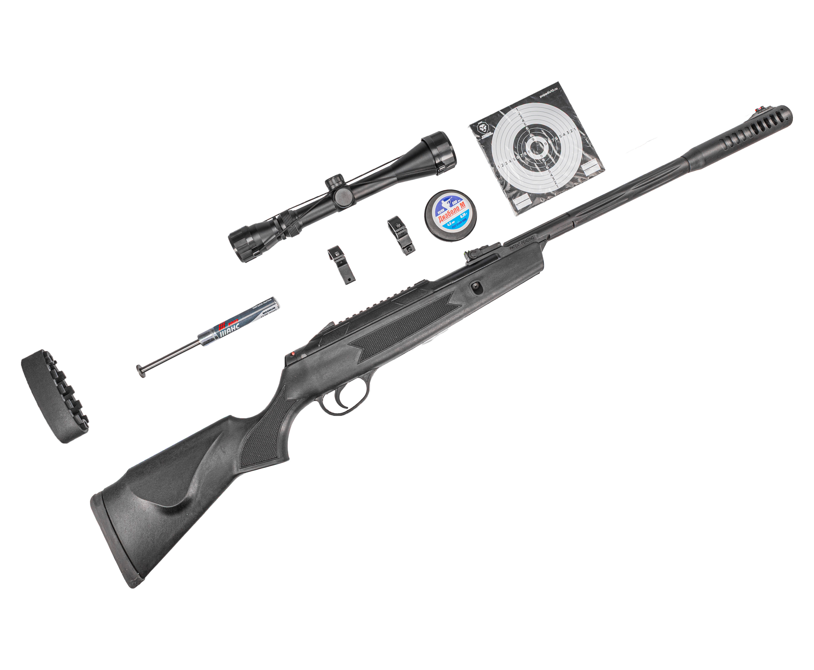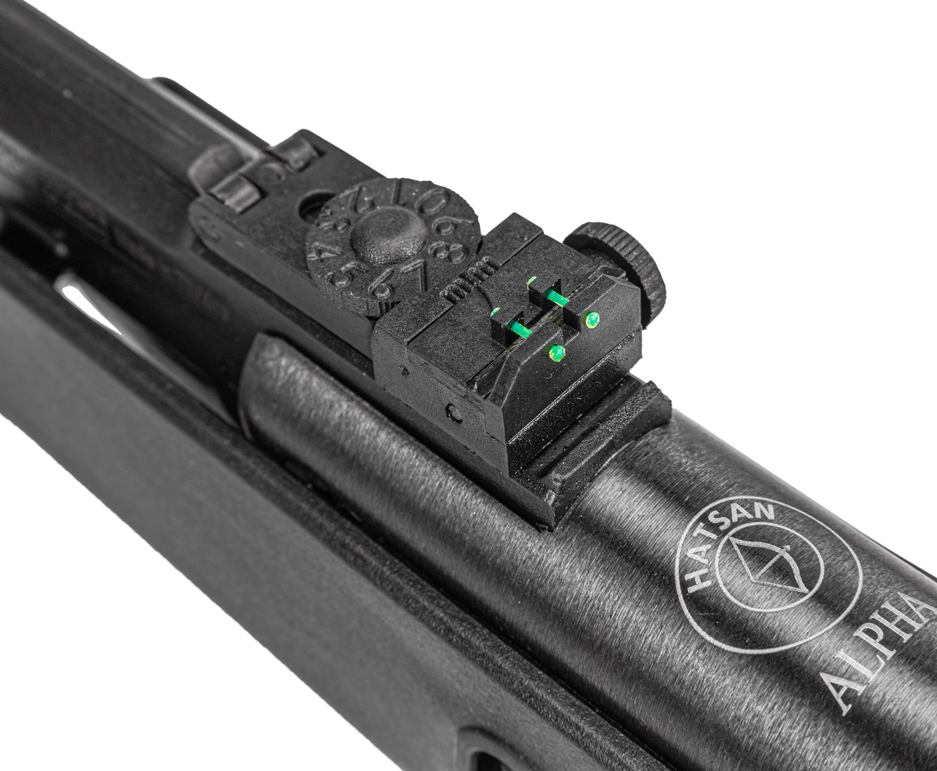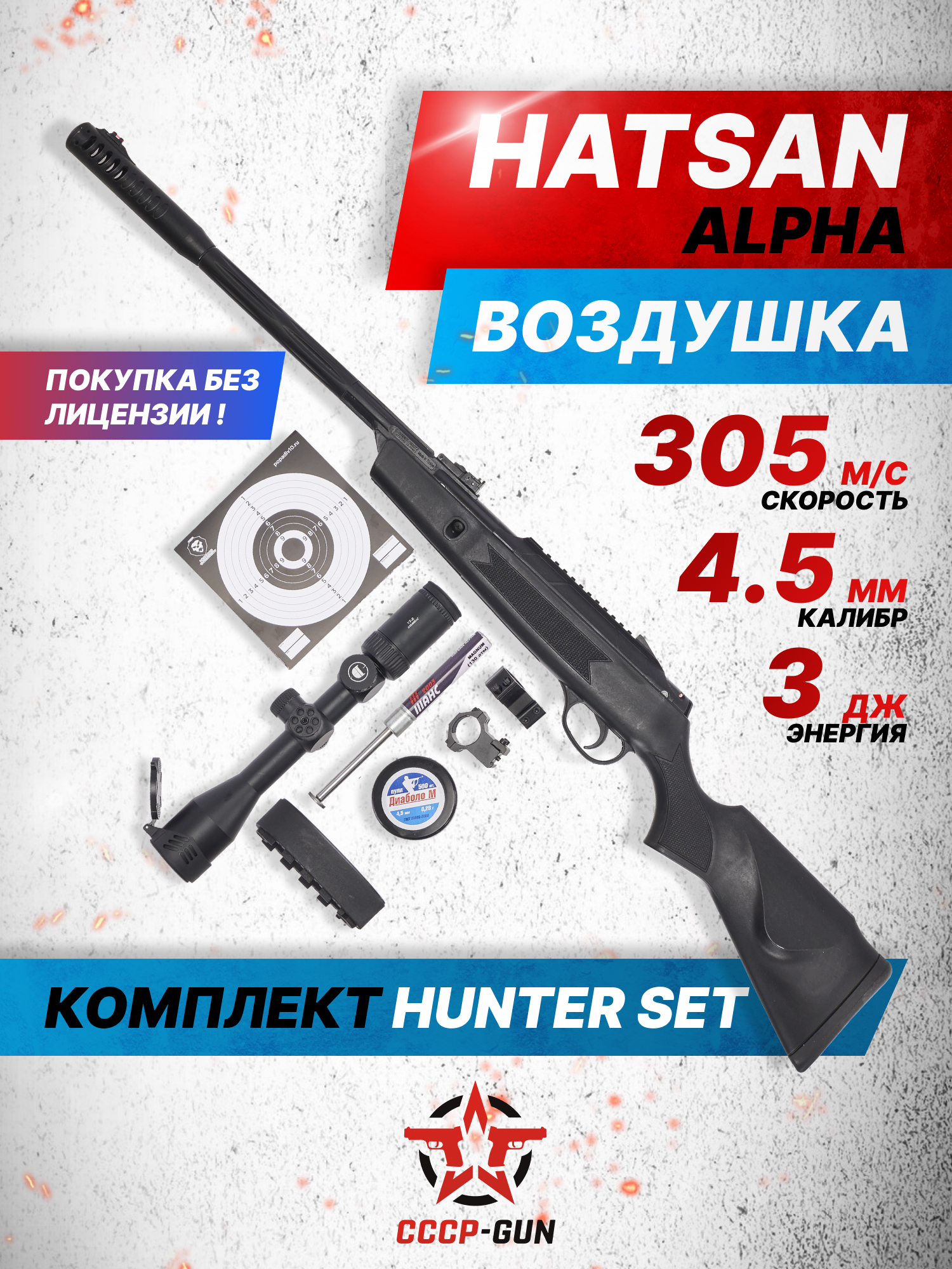 К указанной категории относится обозреваемый набор Hunter Set, основой для которого стала пневматическая винтовка Alpha от турецкого бренда Hatsan. Классифицируется упомянутое изделие как пружинно-поршневая пневматика, осуществляющая выстрелы за счет силы энергии расширения воздуха, который сжимается в цилиндрическом компрессоре. В штатном варианте исполнения «воздушка» использует тугую витую пружину, однако комплект включает в себя газовый аналог, дающий одновременно повысить мощностные и технические характеристики модели, а также уменьшить импульс отдачи выстрела.
