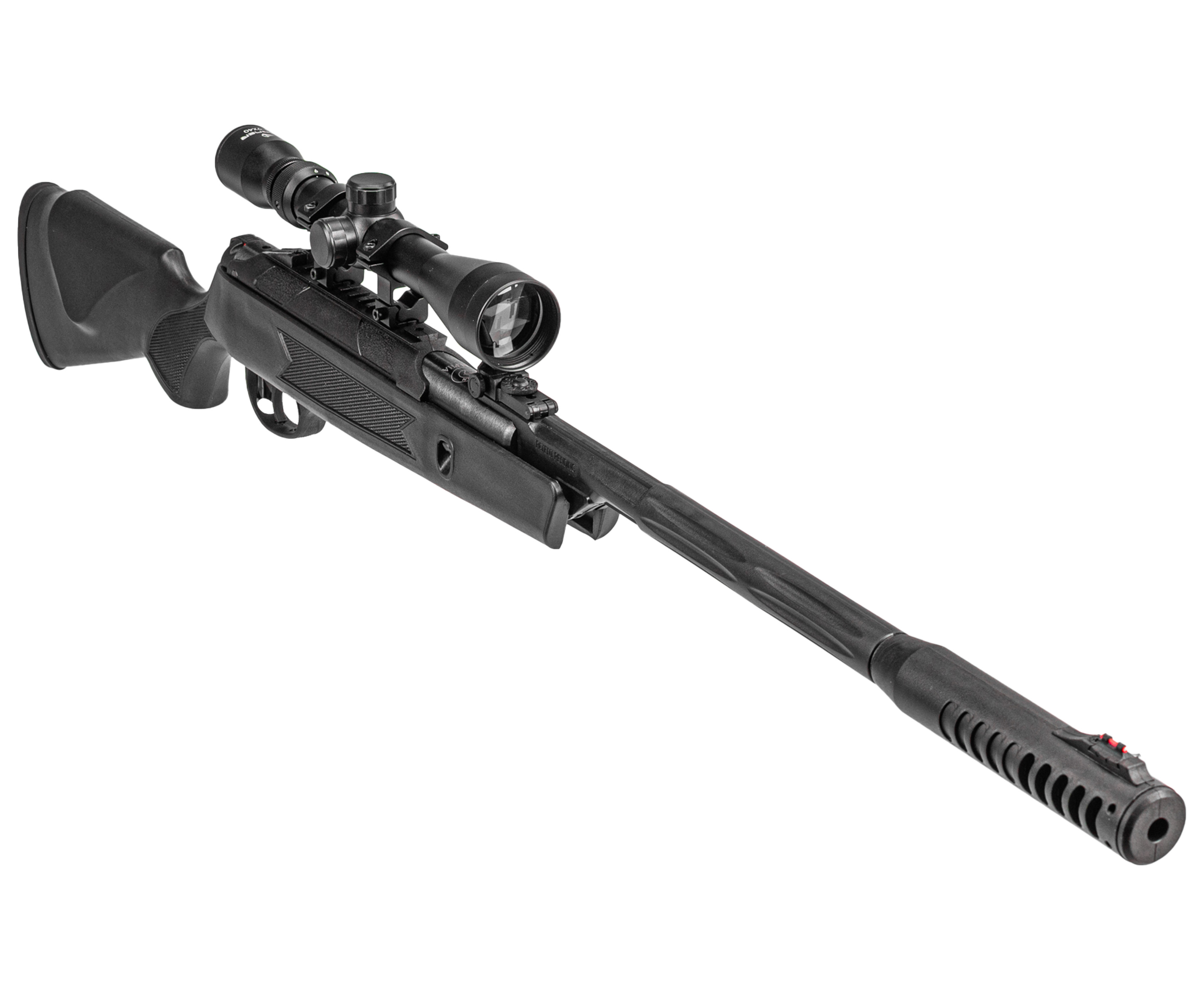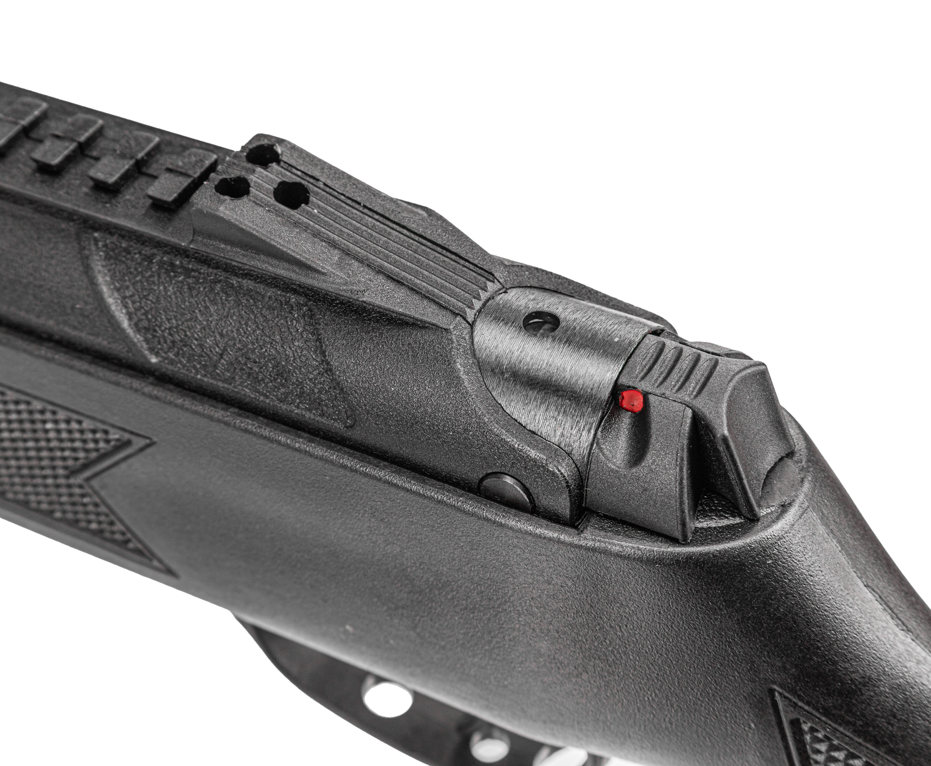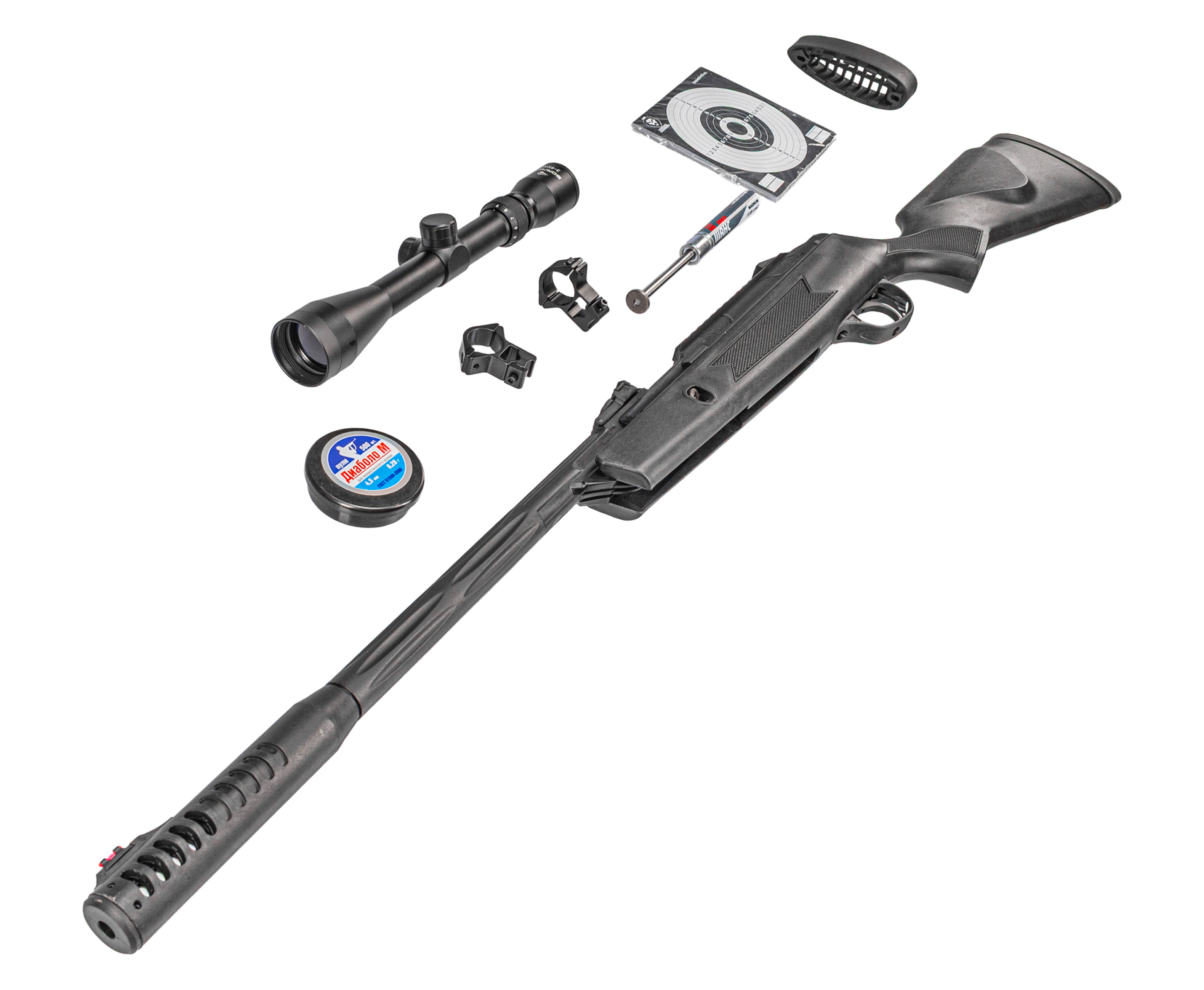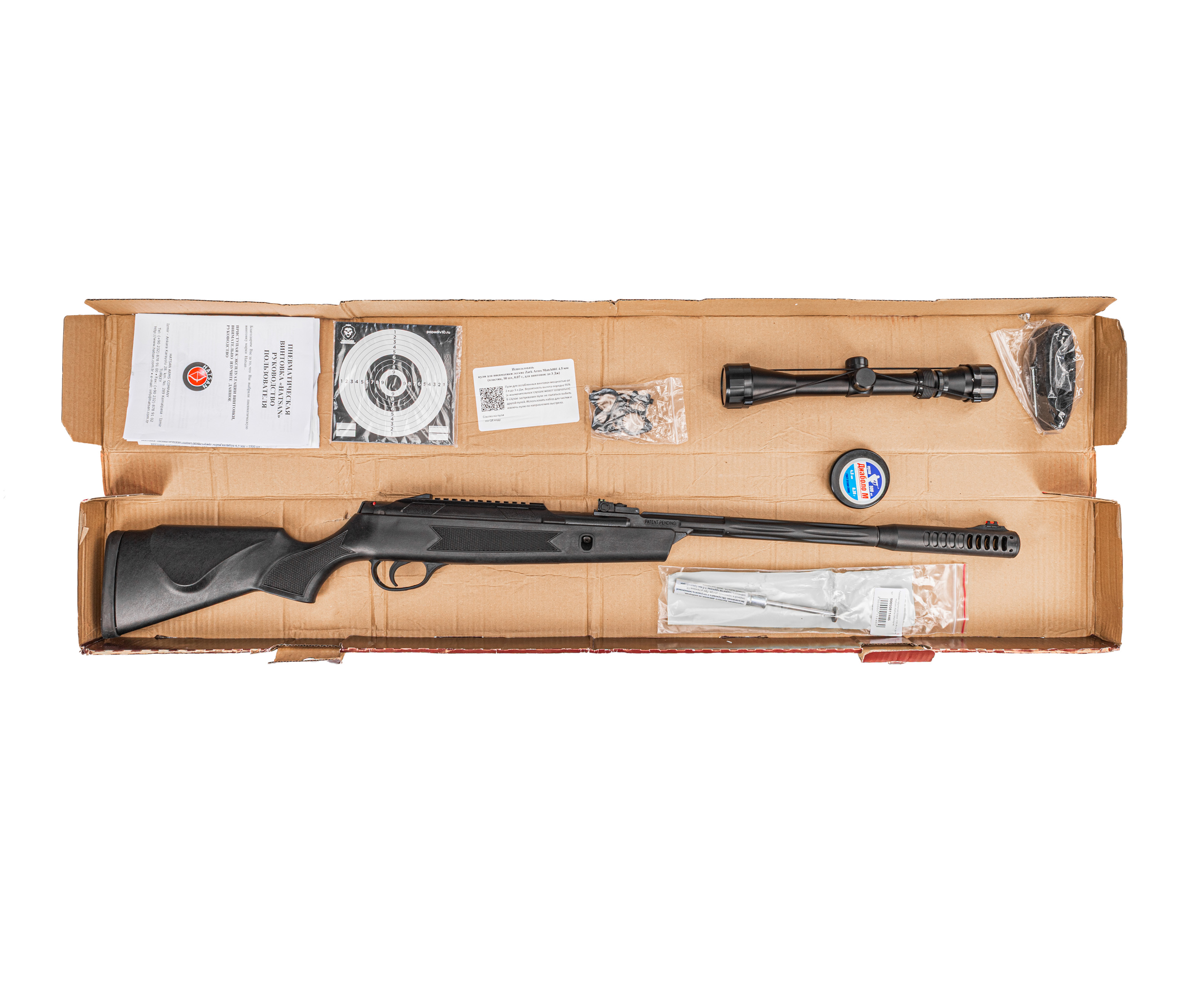 К указанной категории относится обозреваемый набор Hunter Set, основой для которого стала пневматическая винтовка Alpha от турецкого бренда Hatsan. Классифицируется упомянутое изделие как пружинно-поршневая пневматика, осуществляющая выстрелы за счет силы энергии расширения воздуха, который сжимается в цилиндрическом компрессоре. В штатном варианте исполнения «воздушка» использует тугую витую пружину, однако комплект включает в себя газовый аналог, дающий одновременно повысить мощностные и технические характеристики модели, а также уменьшить импульс отдачи выстрела.