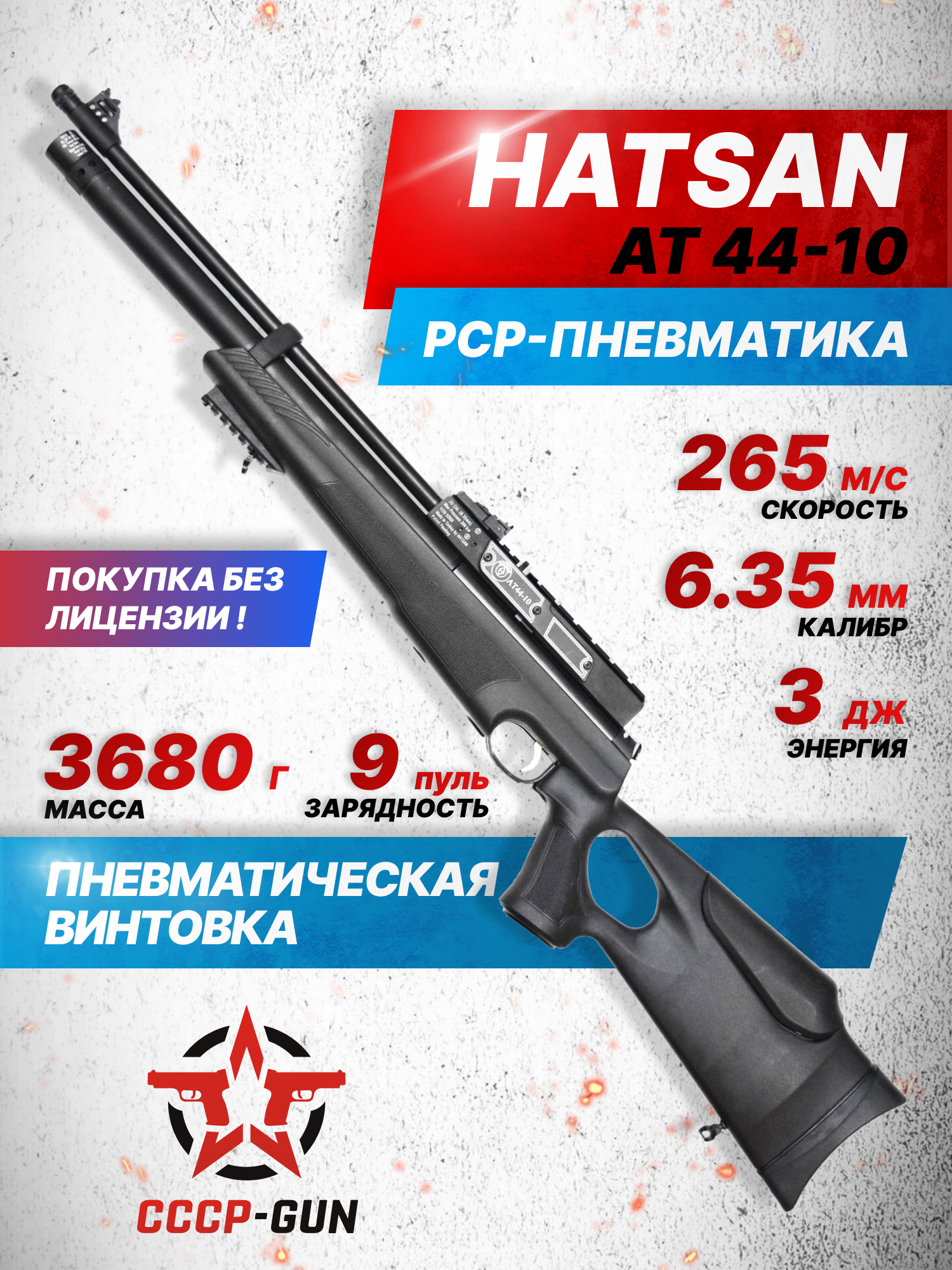 Потенциальная скорость полета снаряда, выпущенного из AT 44-10, составляет 265 метров в секунду, однако на территорию России производитель завозит модели с параметром дульной энергии, находящимся на разрешенном значении не выше 3 Дж. Таким образом, купить обозреваемую винтовку могут даже начинающие пользователи пневматики, у которых пока не появилась оружейная лицензия. Чтобы повысить уровень безопасности экземпляра, конструкторы Hatsan разработали и установили гибридный предохранитель ручного и автоматического принципа действия.
