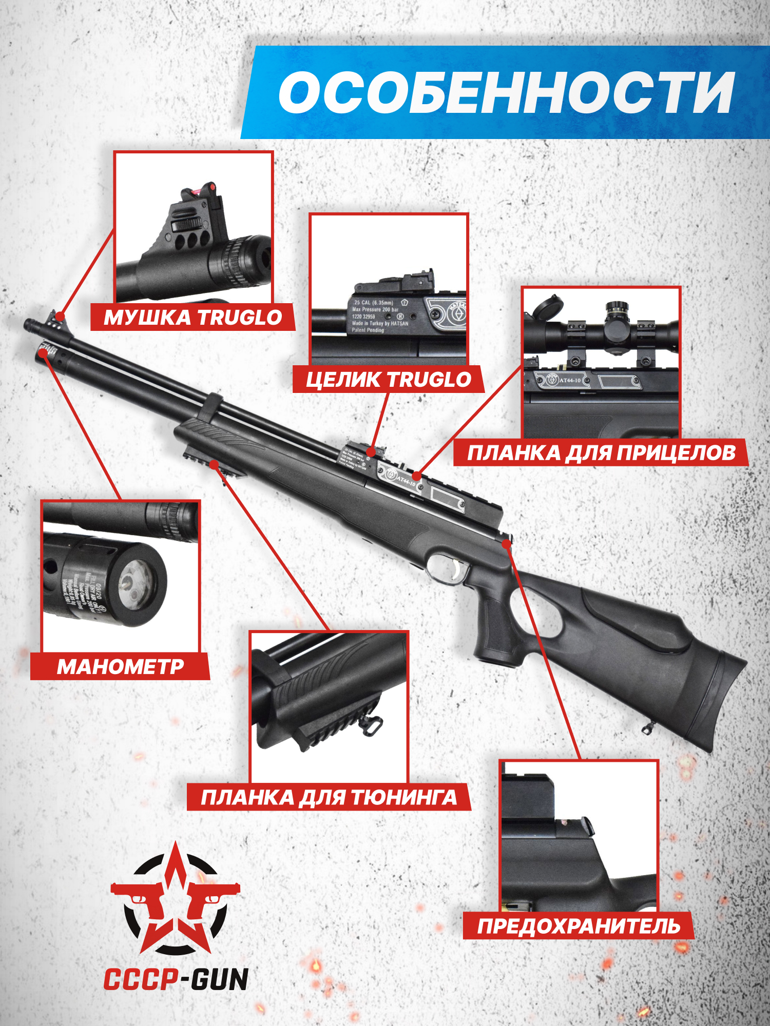 PCP винтовка Hatsan AT 44 10 6.35 относится к передовому виду пневматики, работающей по принципу предварительной закачки. С помощью электрического или ручного насоса пользователь заправляет воздухом подствольный резервуар на 180 кубических сантиметров до показателя давления на интегрированном в оружие манометре, равного 200 Бар. Спуск газа происходит по прямотоку, за счет чего на полном ресивере изделие демонстрирует более серьезные показатели.