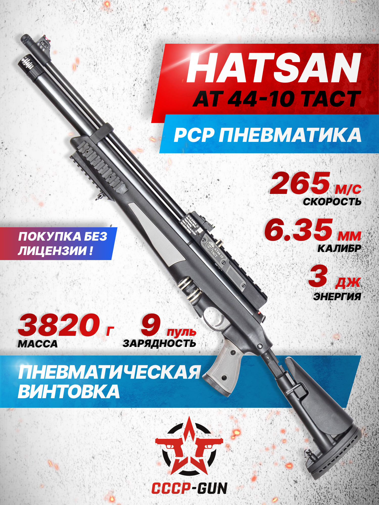По паспорту AT 44 10 Tact выдает скорость пули до 265 метров в секунду, однако производитель поставляет на российский рынок модели с ограничением показателя дульной энергии на разрешенной отметке в 3 J. Такая опция открывает доступ начинающим пользователям к покупке обозреваемой пневматики, по той причине, что для приобретения от будущих владельцев изделия специальная лицензия не требуется. Конструкторы Hatsan позаботились о безопасности стрелков, добавив на ближнюю к прикладу часть металлического кожуха автоматический предохранитель.