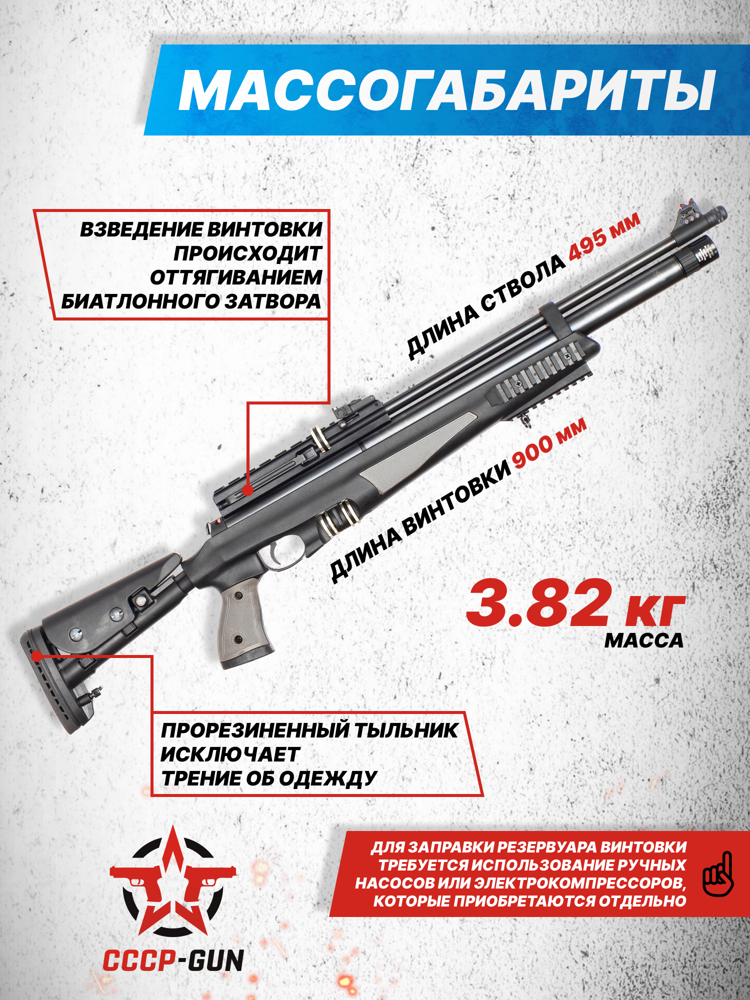 В комплекте с винтовкой прикладываются сразу три 9-зарядных магазина, а для удобства их хранения между спусковой скобой и цевьем предусмотрены специальные отсеки. Благодаря барабанной системе указанных картриджей и рычагу взвода с плавным ходом, стрелять из оружия удастся, поддерживая хороший темп. В качестве снарядов используются свинцовые пули воланчикового формата калибра 6.35 мм, для точности полета которых пневматика оснащена стальным 495-миллиметровым нарезным бланком.