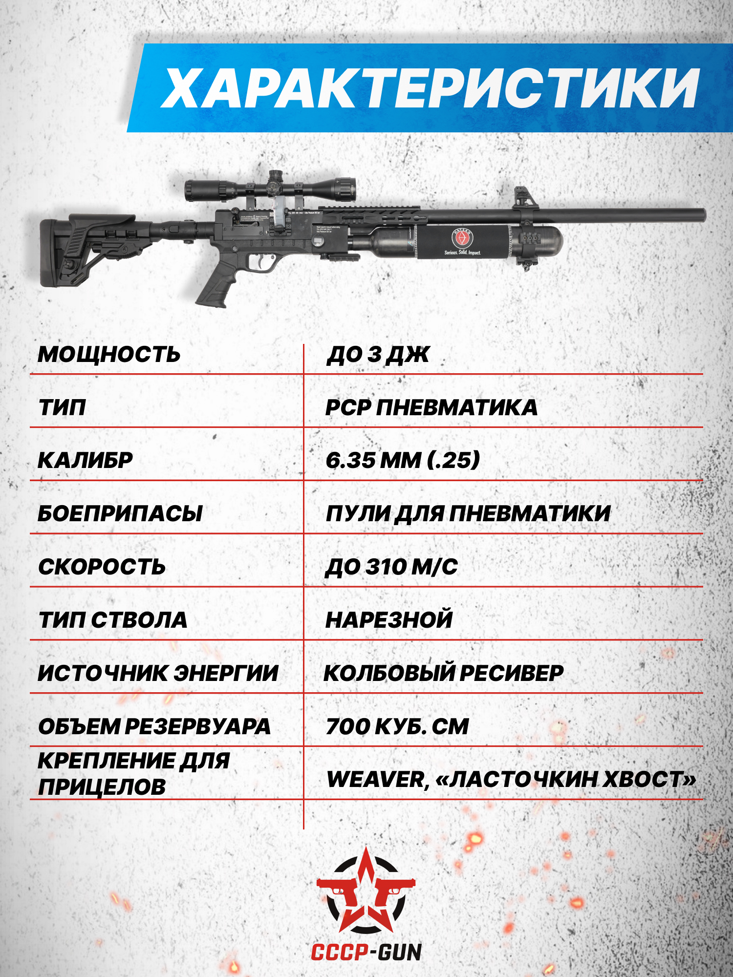 Винтовка поставляется в гражданской версии с ограничением дульной энергии до 3 Джоулей, что позволяет приобрести товар без лицензии. После проведения модификаций, скорость полета пули достигает 310 метров в секунду. Этой характеристики хватит для результативной стрельбы на дальние дистанции при подборе соответствующего типа боеприпасов.