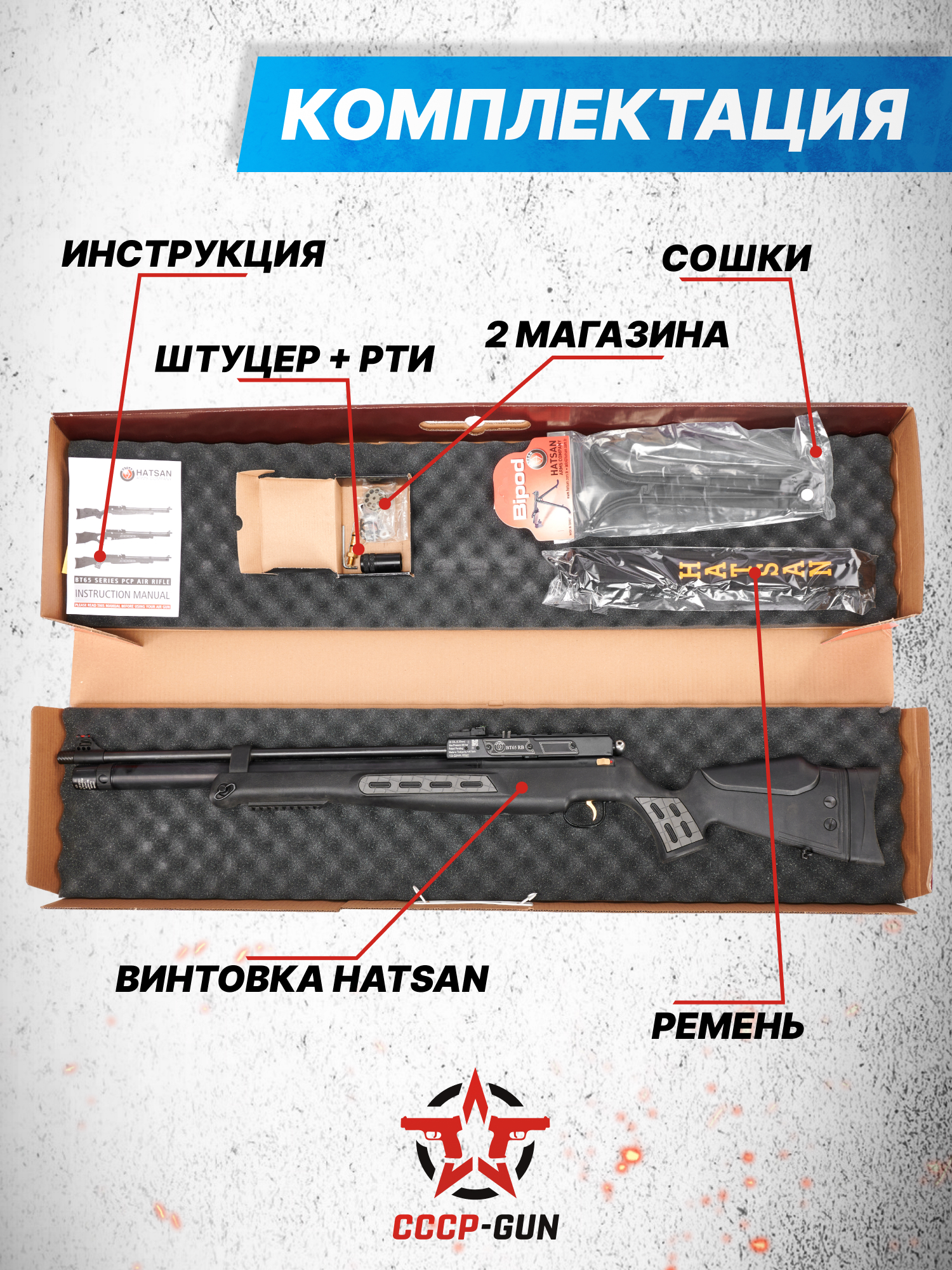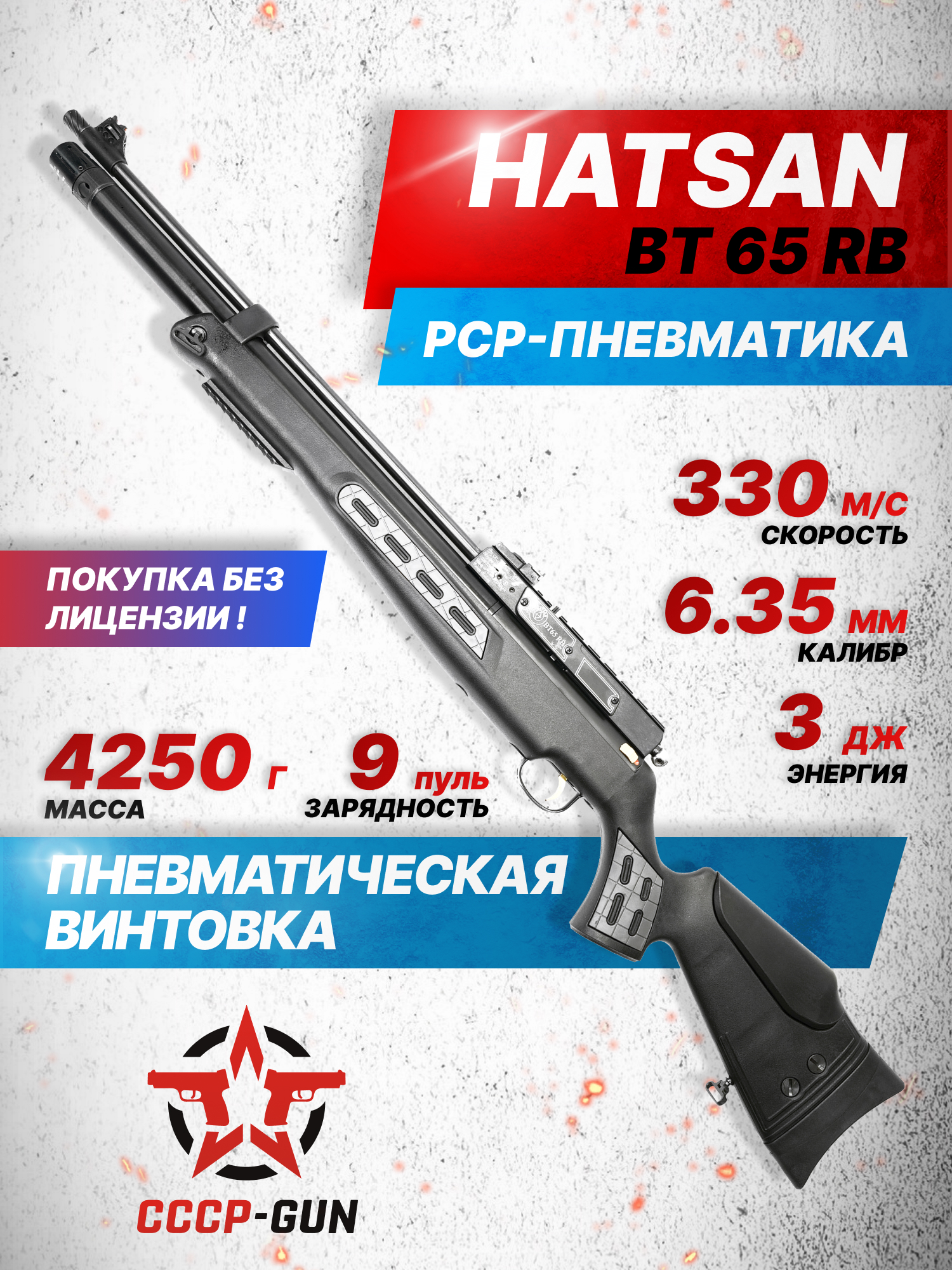 В Россию Хатсан БТ 65 РБ поступает с дульной энергией на фиксированной отметке 3 J, ввиду чего по закону для покупки этой винтовки оружейная лицензия не требуется. Чтобы с моделью можно было безопасно работать, на левой стороне корпуса предусмотрен двухпозиционный предохранитель ручного плана. Стоит уточнить, что, по данным производителя, после модернизации пневматического механизма изделия для возвращения заводских характеристик, пользователь сможет добиться скорости полета пули, равной 330 метрам в секунду.