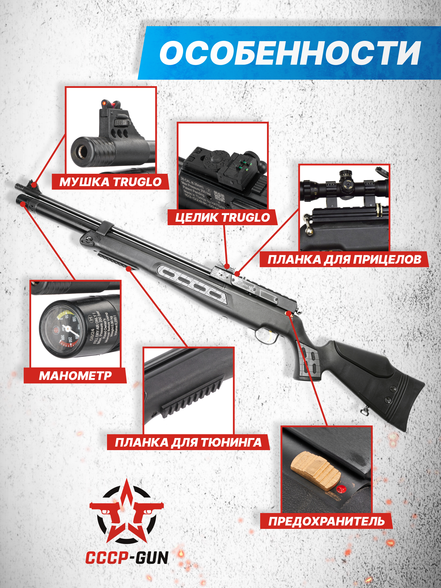 Под резервуаром на передней части ложа спроектирована планка Picatinny, на которую монтируются тактические фонари, сошки и специальные ортопедические упоры. Корпус винтовки отличается комбинированной направляющей для установки коллиматоров и оптики с крепежами под Weaver 22 мм и «Ласточкин хвост» 11 мм. Чтобы работать с пневматикой можно было без покупки дополнительных прицельных устройств, на модель добавили механические целик и мушку с встроенными светонакопительными элементами.