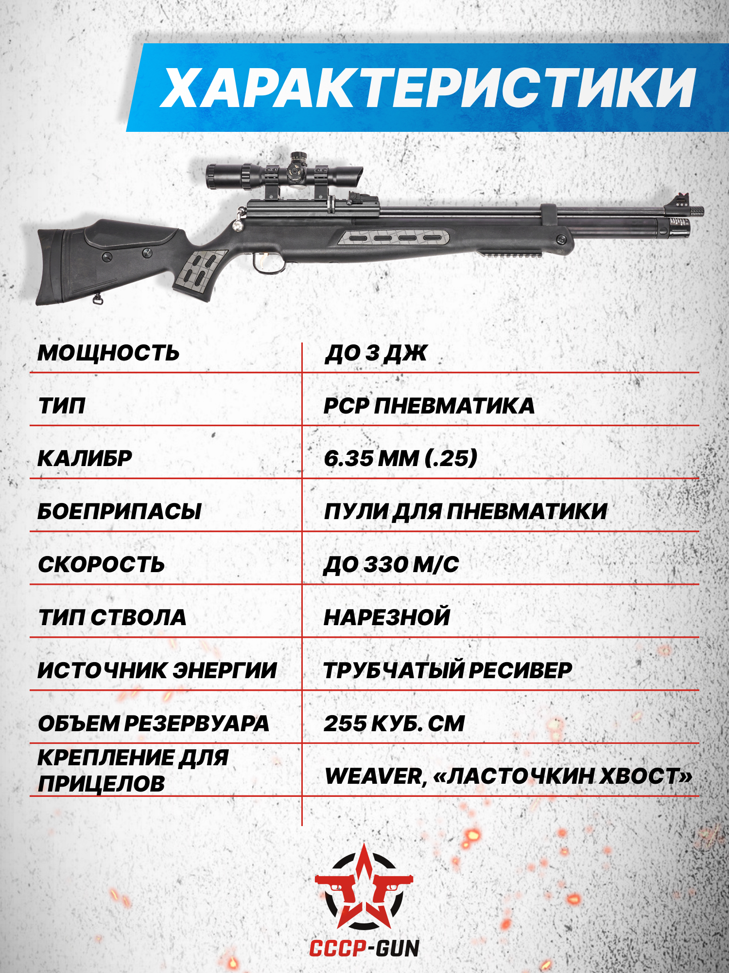 Внимание! Данная модель поставляется в разрешенной мощности для свободного приобретения на территории Российской Федерации. При этом в модели имеется возможность увеличения мощности путем замены части деталей или настройки конструкции, однако не стоит забывать о Федеральном законе «Об оружии» № 150 - ФЗ. В случае необходимости, опираясь на данный закон и руководствуясь им, возможно, потребуется получить разрешение от ЛЛР ГУ МВД России после вмешательства в конструкцию.
