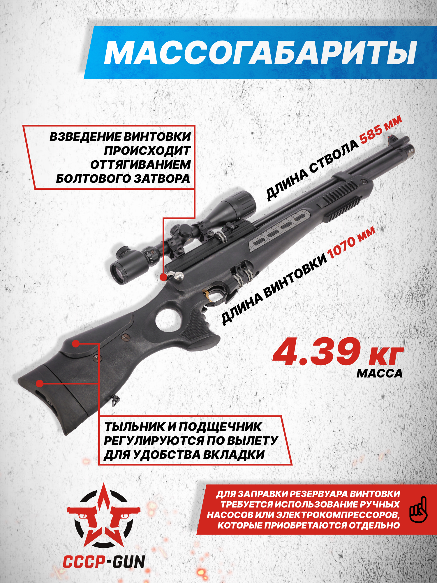Общая длина модели - 1070 мм, а масса составляет 4.39 кг. Несмотря на габариты, винтовка сбалансирована - она хорошо ложится в плечо и не тянет вперед при прицеливании. Подходит для тренировок и уверенной стрельбы с упора.