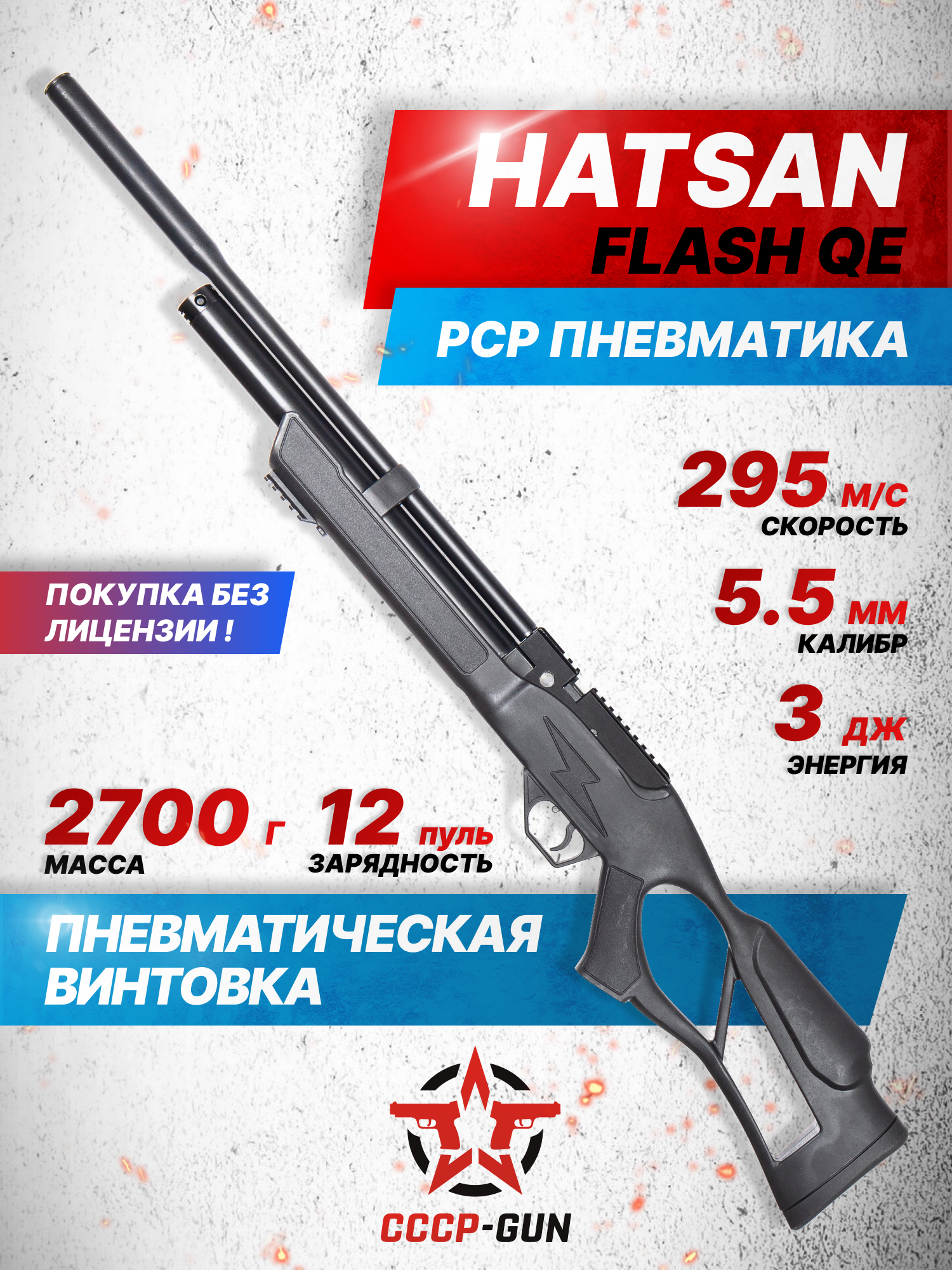 Усиленный вариант Хатсан Флеш QE 5 5 разгоняет пулю до скорости в 295 метров в секунду, однако в продажу поступают винтовки с дульной энергией в пределах 3 Джоулей. Такое правило обусловлено российским законодательством, и компания Hatsan, выпуская модели с такой мощностью, делает пневматику доступной для новых пользователей. Свободная форма приобретения обусловлена тем, что на подобного рода изделия не требуется специальная лицензия, которую надо получать в разрешительных органах.