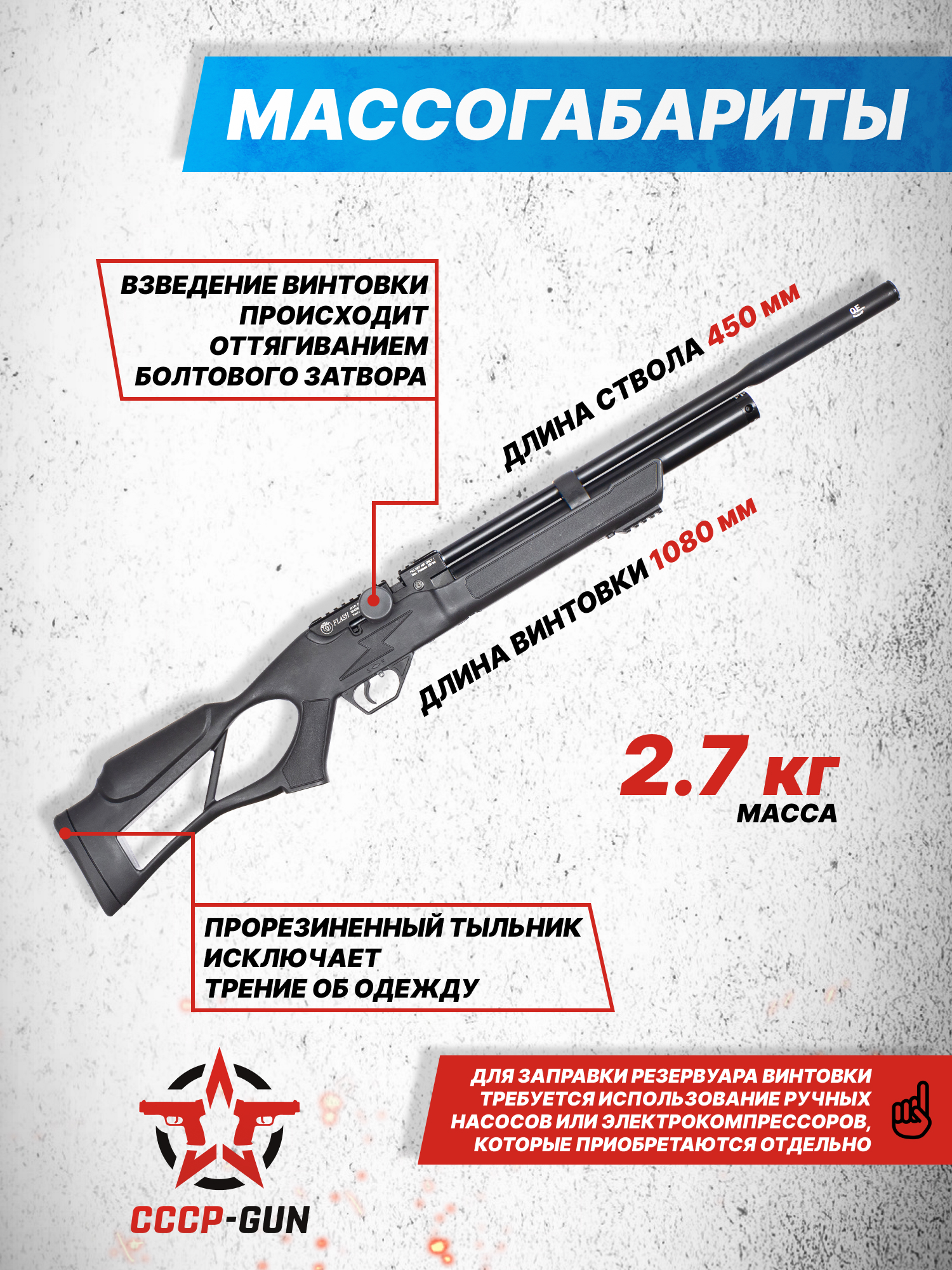 Для стрельбы используется энергия сжатого воздуха, который заправляется в специальный ресивер с помощью электро-компрессора. Объем трубчатого резервуара составляет 165 кубических сантиметров, а допустимое по паспорту давление не должно превышать 200 Бар. Таким образом, учитывая, что винтовка работает по принципу прямоточного механизма, на одной полной накачке стрелок сделает порядка 30-35 выстрелов.