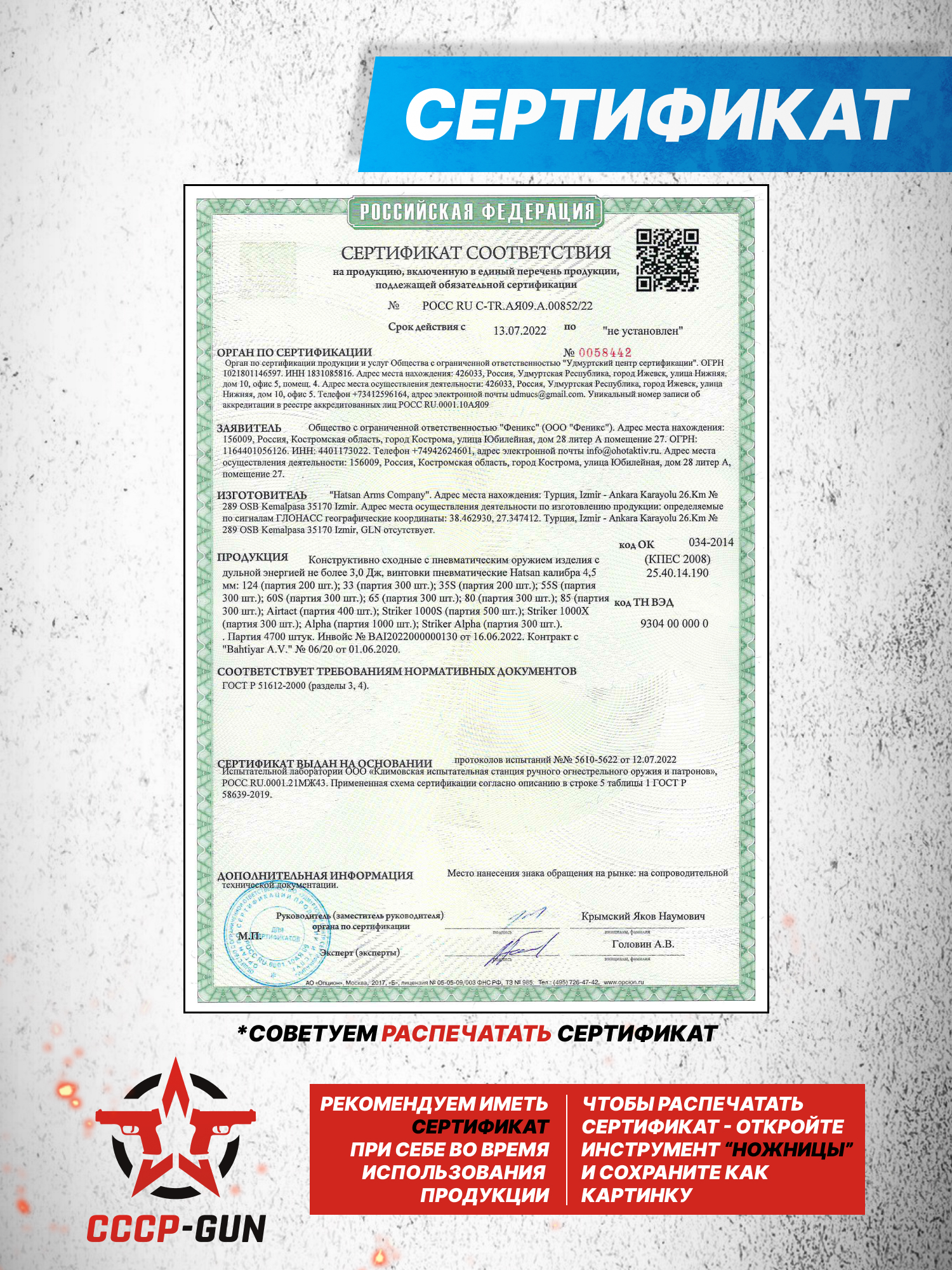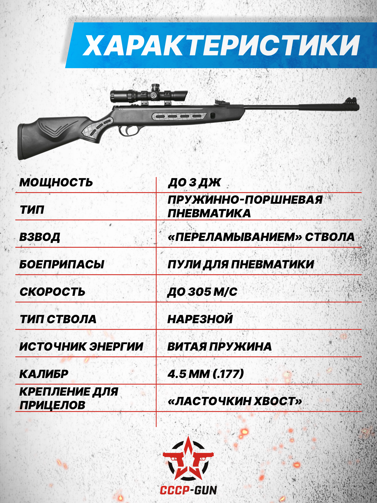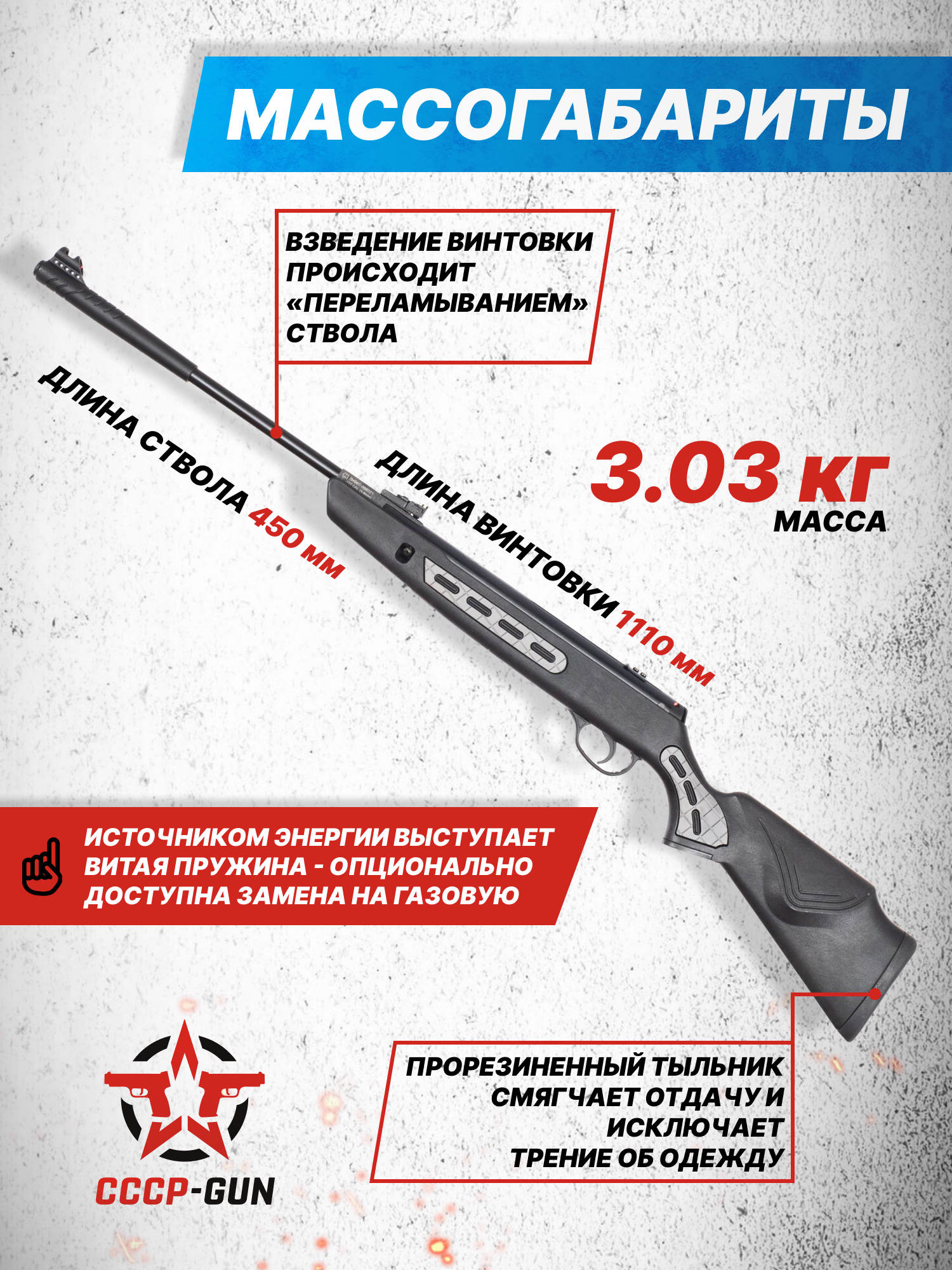 Внимание! Данная модель поставляется в разрешенной мощности для свободного приобретения на территории Российской Федерации. При этом в модели имеется возможность увеличения мощности путем замены части деталей или настройки конструкции, однако не стоит забывать о Федеральном законе «Об оружии» № 150 - ФЗ. В случае необходимости, опираясь на данный закон и руководствуясь им, возможно, потребуется получить разрешение от ЛЛР ГУ МВД России после вмешательства в конструкцию.