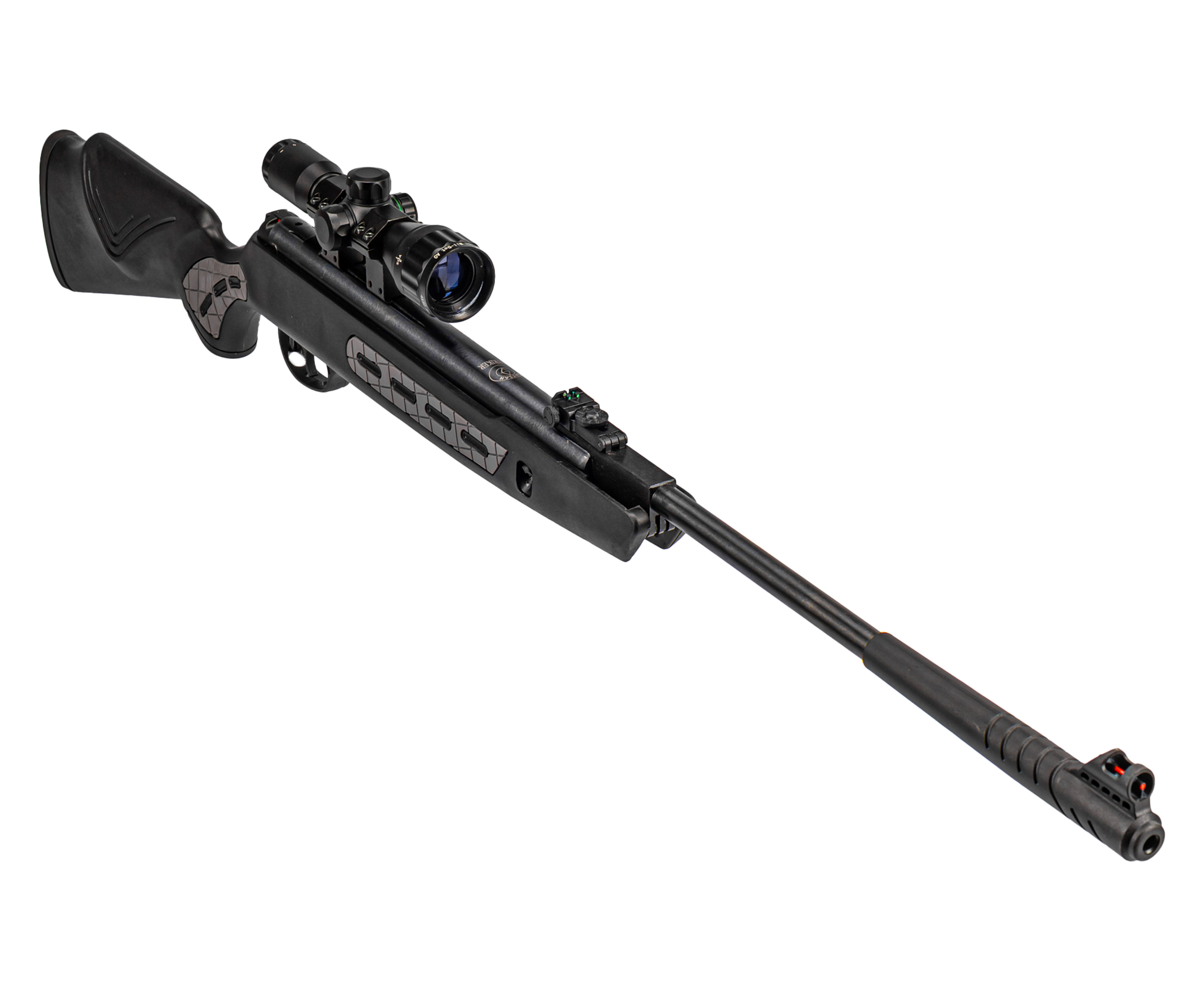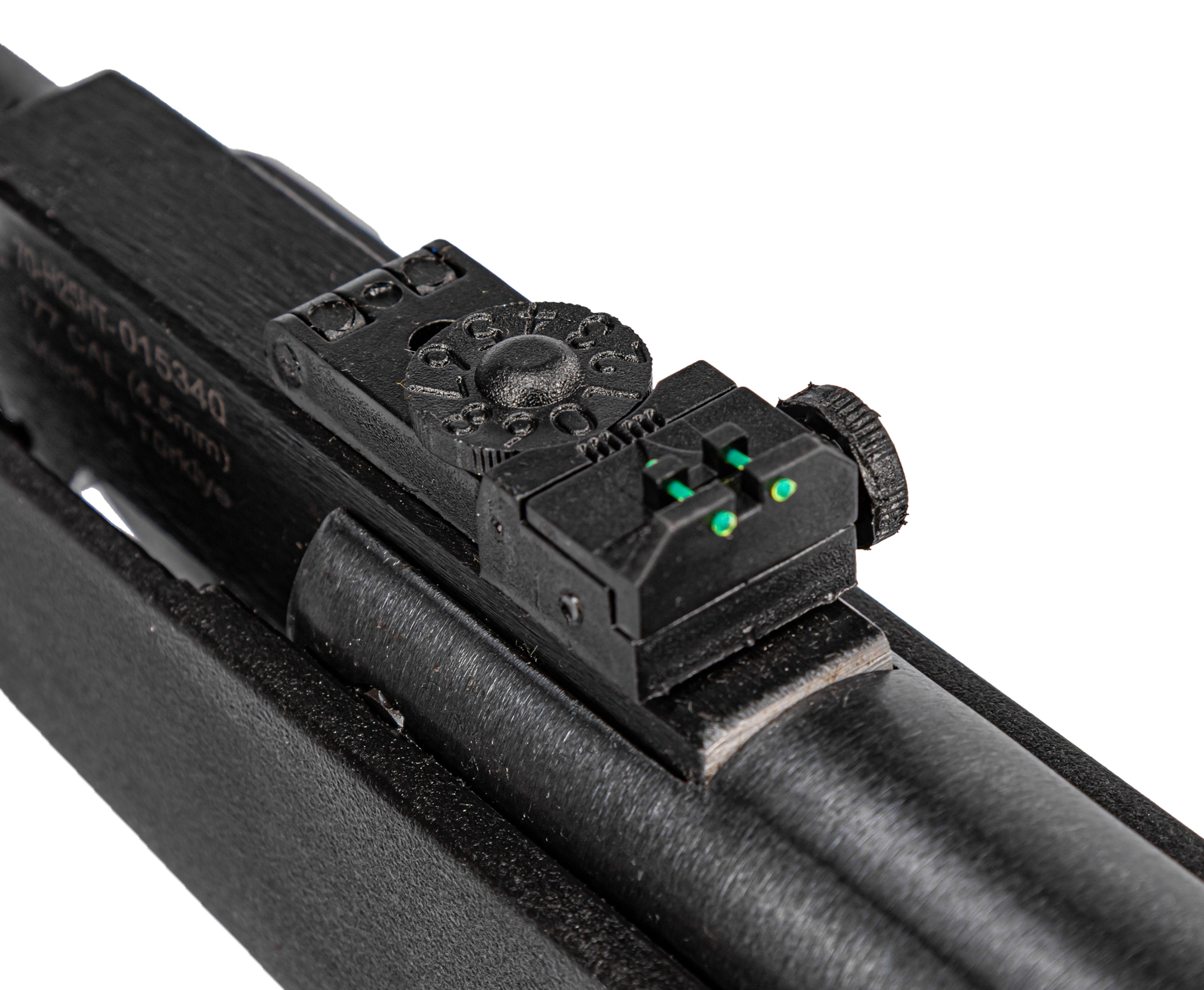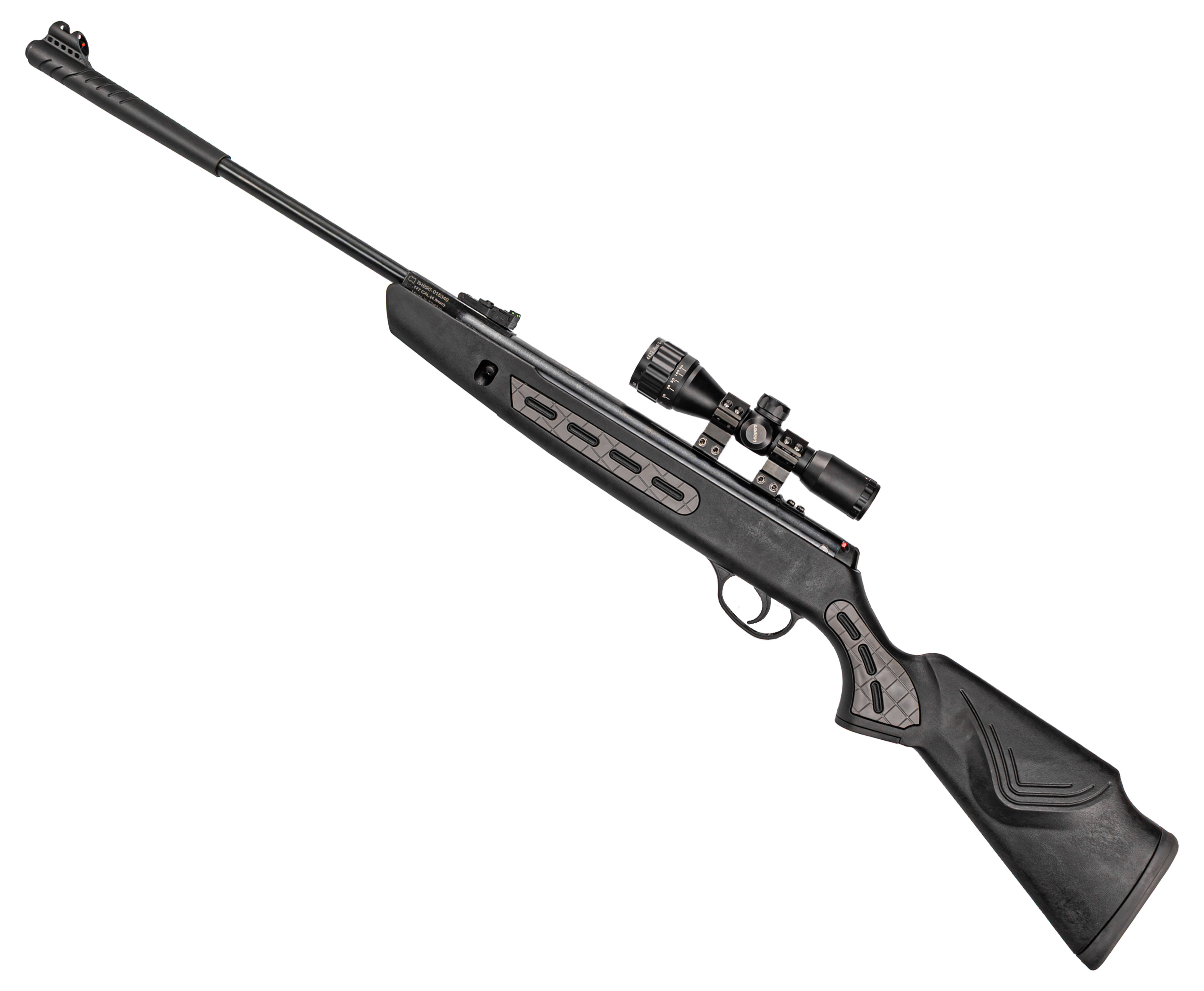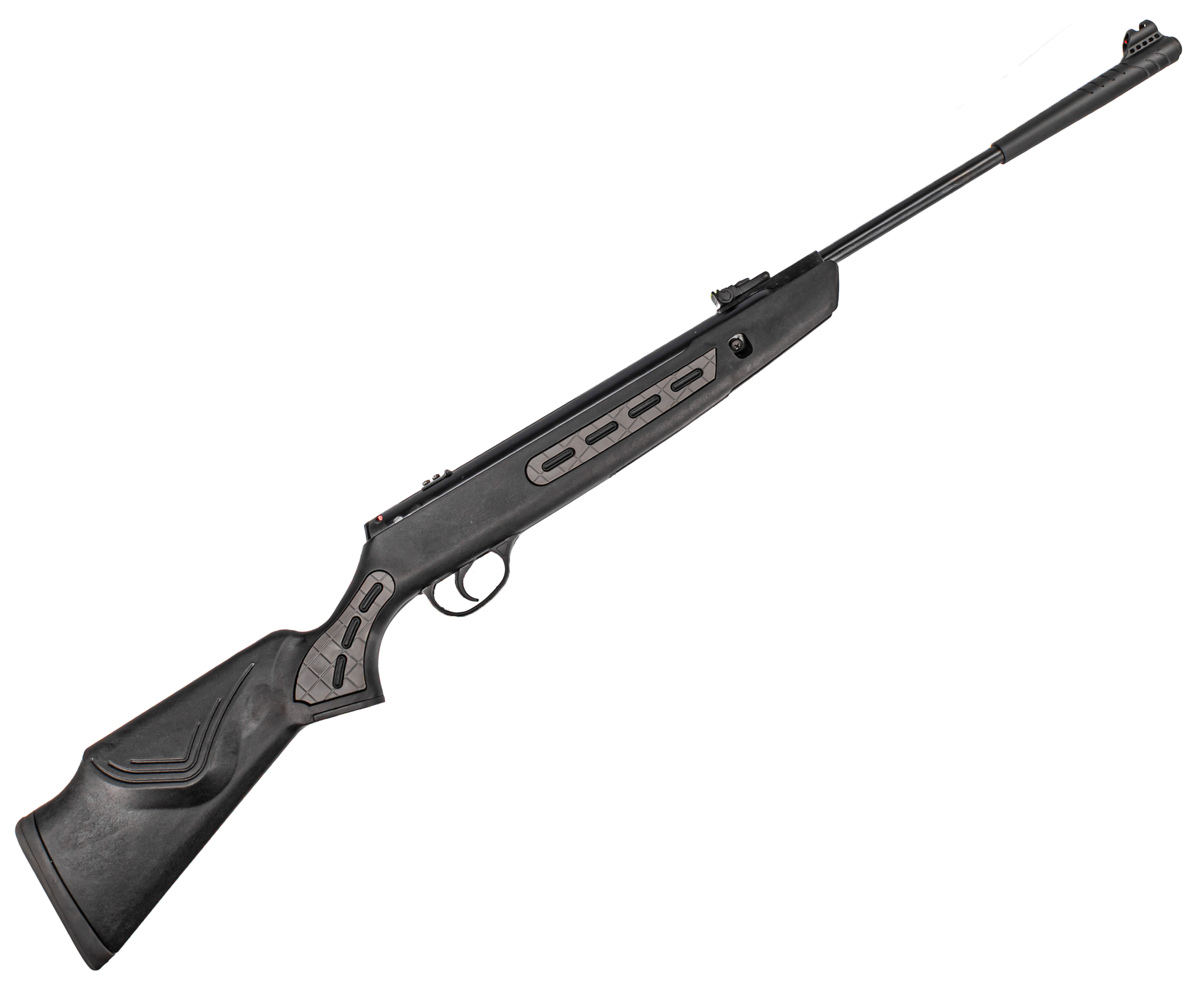 Винтовка использует свинцовые пули калибра 4.5 мм, а основой конструкции выступает стальной нарезной ствол длиной 450 мм. Такая геометрия придает уверенное вращение пуле в полете, увеличивая кучность.