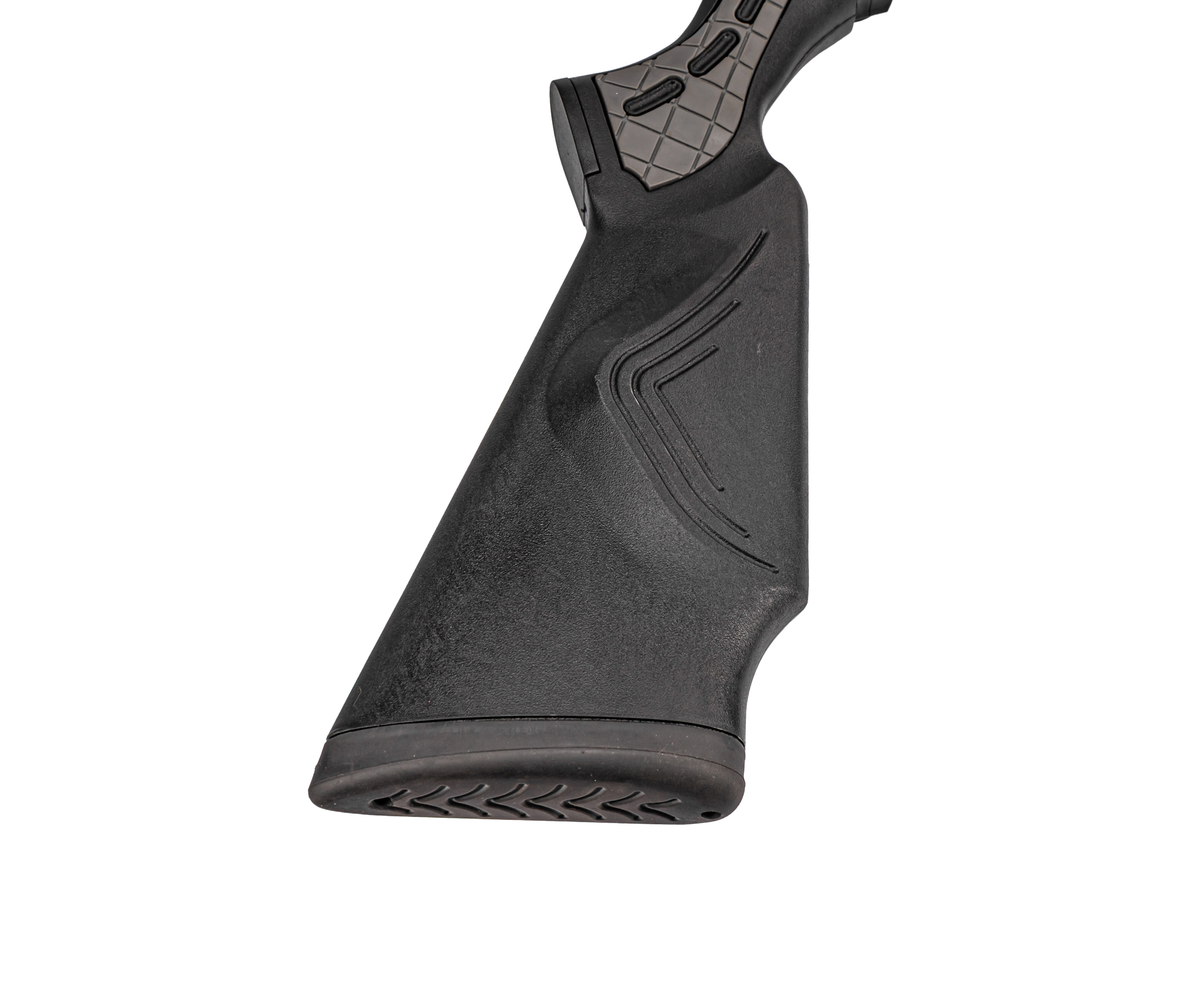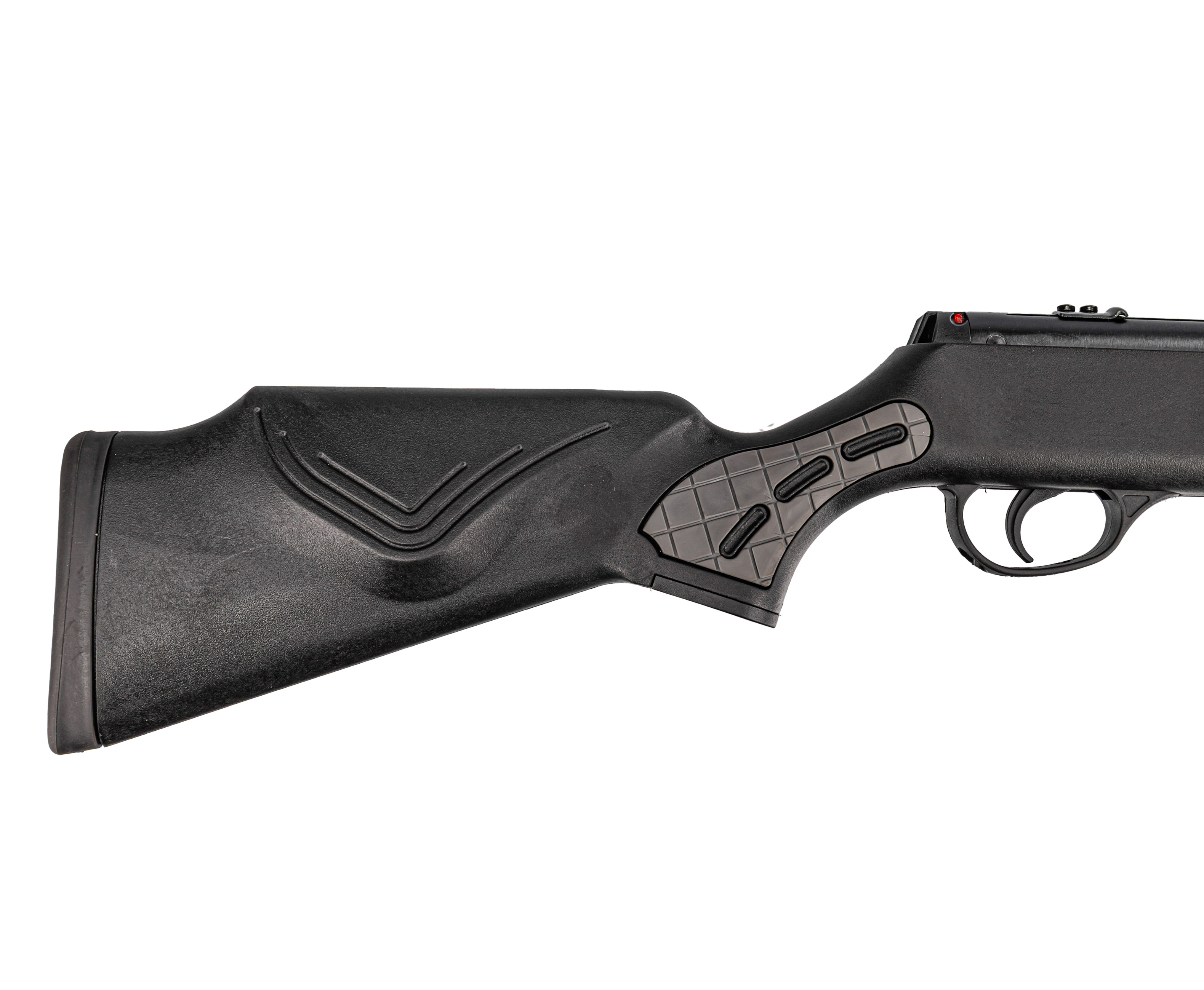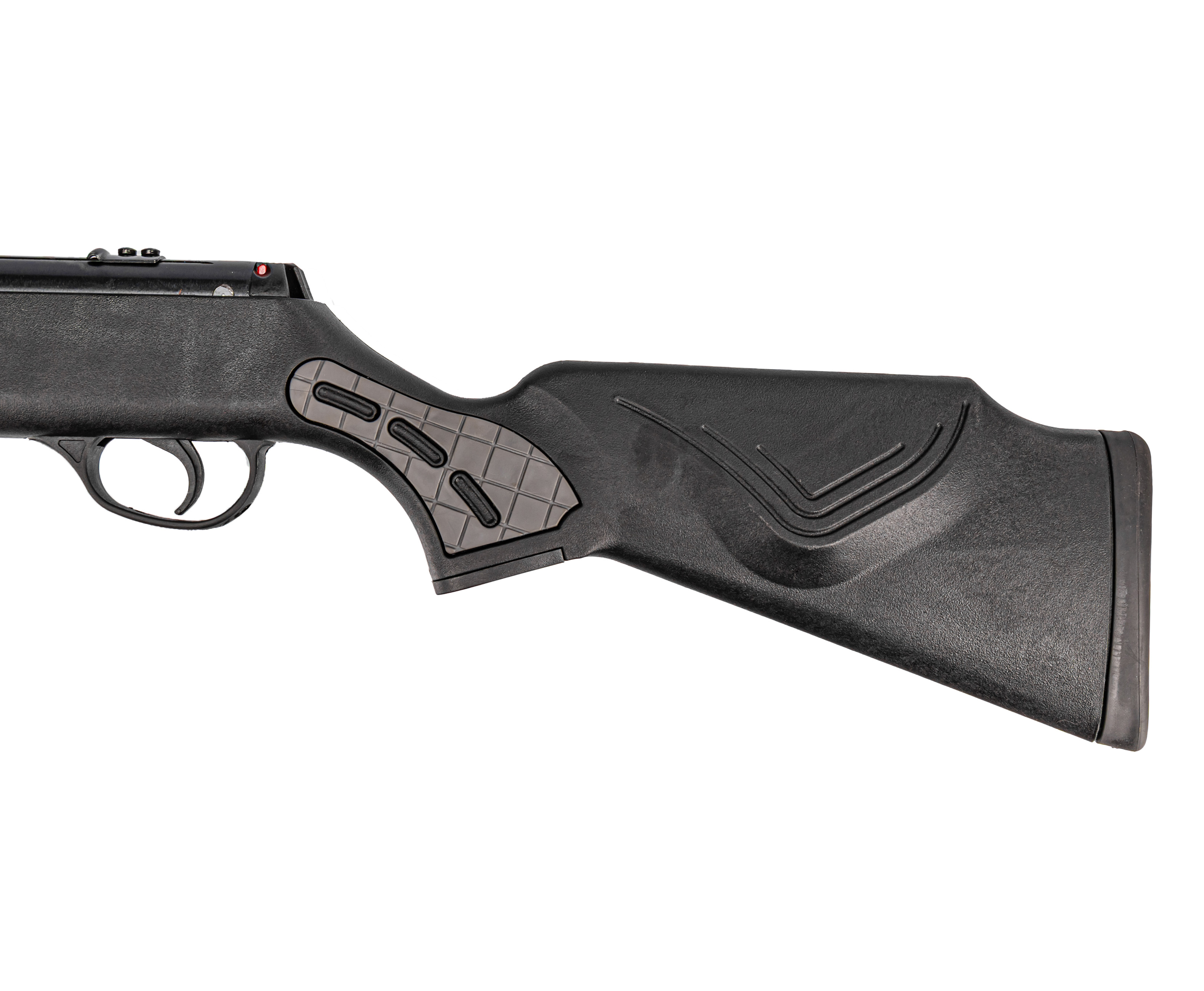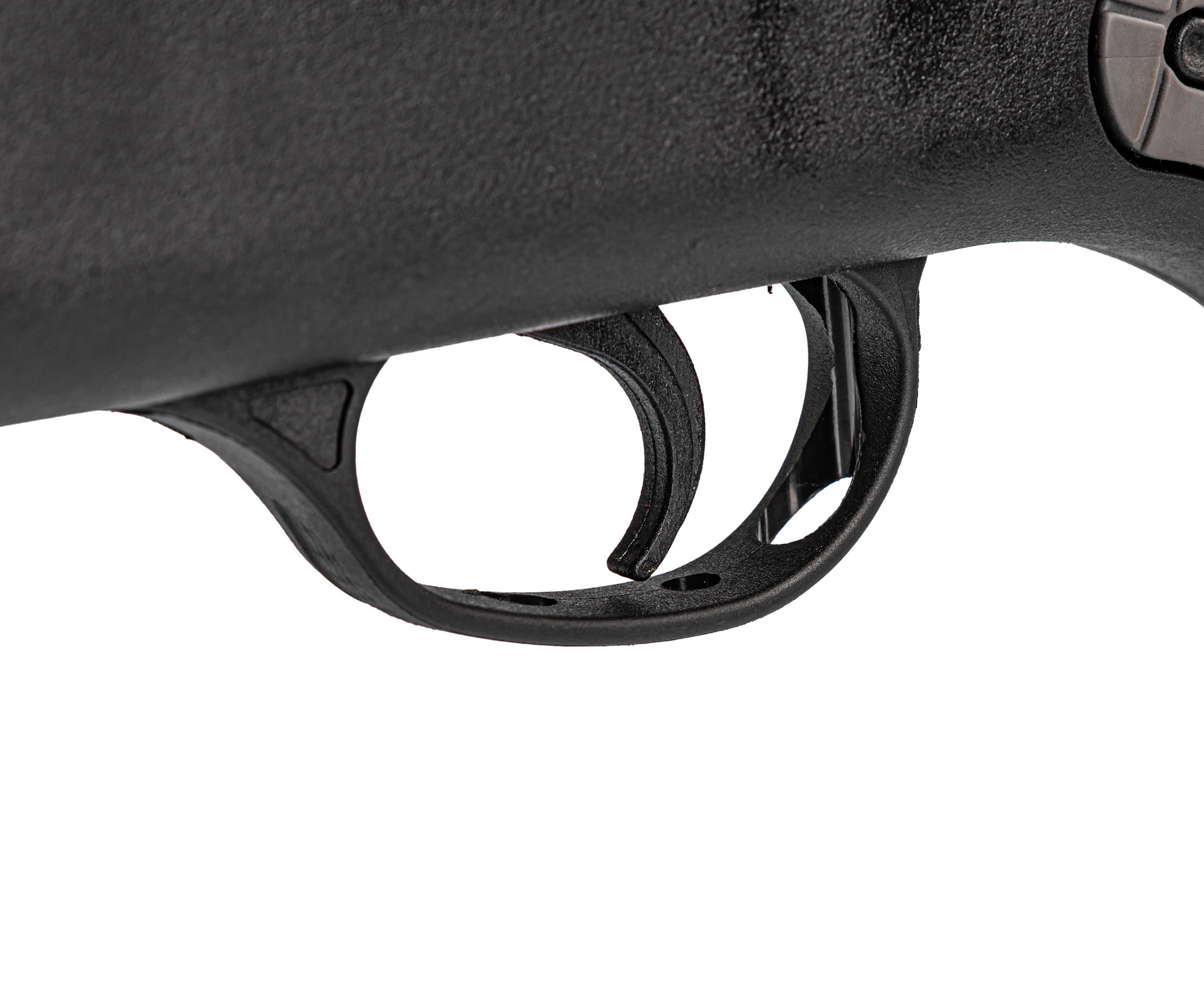 Ложе выполнено из полимера, снижающего массу и наделяющего винтовку устойчивостью к влаге и повреждениям. Для комфорта удержания на корпусе имеются серые вставки с текстурой, обещающие уверенный хват даже в перчатках. Продуманная геометрия приклада делает экземпляр одинаково удобным и для правшей, и для левшей.