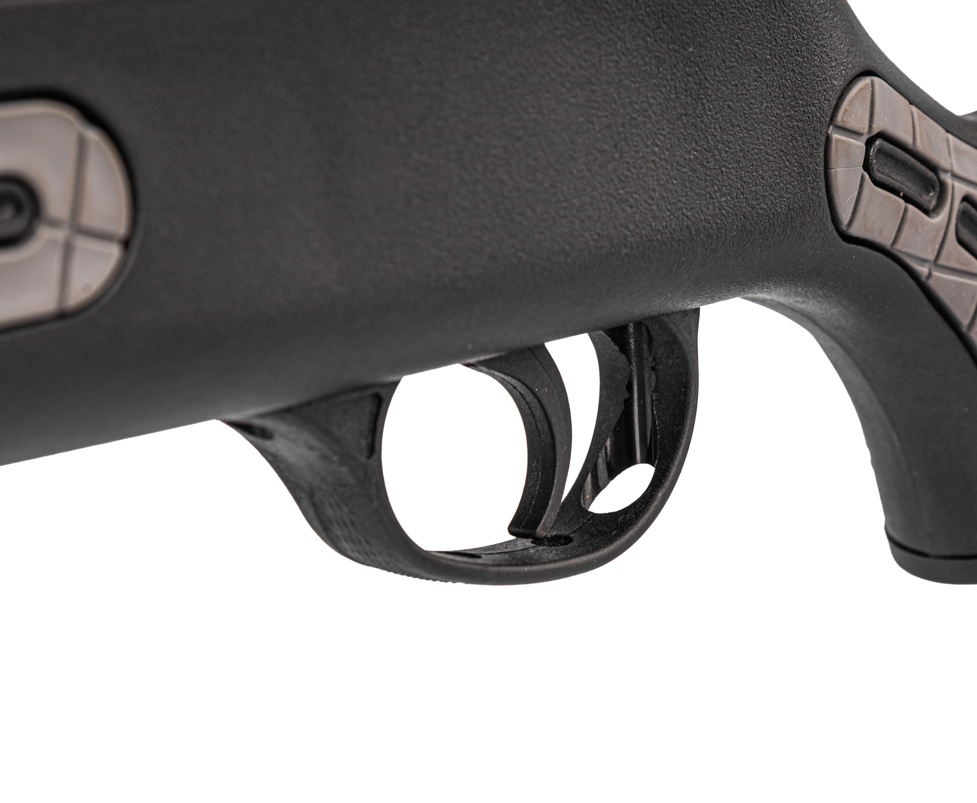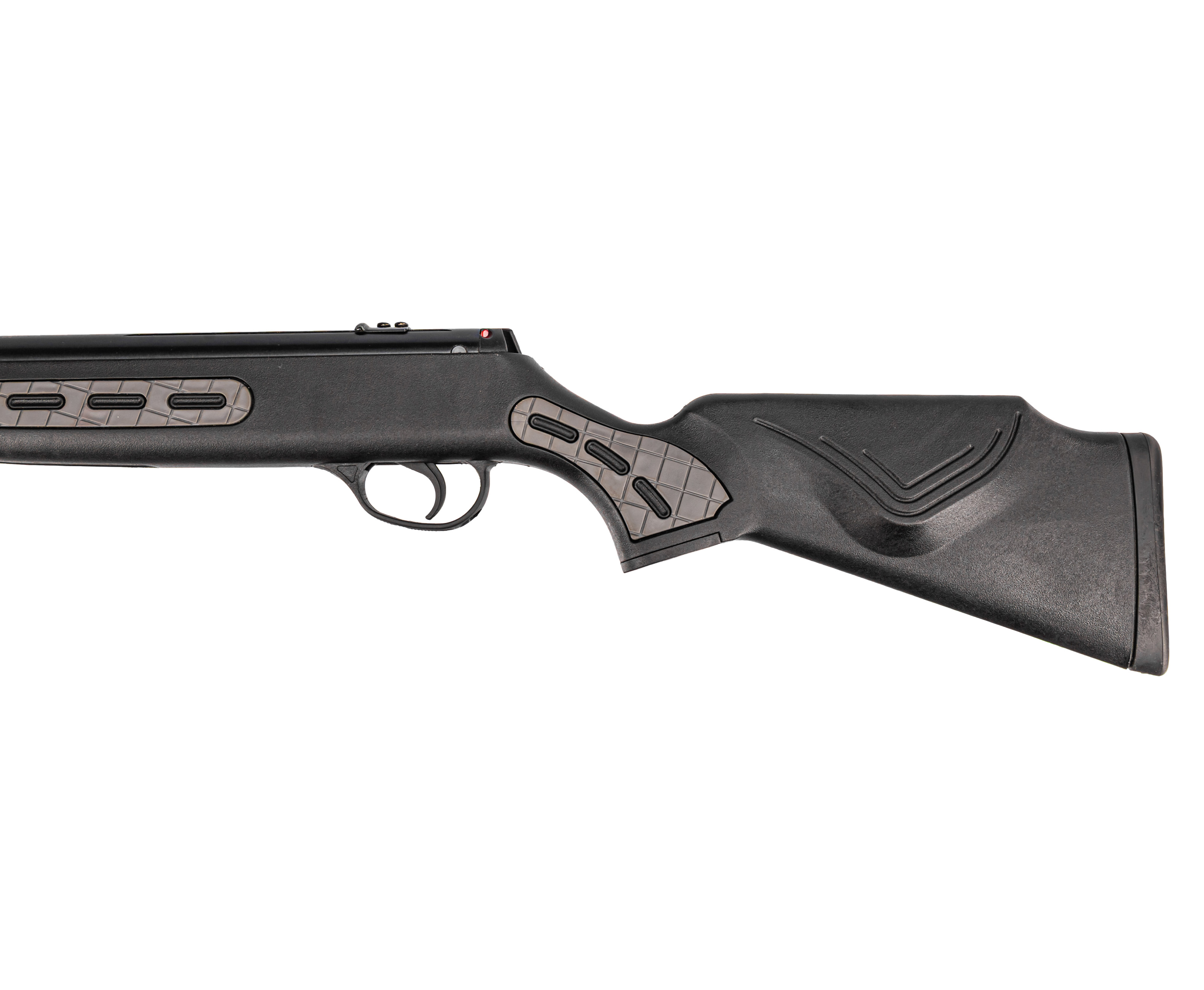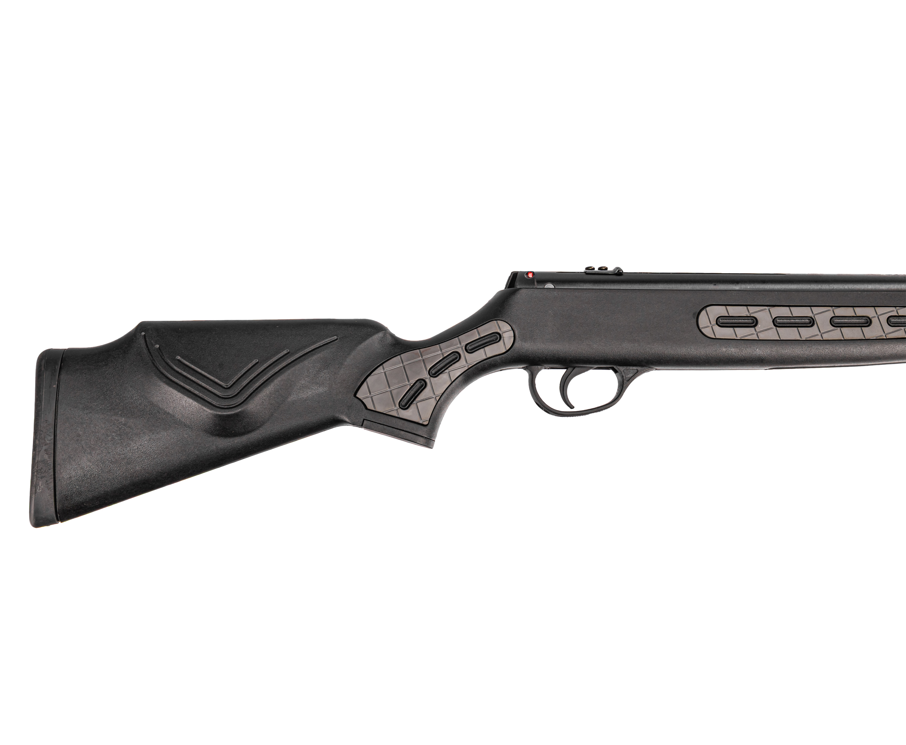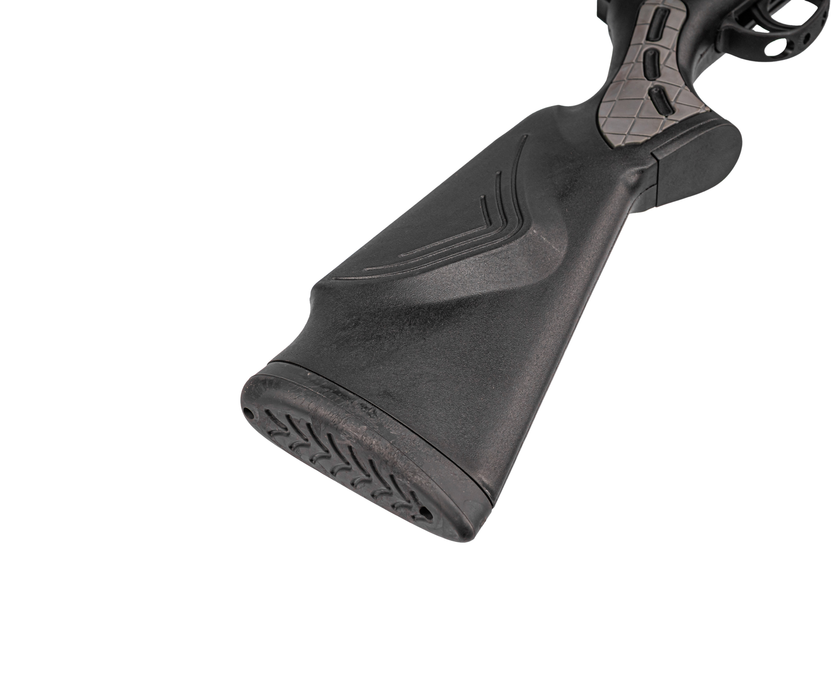 Серые текстурированные вставки в зонах хвата повышают сцепление и улучшают контроль над оружием во время стрельбы. На прикладе размещен тыльник из резины, который гасит остаточную отдачу и снижает утомляемость.