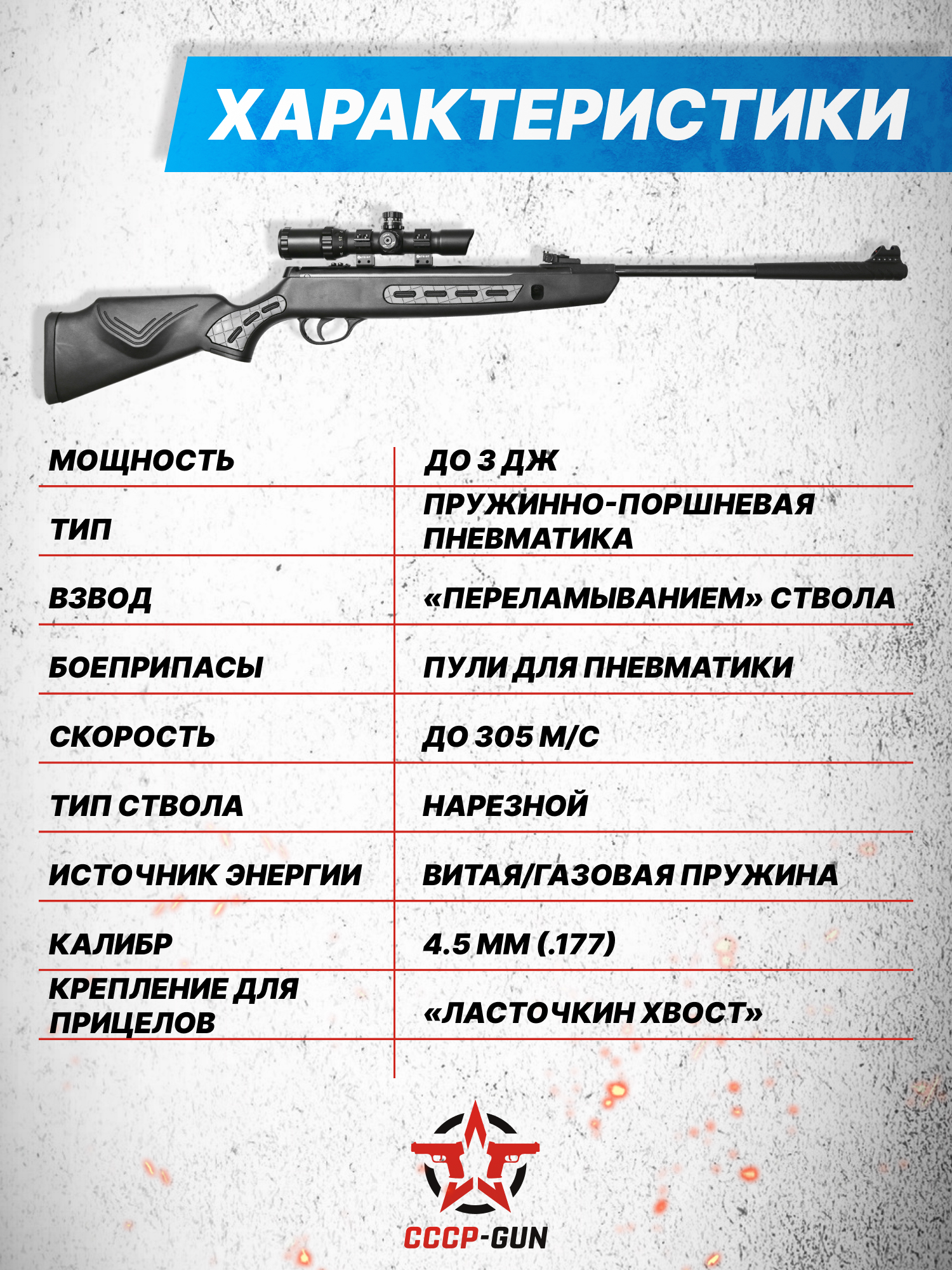 Мощность обозреваемой платформы не превышает показателя в 3 Джоуля, это позволяет приобрести и использовать модель без лицензии. После проведения модернизации винтовка способна разгонять боеприпасы калибра 4.5 мм до 305 метров в секунду. Таким образом, дистанция результативной стрельбы сильно увеличивается.