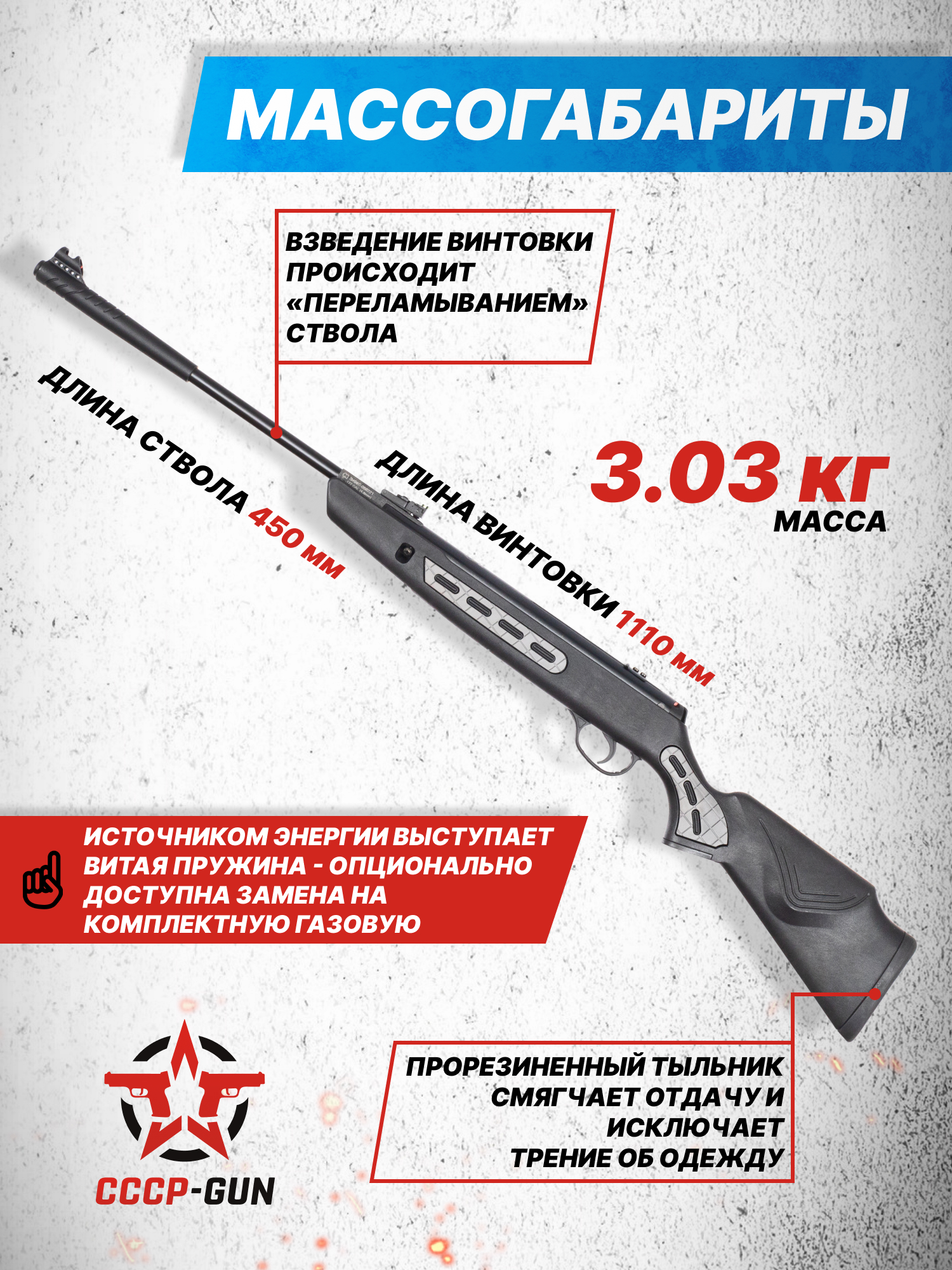 Длина винтовки составляет 1110 мм. Вес в 3.03 кг распределен нужным образом и обеспечивает хороший баланс при стрельбе с рук. В комплект включен чехол для транспортировки и хранения платформы.