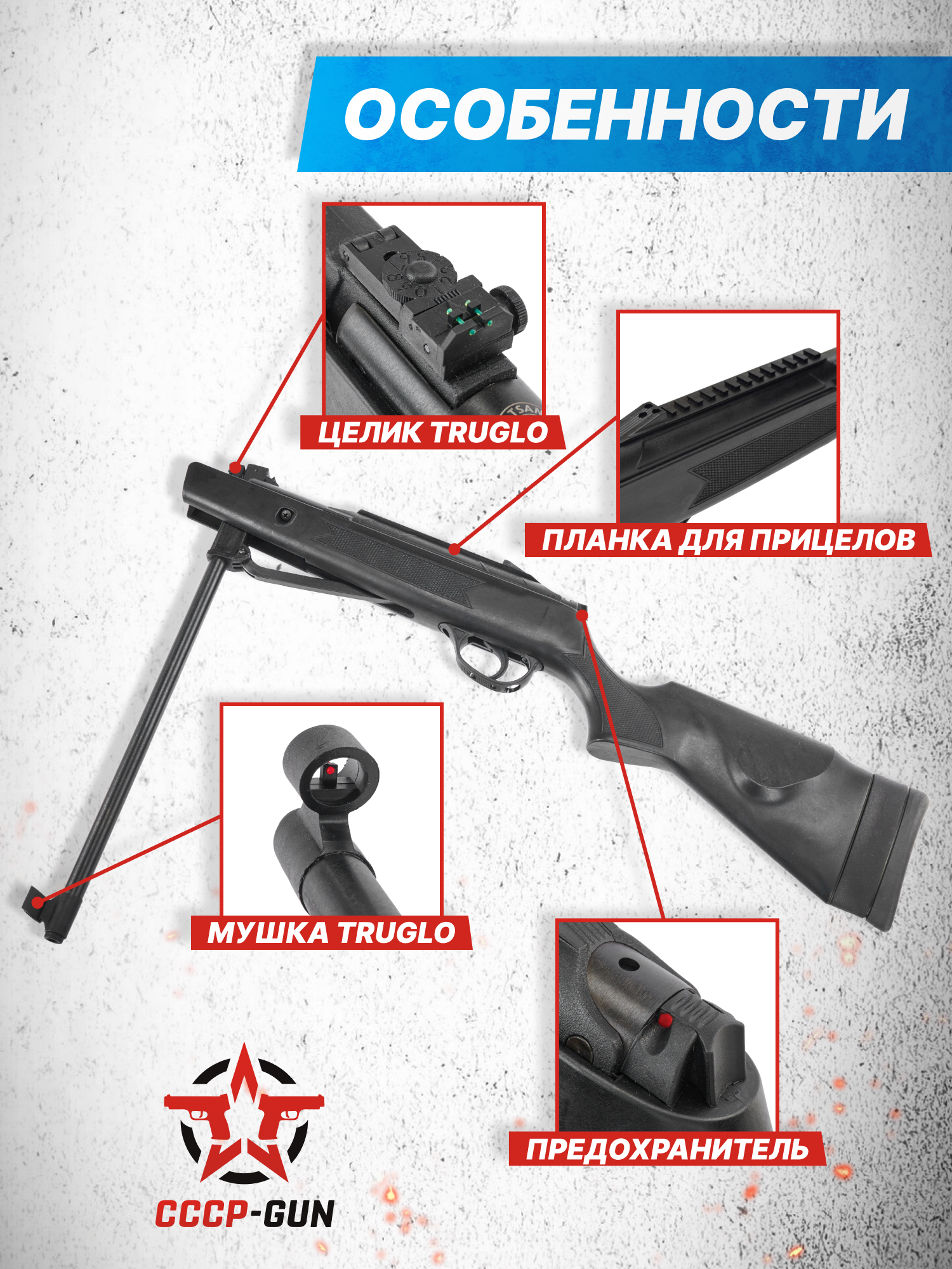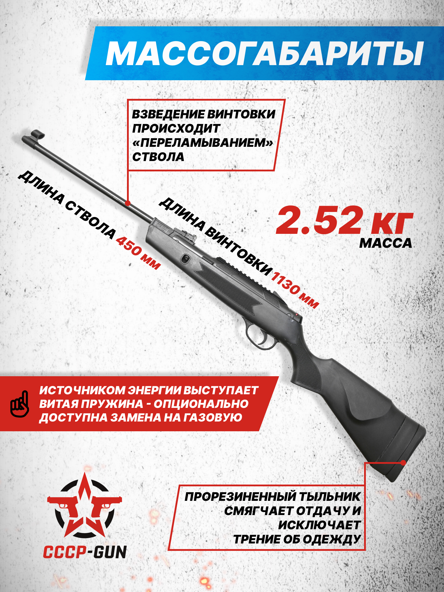 Ствол калибра 4.5 мм изготовлен из оружейной стали и составляет 450 мм. Благодаря нарезам вращающий момент стабилизирует полет пули, повышая точность и кучность даже на внушительных дистанциях. Конструкция позволяет применять свинцовые боеприпасы - от легких плоских снарядов до утяжеленных вариантов.