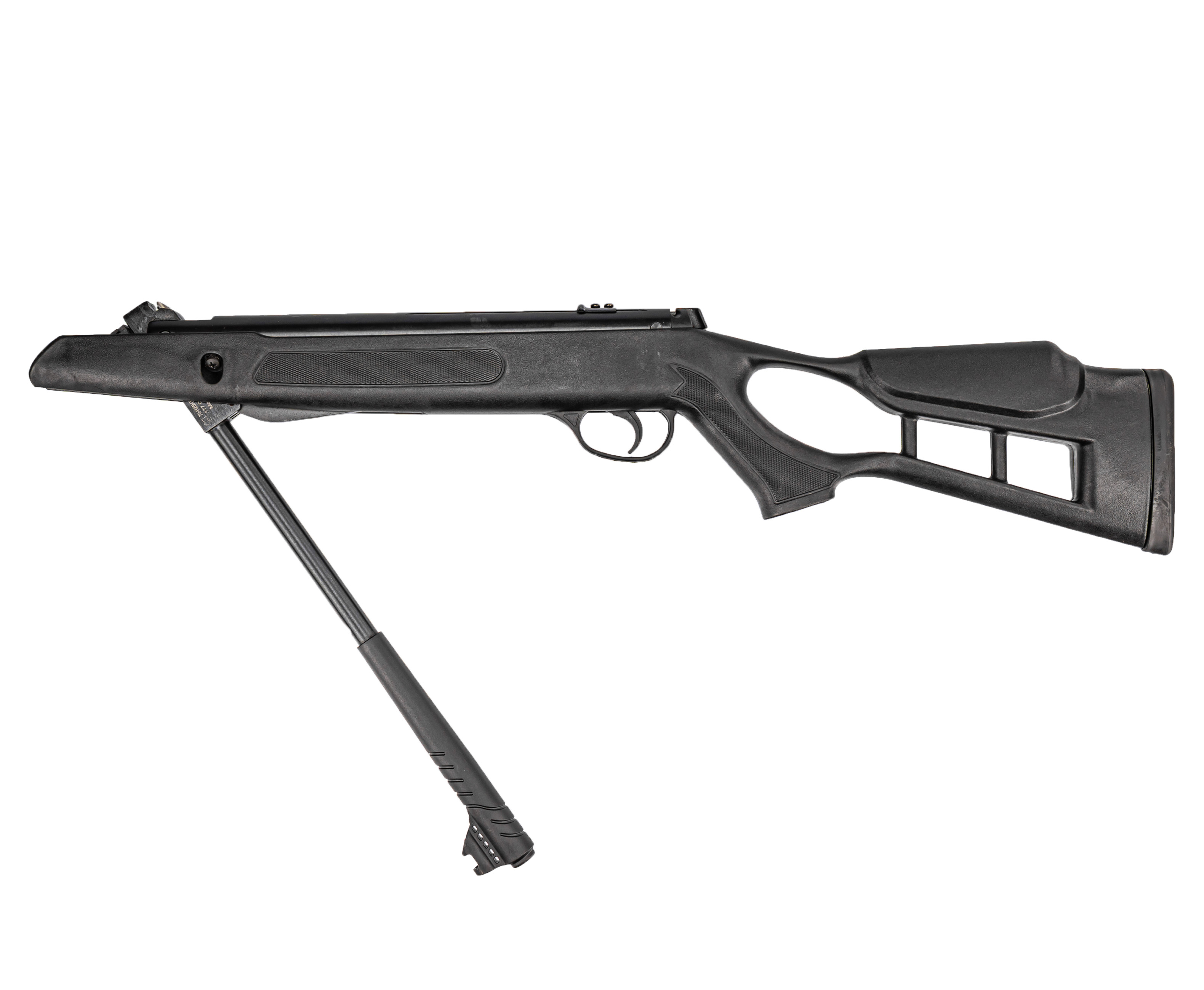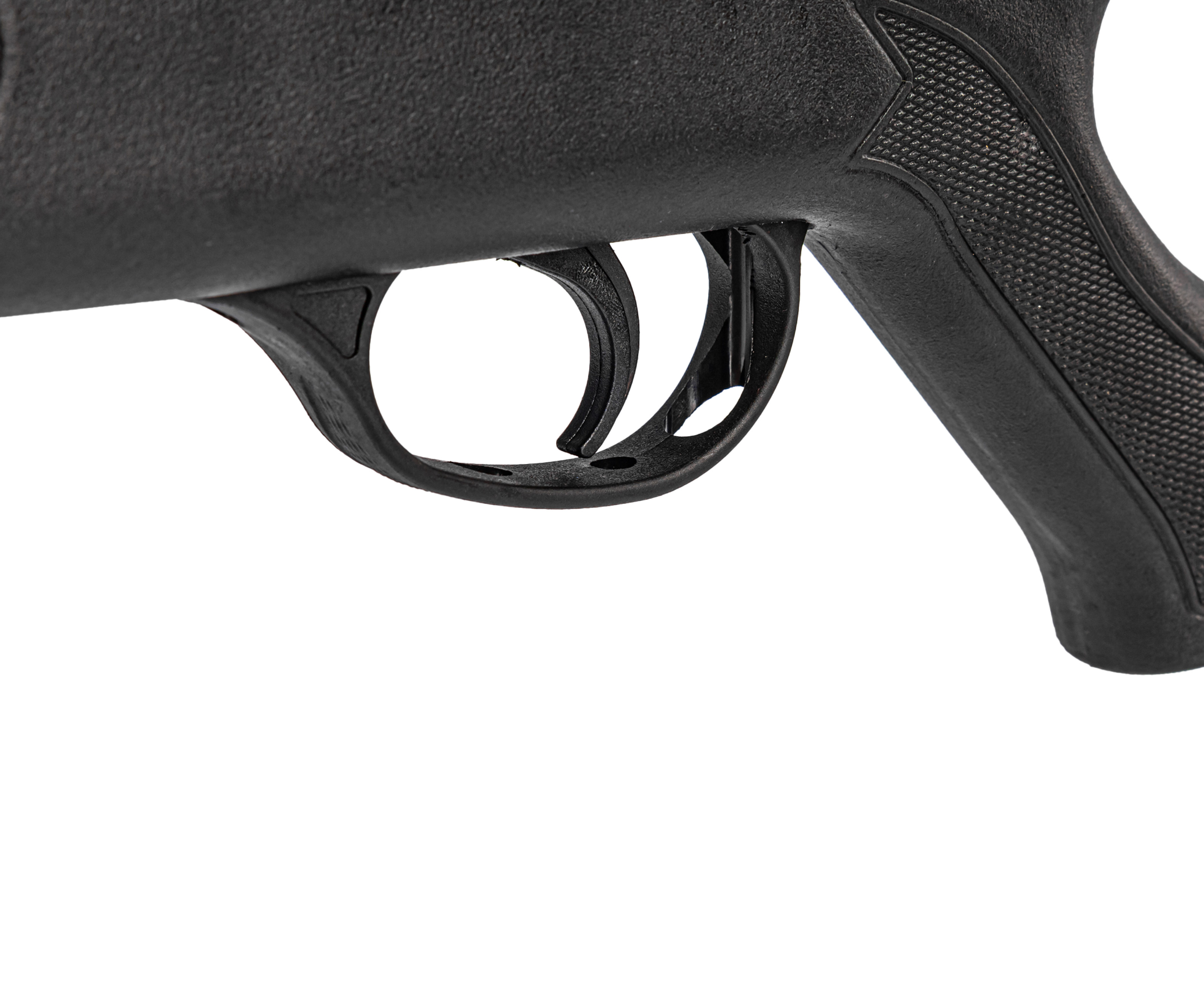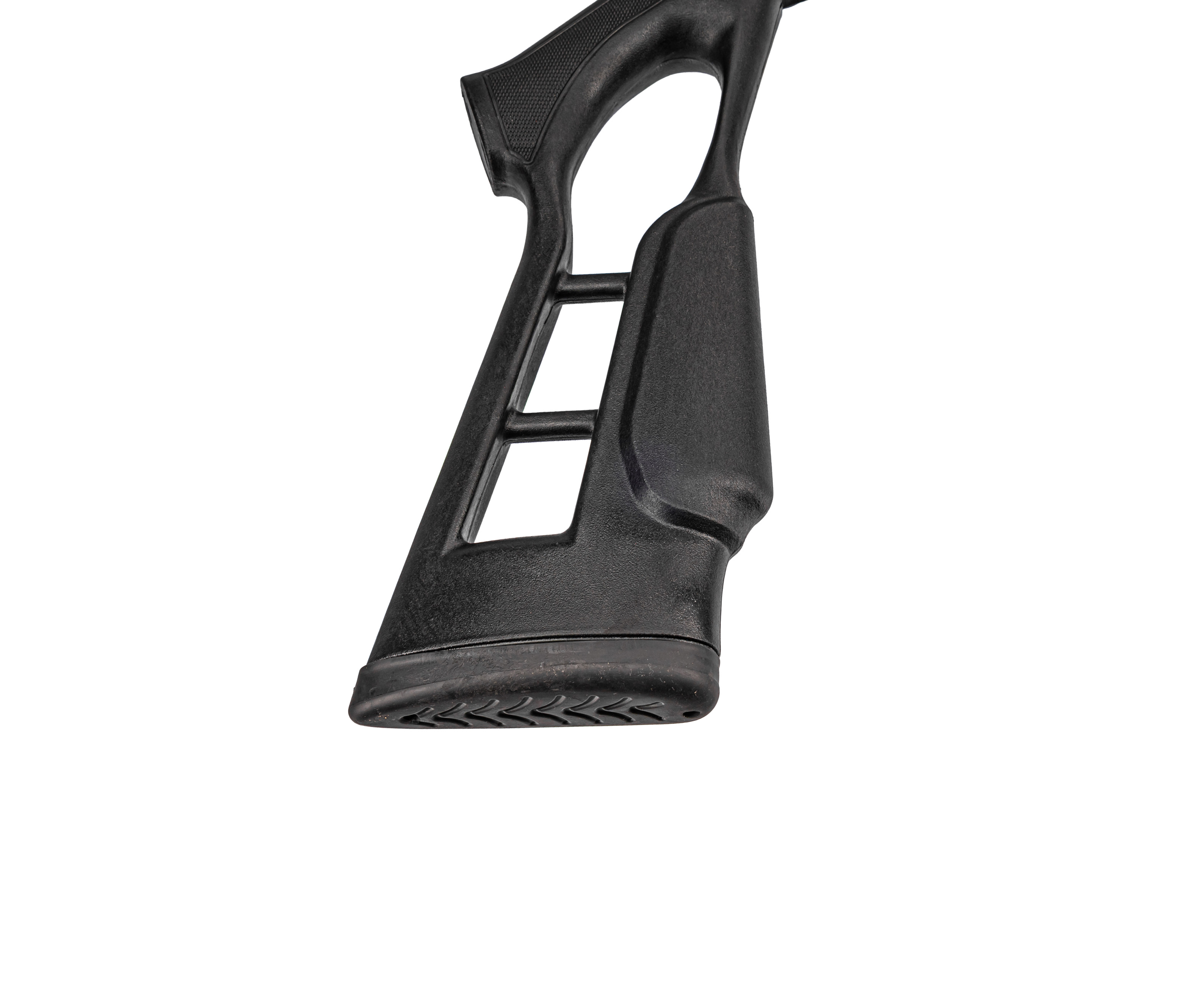 Пневматика Хатсан Страйкер Эйдж предусматривает облегченный приклад с прорезиненным тыльником - такой компонент эффективно демпфирует импульс отдачи, передаваемый на корпус стрелка, обеспечивая комфорт даже при продолжительной стрельбе сериями. Ложа образца изготовлена из черного полимерного материала - вес изделия составил 3 килограмма.