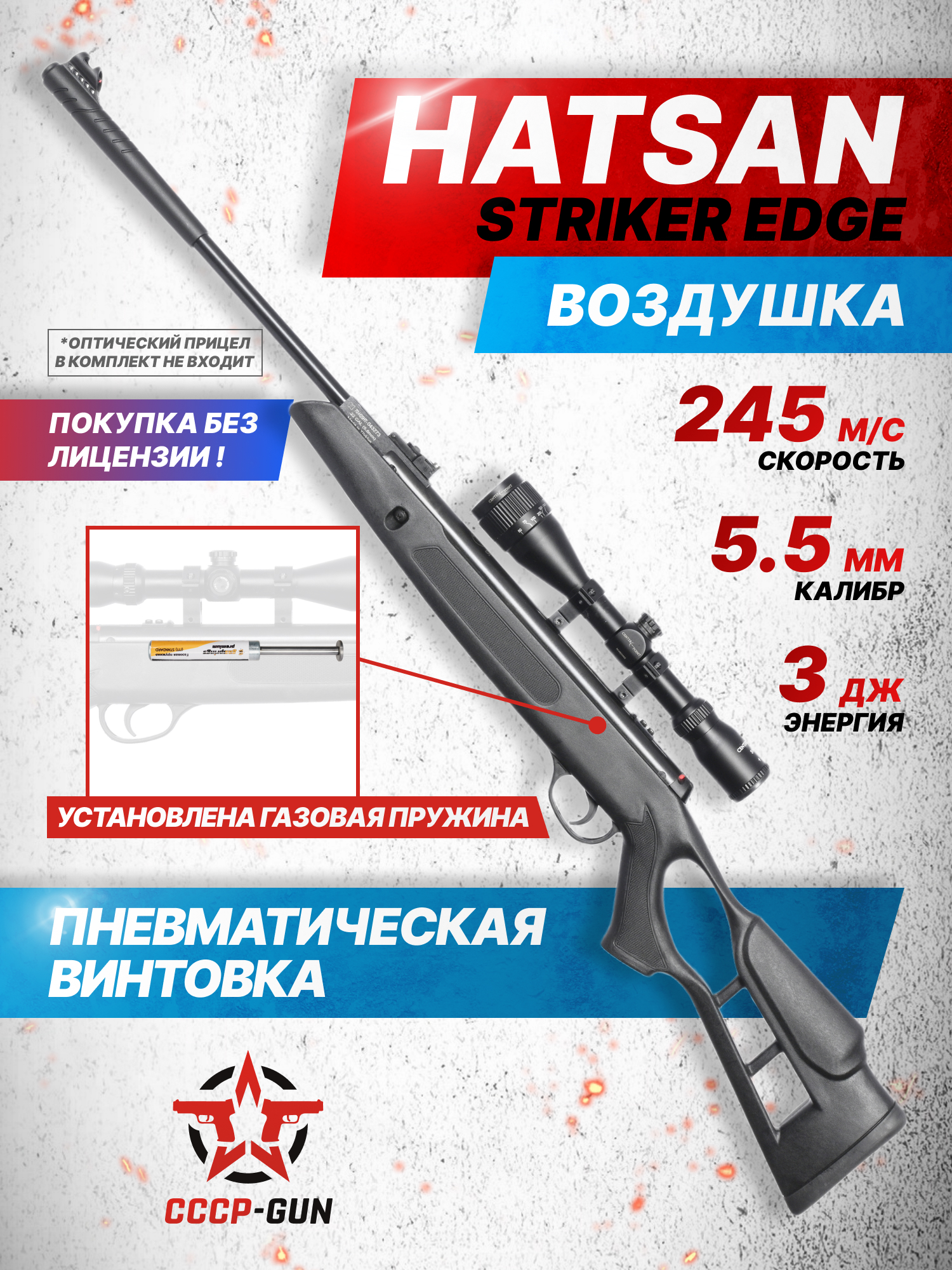 Указывается, что рассматриваемая пневматическая винтовка Hatsan 5 5 мм Striker Edge способна демонстрировать скорость полета снаряда до 245 метров в секунду. Однако важно указать, что образцы этой серии поставляются на российский рынок с ограничением до 3 Джоулей для соответствия нормативным требованиям и сохранения возможности беспрепятственного приобретения - следовательно, покупка допускается без лицензии для совершеннолетних граждан.