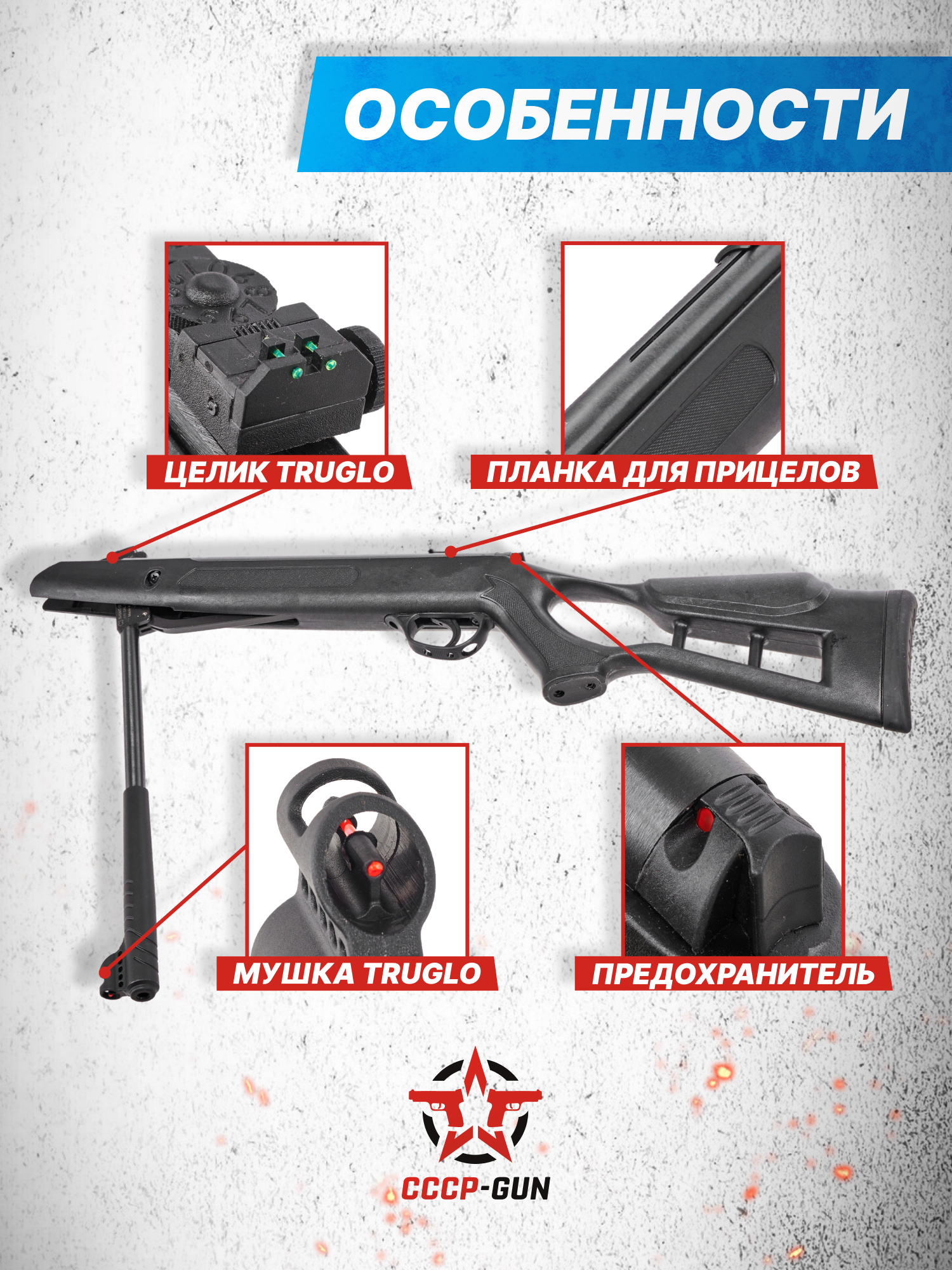 Особого акцента заслуживает внешнее оформление изделия - выделяется анатомический приклад с подщечником и амортизирующим резиновым тыльником. Кроме того, предусмотрена эргономичная рукоять с текстурированной поверхностью от скольжения ладони пользователя. Предохранитель модели автоматически активируется при взведении, исключая непреднамеренный выстрел - элемент для его снятия размещается в зоне доступа большого пальца на задней части ствольной коробки