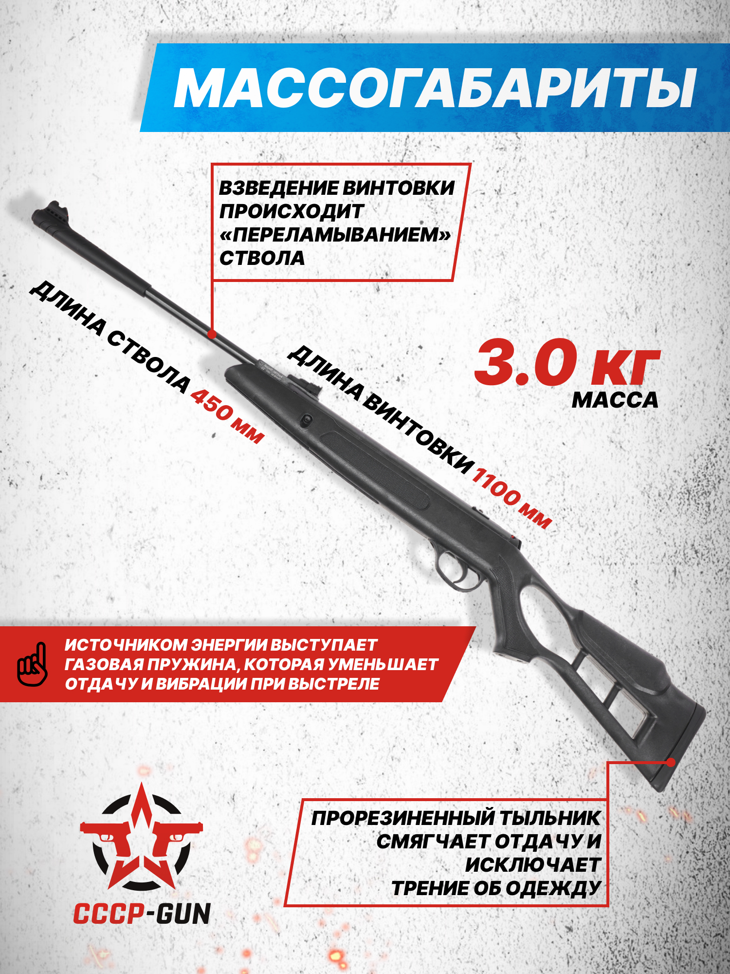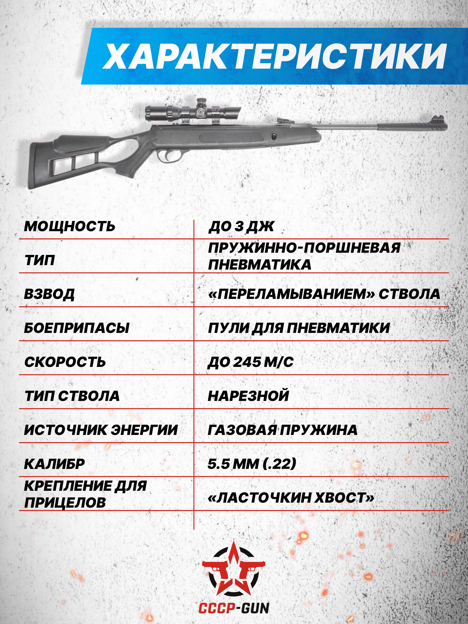 Внимание! Данная модель поставляется в разрешенной мощности для свободного приобретения на территории Российской Федерации. При этом в модели имеется возможность увеличения мощности путем замены части деталей или настройки конструкции, однако не стоит забывать о Федеральном законе «Об оружии» № 150 - ФЗ. В случае необходимости, опираясь на данный закон и руководствуясь им, возможно, потребуется получить разрешение от ЛЛР ГУ МВД России после вмешательства в конструкцию.