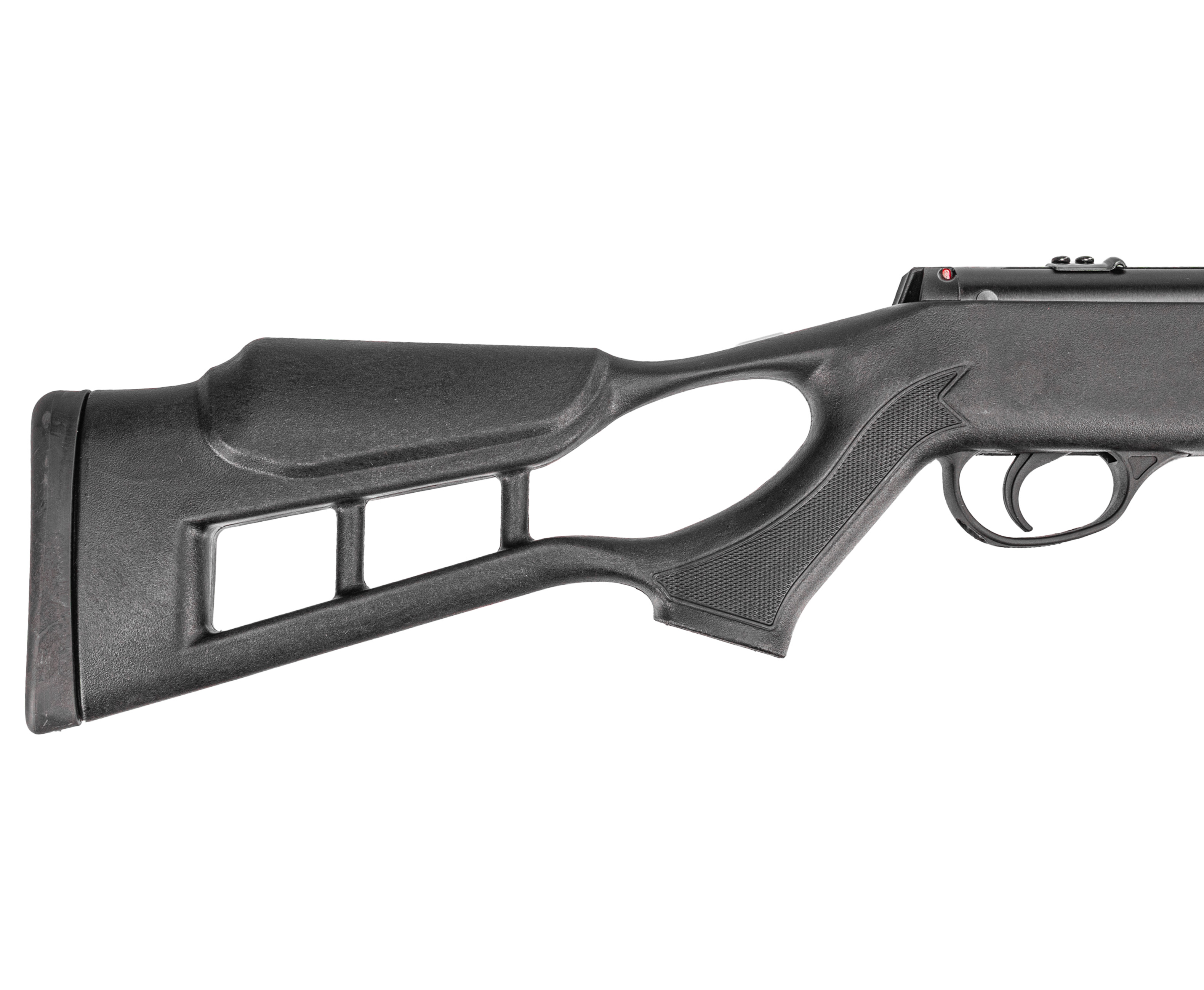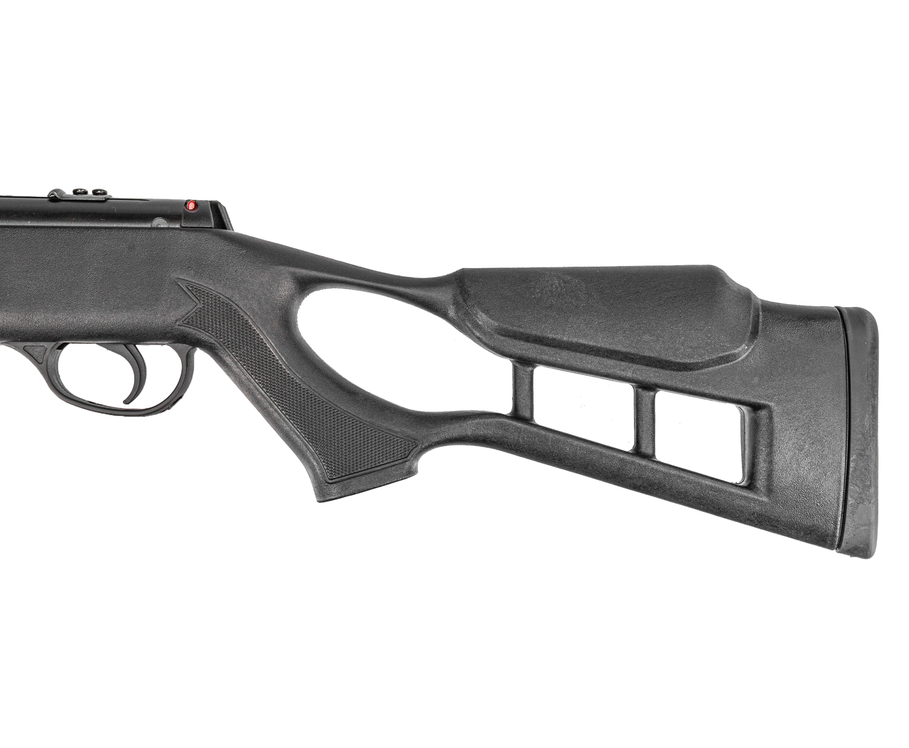 Ложе Страйкер Эйдж 5.5 мм выполнено из черного ударопрочного пластика, не подверженного деформации при контакте с влагой. Приклад оборудован щекой с обеих сторон, благодаря чему винтовка подходит как для правшей, так и для левшей. Отдельного внимания заслуживают три сквозных выреза в прикладе, снижающие вес и усиливающие эргономику конструкции.