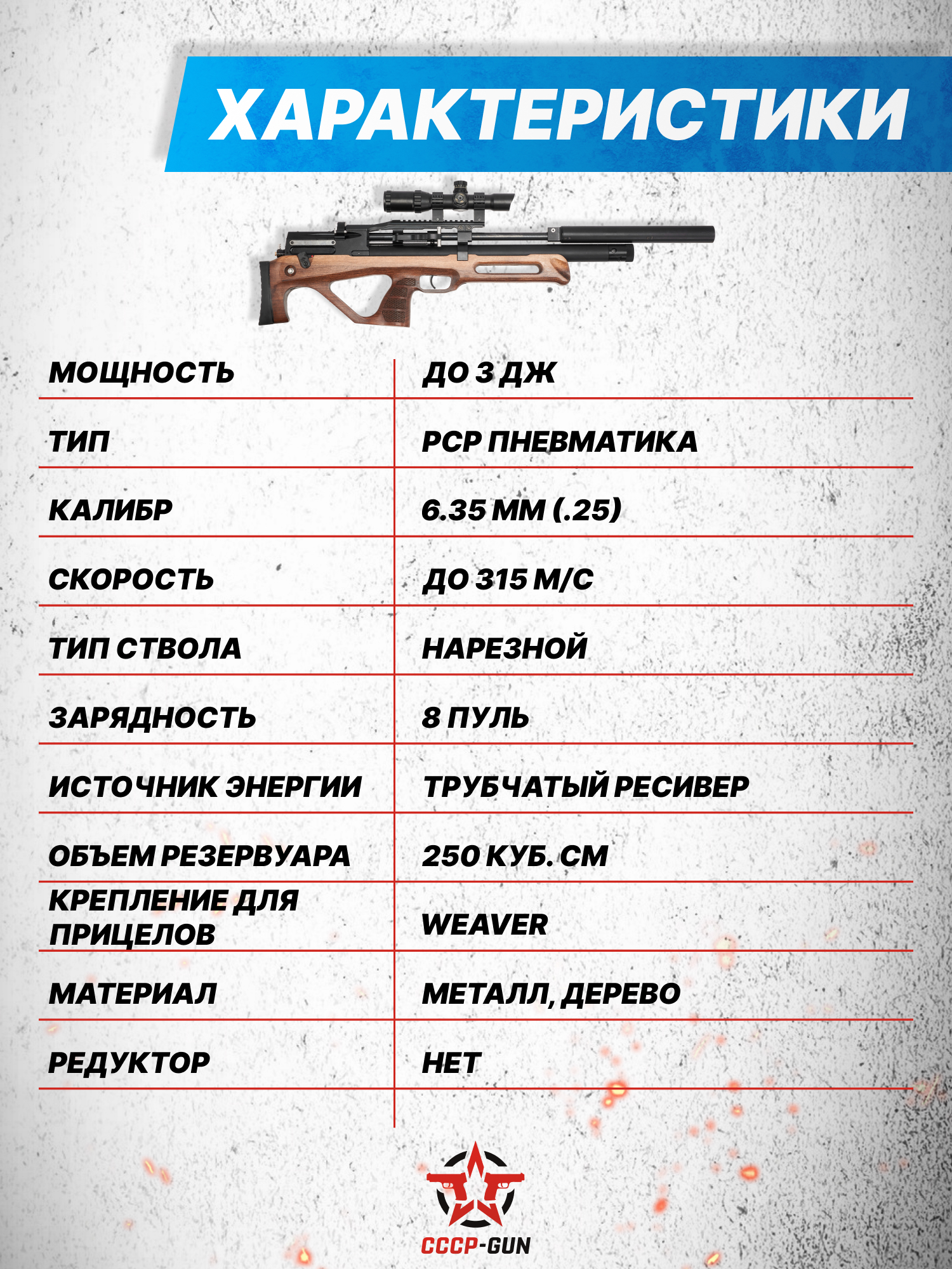 Модель построена на базе линейного резервуара высокого давления, благодаря чему для нее характерна сбалансированная развесовка. Размер полезного объема в ресивере составляет 250 кубич. сантиметров - винтовка действует в прямоточном режиме. Узел рассчитан на работу при давлении до 300 Бар и при этом у него остается многократный запас прочности.