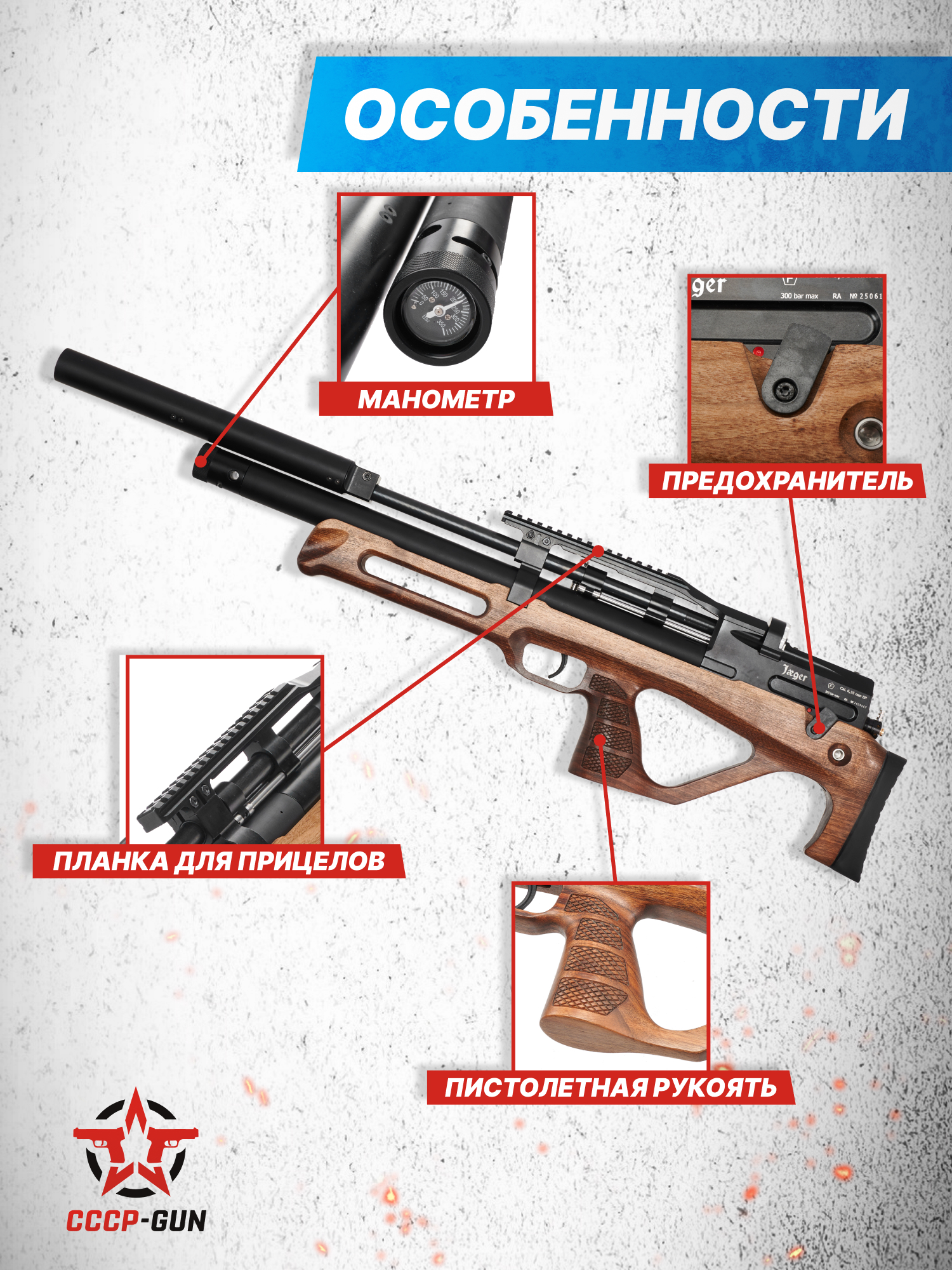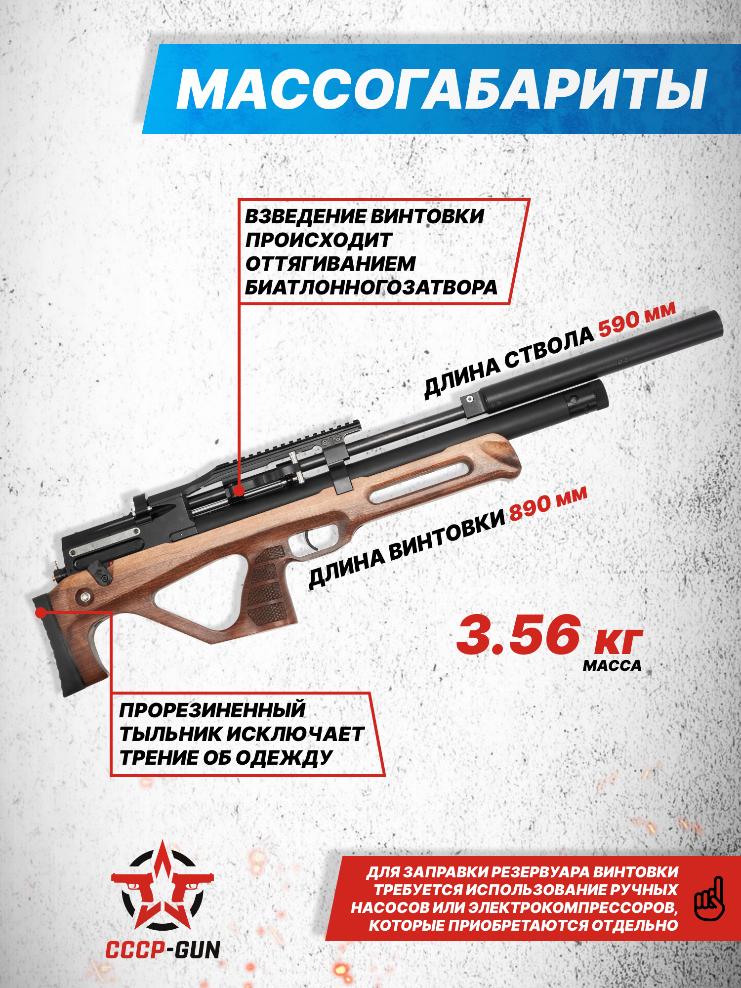 В этом случае пневматика представлена в форм-факторе Булл-пап - переработка компоновки помогла уменьшить длину оружия до 890 мм, причем это не повредило размеру ствола. Бланк винтовки имеет габарит 590 мм, соответственно это изделие получилось комфортнее модификаций в виде карабина, при этом не уступая им в характеристиках - такое изделие проще хранить и переносить.