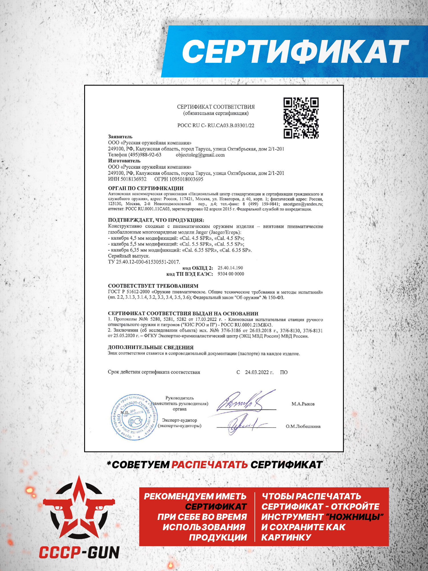 Внимание! Данная модель поставляется в разрешенной мощности для свободного приобретения на территории Российской Федерации. При этом в модели имеется возможность увеличения мощности путем замены части деталей или настройки конструкции, однако не стоит забывать о Федеральном законе «Об оружии» № 150 - ФЗ. В случае необходимости, опираясь на данный закон и руководствуясь им, возможно, потребуется получить разрешение от ЛЛР ГУ МВД России после вмешательства в конструкцию.