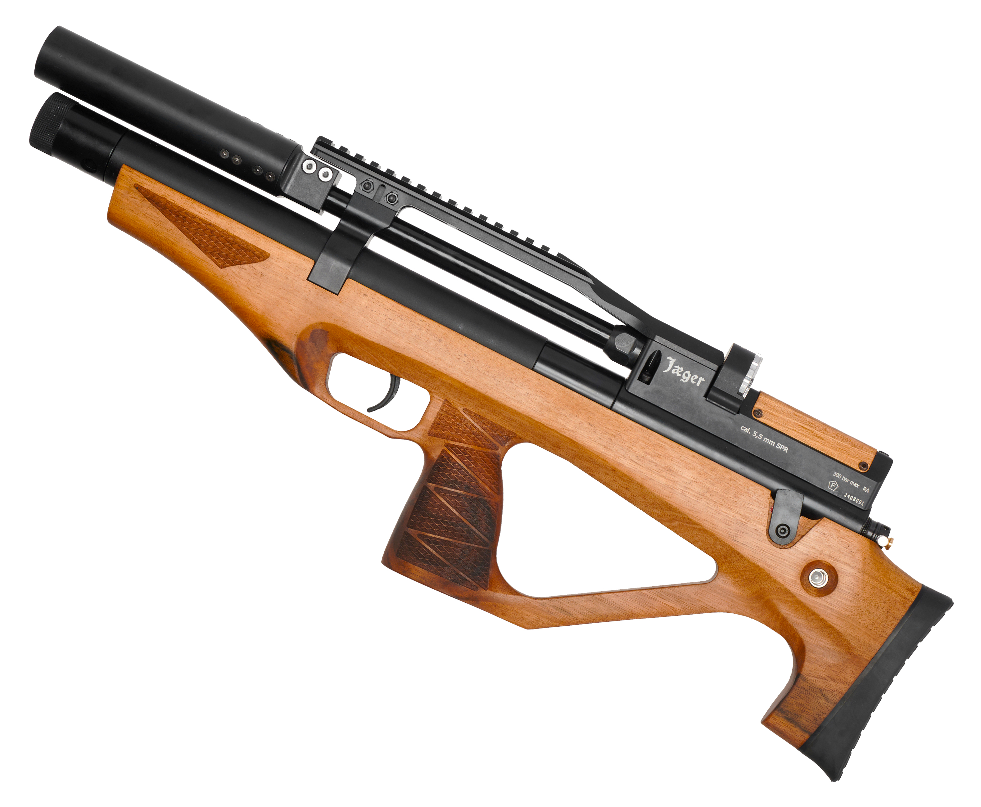 Обозреваемая пневматика выполнена в компоновке Буллпап и отличается деревянной ложей с металлическим корпусом. В длину модель не превышает 605 миллиметров, что в совокупности с массой, равной 2.85 кг, помогает комфортно использовать винтовку даже продолжительное время. Благодаря выбранному типу конструкции инженерам Jaeger удалось реализовать пистолетную рукоять, противоскользящий затыльник приклада из прорезиненного материала и компактное ухватистое цевье.