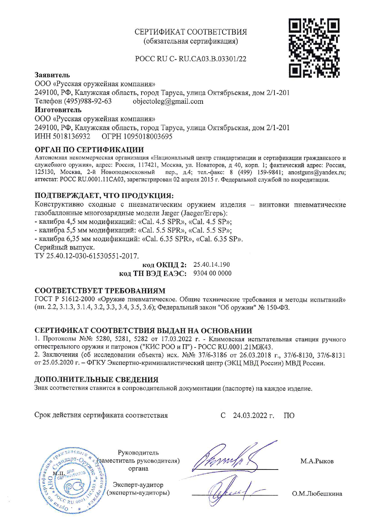 Рассматриваемая модель Егерь СПР 5.5 выпускается производителем с дульной энергией, находящейся в разрешенном законом диапазоне до 3 Дж. По этой причине для приобретения винтовки на территории России покупателю не потребуется обращаться в Росгвардию, чтобы получить оружейную лицензию. Усиленные версии при этом способны выстреливать свинцовые снаряды, разгоняя их до скорости свыше 300 м/с.