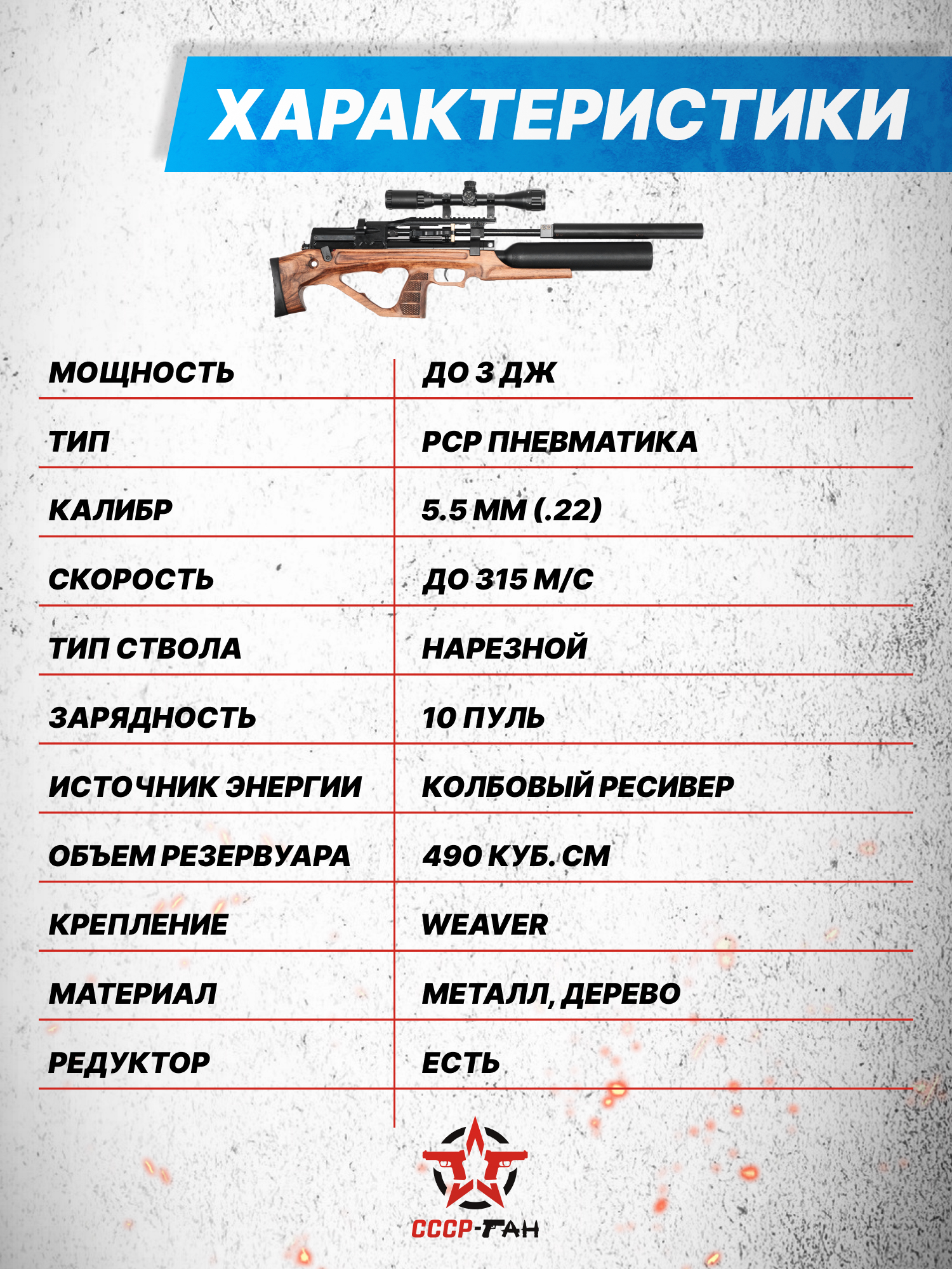 Завод-изготовитель указывает, модификации линейки располагают технической возможностью разгонять снаряды до начальной скорости 315 метров за секунду. При этом в отечественные розничные сети пневматическая винтовка поставляется с искусственно заниженной дульной энергией, лимитированной барьером 3 Джоуля - за счет этого можно купить образец без лицензии.