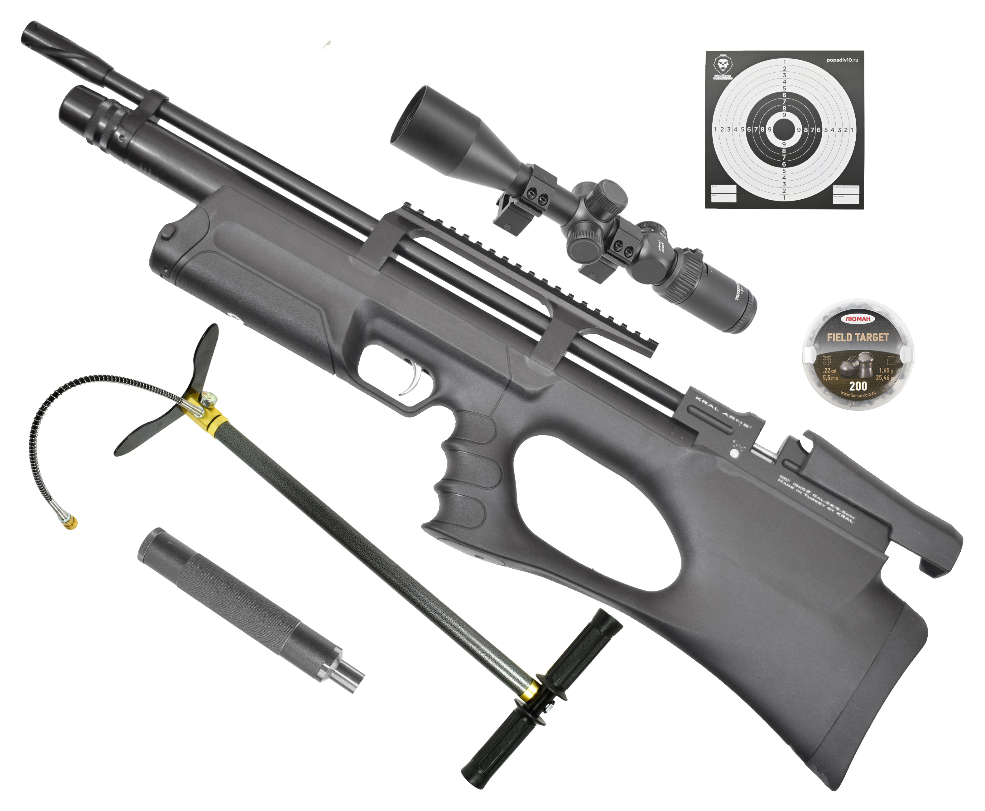 К описанной категории, например, относится обозреваемый подарочный набор Hunter, собранный вокруг винтовки Breaker 3S от завода Kral, которая классифицируется как PCP пневматика. Изделия этой категории в первую очередь выделяются тем, что для осуществления выстрела они применяют силу, образующуюся в процессе освобождения и расширения сжатого газа, который перед началом эксплуатации заправляется стрелком в штатный резервуар на 280 кубических сантиметров воздуха. В комплекте прикладывается ручной насос высокого давления, применяемый для заполнения ресивера.