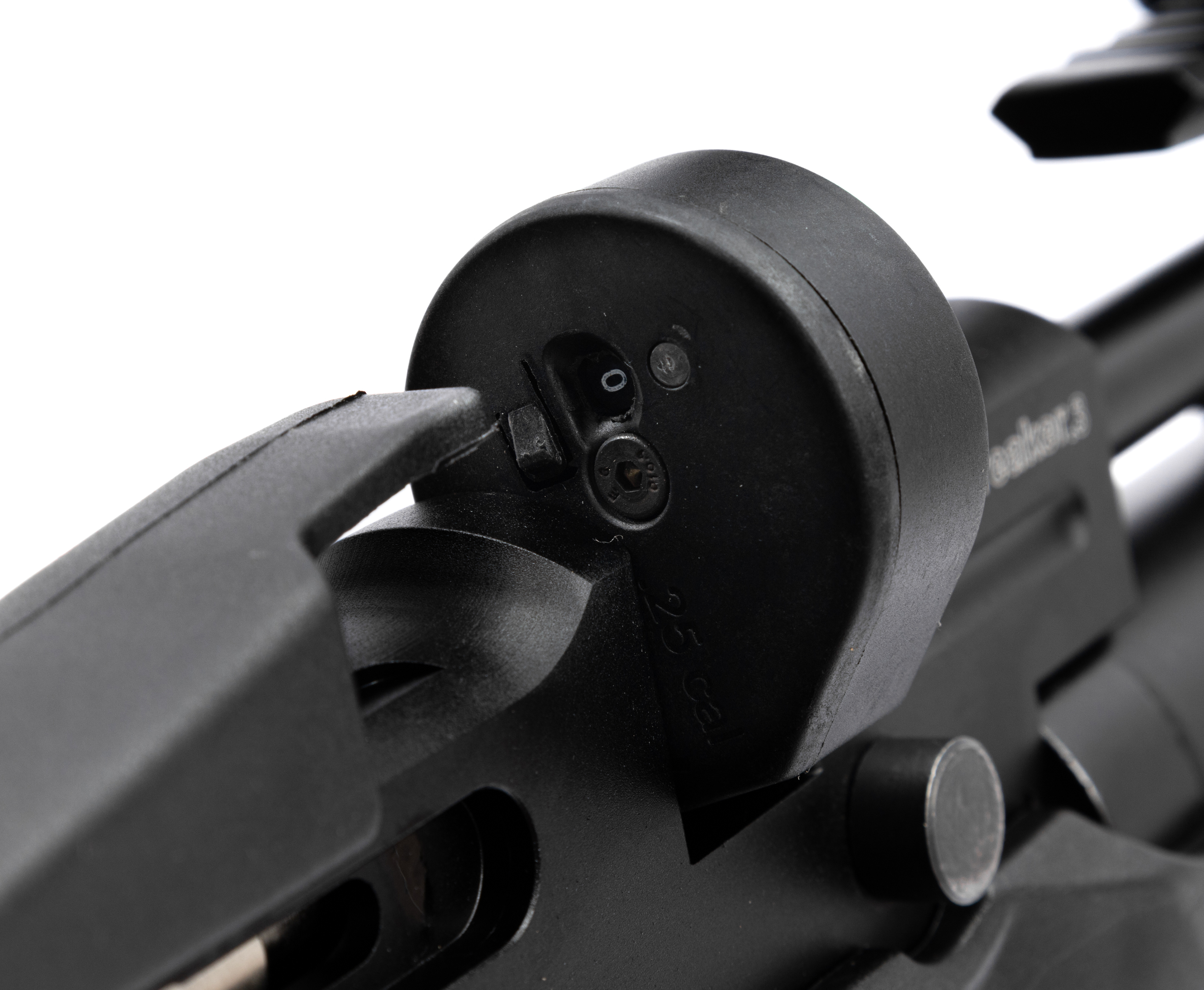 Для придания тяжелым пулям необходимой скорости и силы пробития мишени применяется ресивер объемом 280 куб. см, рассчитанный на высокое давление. Подствольное расположение считается типичным для PCP пневматики и одобряется выбором большинства стрелков. На торце самого резервуара спроектирован манометр для контроля давления воздуха. Производитель не советует превышать показатель нагнетания в 200 Бар.