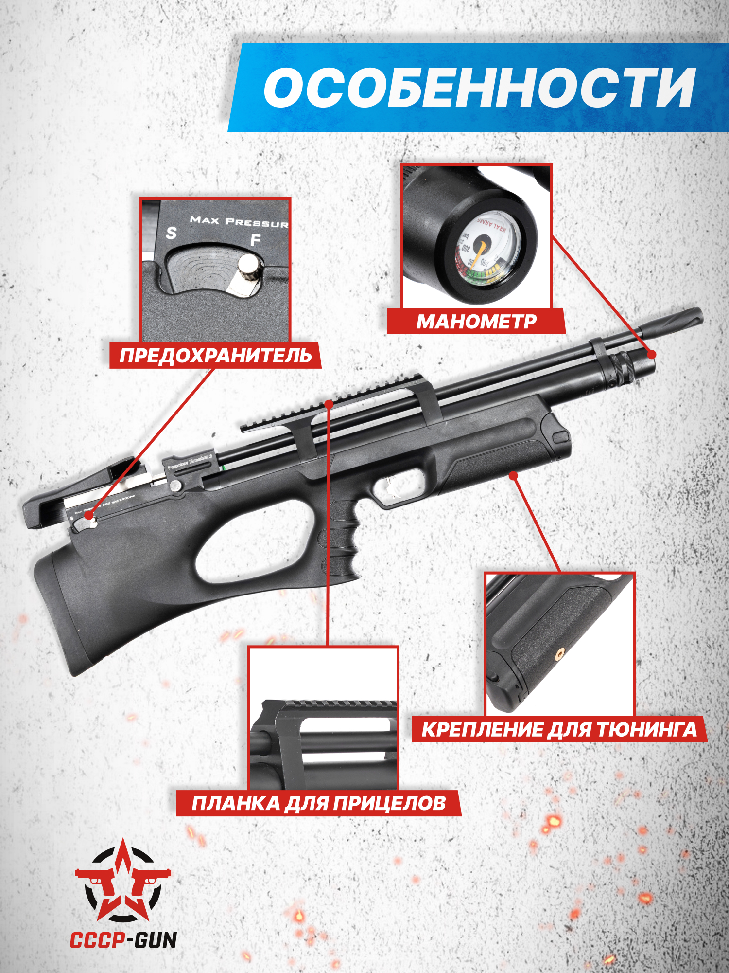 Обозреваемая пневматика от завода Kral Arms из Турции создана по схеме Bull-Pup, поэтому отличается необходимой компактностью, что помогает транспортировать пневматику к месту стрельбы и брать с собой в поездки на природу. Полная длина модели равняется 710 миллиметрам, что достигнуто продуманной эргономичной конструкцией, в которой затворный механизм расположен за спусковой скобой и установлен ближе к прикладу.