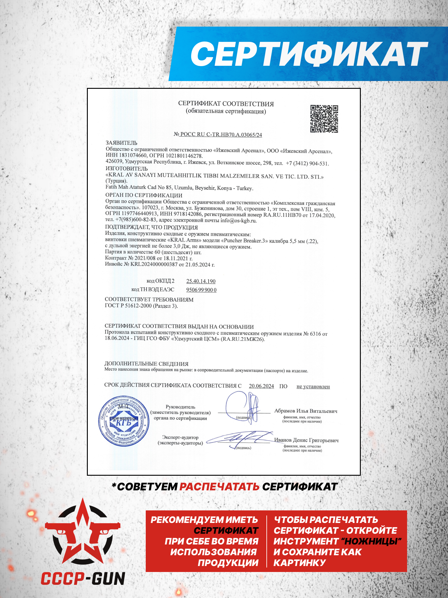 Ввозимые на территорию России, модели Крал Панчер Брейкер 3 5.5 могут приобретаться в свободной форме, без получения покупателями лицензии в органах Росгвардии. Это обусловлено тем, что винтовки поставляются в страну с дульной энергией, не превышающей 3 Джоулей.