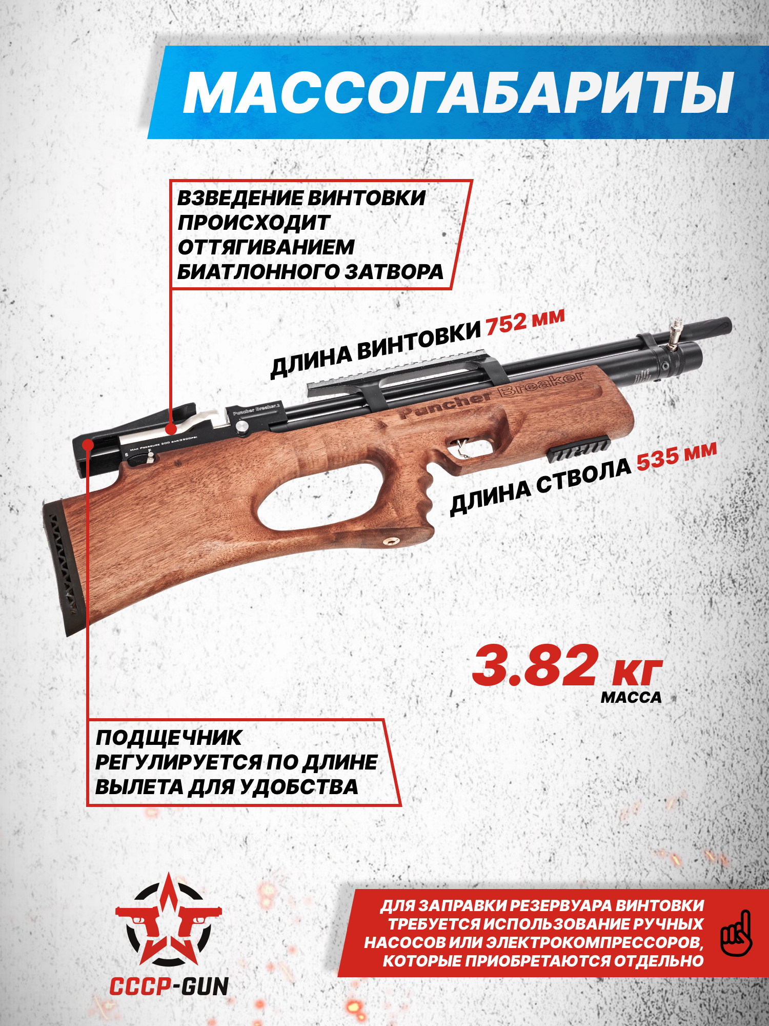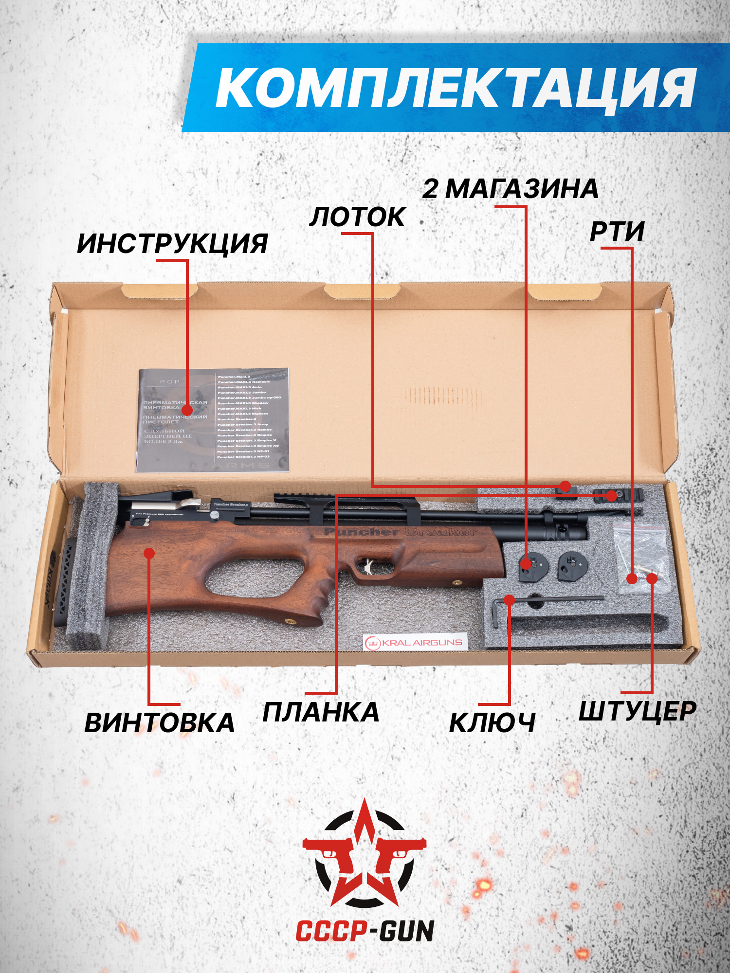 Представленная винтовка Kral Puncher Breaker 3w, разработанная компанией Крал Армс, является современным представителем пневматики с футуристическим дизайном компоновки формата Bull-Pup. Благодаря такой конструкции размеры оружия снизились до 752 миллиметров, а вес до 3.82 килограмма, что характеризует изделие, как компактный вариант для комфортного перемещения в специальном кейсе или сумке.