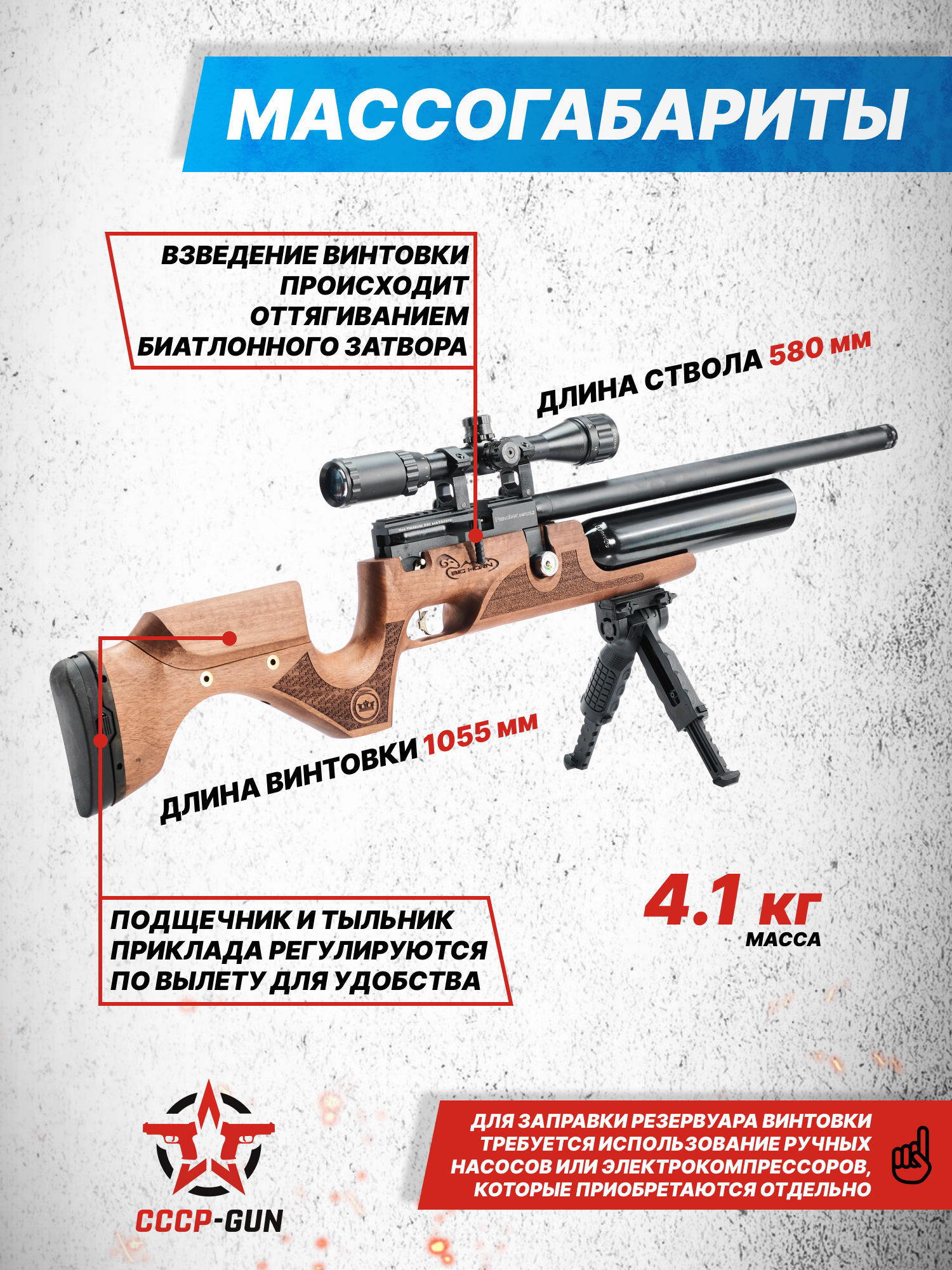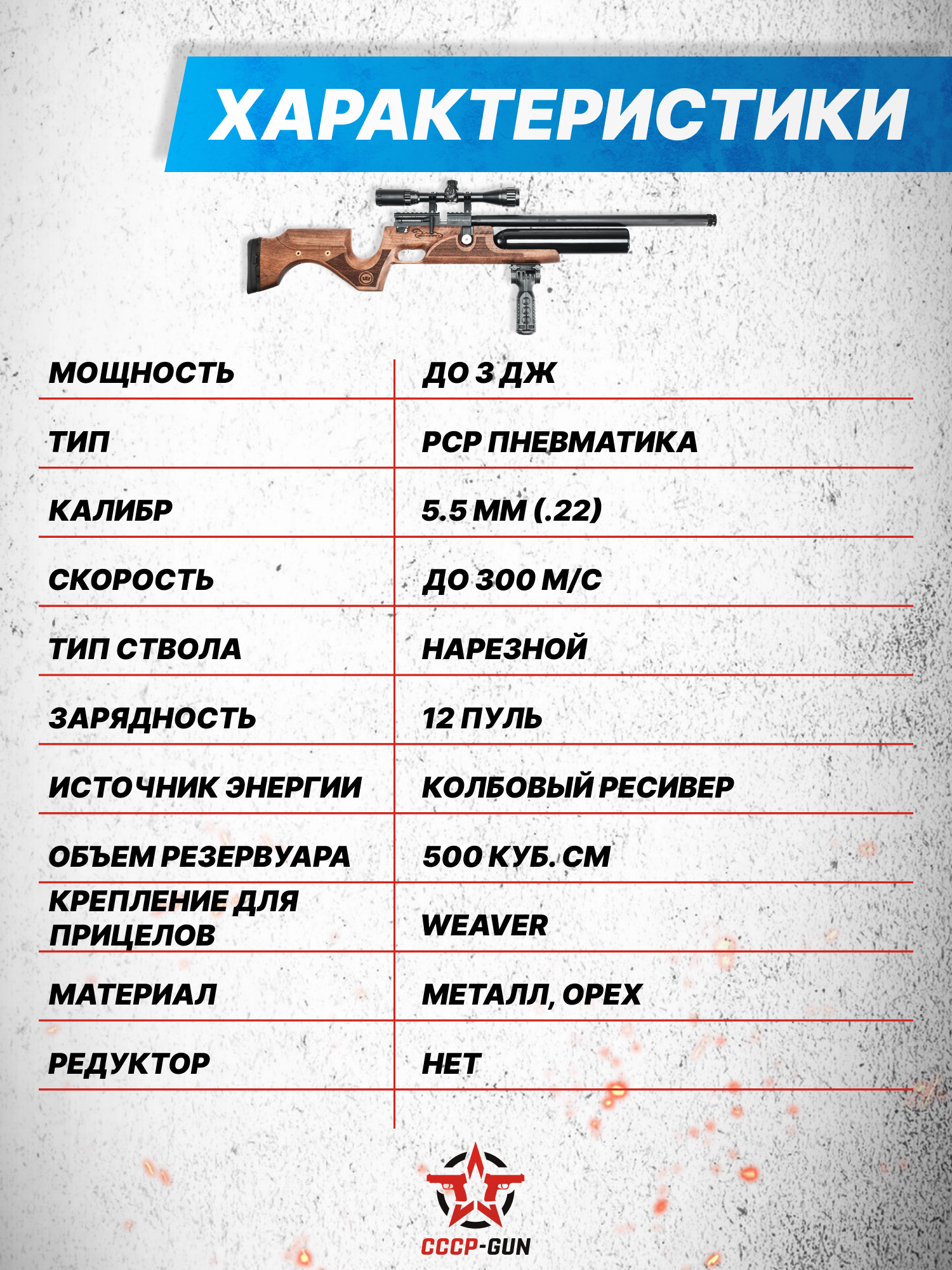 Внимание! Данная модель поставляется в разрешенной мощности для свободного приобретения на территории Российской Федерации. При этом в модели имеется возможность увеличения мощности путем замены части деталей или настройки конструкции, однако не стоит забывать о Федеральном законе «Об оружии» № 150 - ФЗ. В случае необходимости, опираясь на данный закон и руководствуясь им, возможно, потребуется получить разрешение от ЛЛР ГУ МВД России после вмешательства в конструкцию.