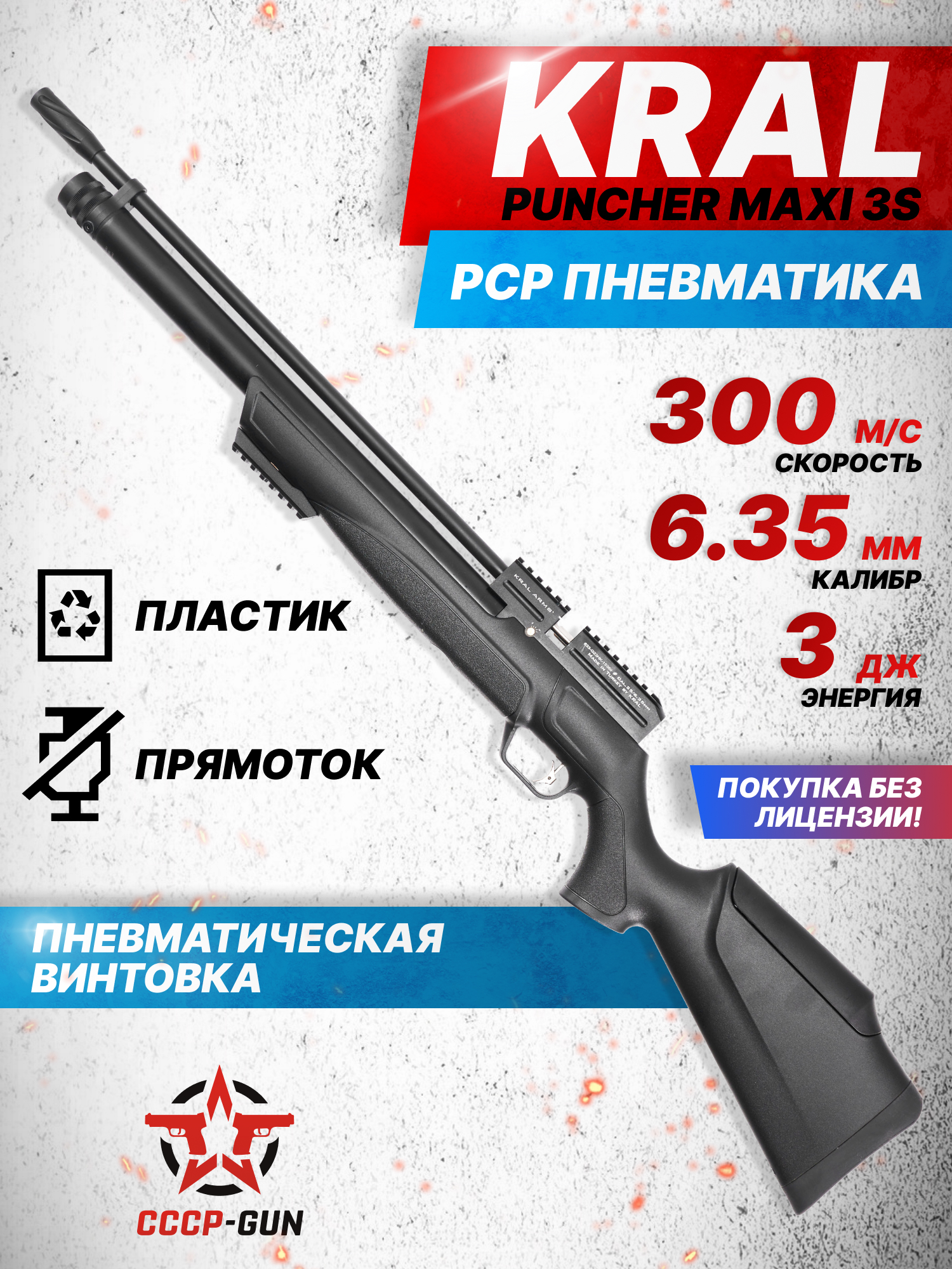 Прямоточная пневматика Kral Puncher Maxi 3S 6.35 мм относится к винтовкам с классической компоновкой. Обозреваемое изделие использует в качестве источника энергии цилиндрический резервуар высокого давления объемом 280 кубических сантиметров, в который предварительно закачивается воздух с помощью насоса.