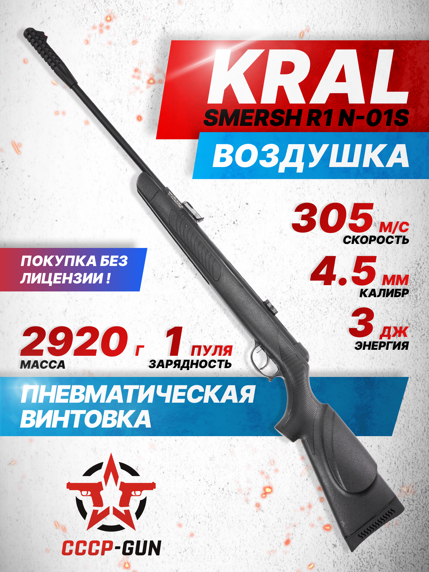 Kral Smersh R1 N 01S 4.5 выталкивает пулю с помощью давления воздуха, который сжимается в специальной камере при помощи поршня. Этот механизм приводится в движение витой пружиной, которая высвобождается после нажатия на спусковой крючок. Поскольку работает пневматика в одиночном режиме, перед произведением выстрела оружие необходимо взвести методом перелома ствола.
