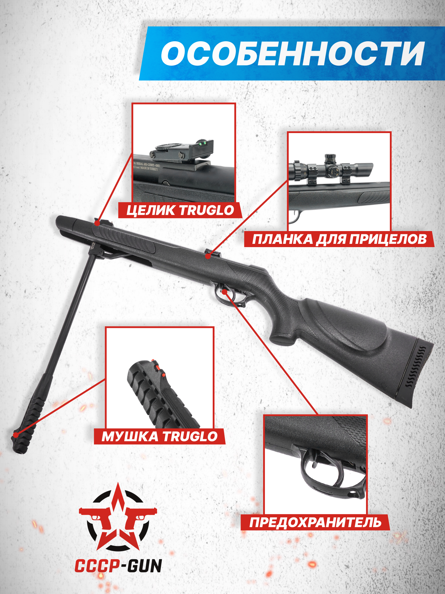 Боеприпасами выступают свинцовые пули под калибр 4.5 миллиметра, которые заряжаются в специальный отсек. Уточняется, что стальной бланк составляет в длину 45.5 сантиметров и имеет нарезной канал, что помогает увеличить точность стрельбы. Производитель позаботился о безопасности пользователя и интегрировал в пневматику автоматический предохранитель, который прикрыт спусковой скобой.