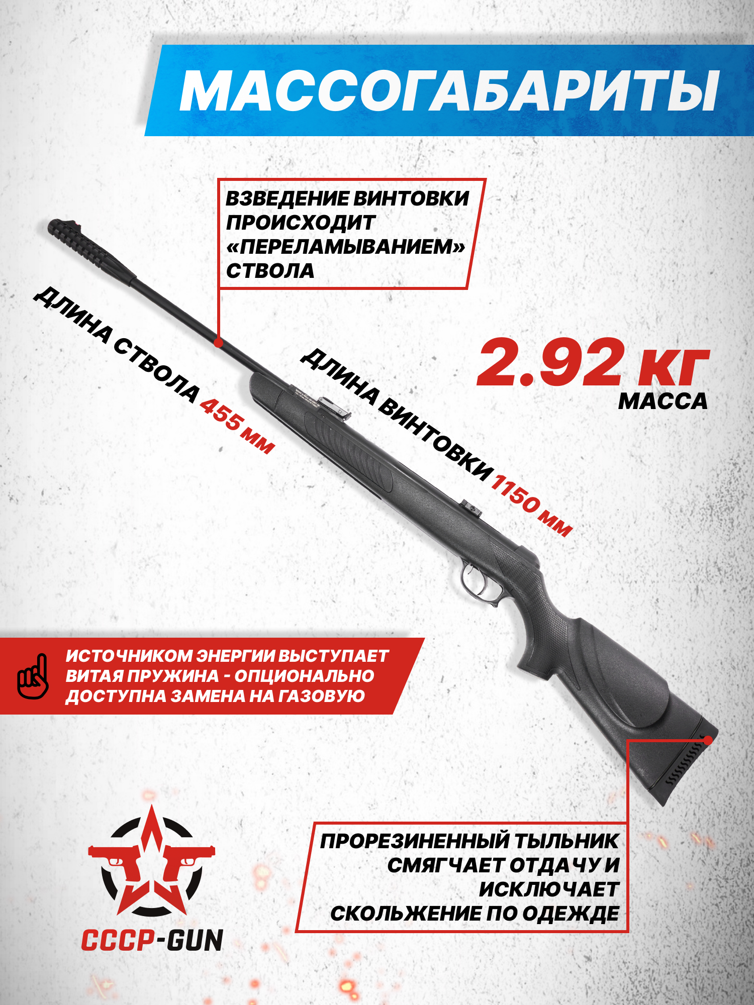 Внимание! Данная модель поставляется в разрешенной мощности для свободного приобретения на территории Российской Федерации. При этом в модели имеется возможность увеличения мощности путем замены части деталей или настройки конструкции, однако не стоит забывать о Федеральном законе «Об оружии» № 150 - ФЗ. В случае необходимости, опираясь на данный закон и руководствуясь им, возможно, потребуется получить разрешение от ЛЛР ГУ МВД России после вмешательства в конструкцию.