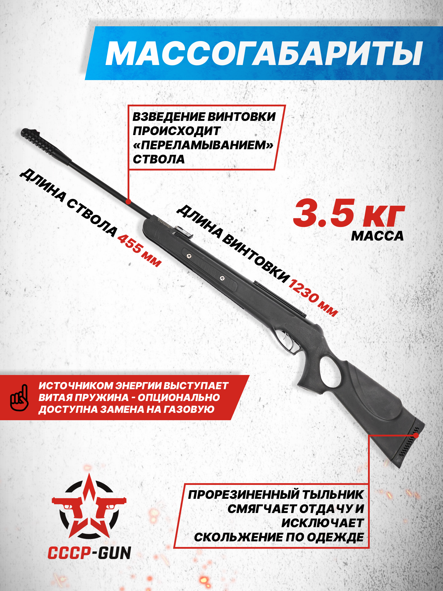 Рассматриваемой моделью стала Kral Smersh R5 N 04 калибра 5.5 мм. Она отличается простотой конструкции и автономностью. В ее основе пружинно-поршневая схема с переломным взводом, наделяющая изделие независимостью от внешних источников сжатого воздуха.