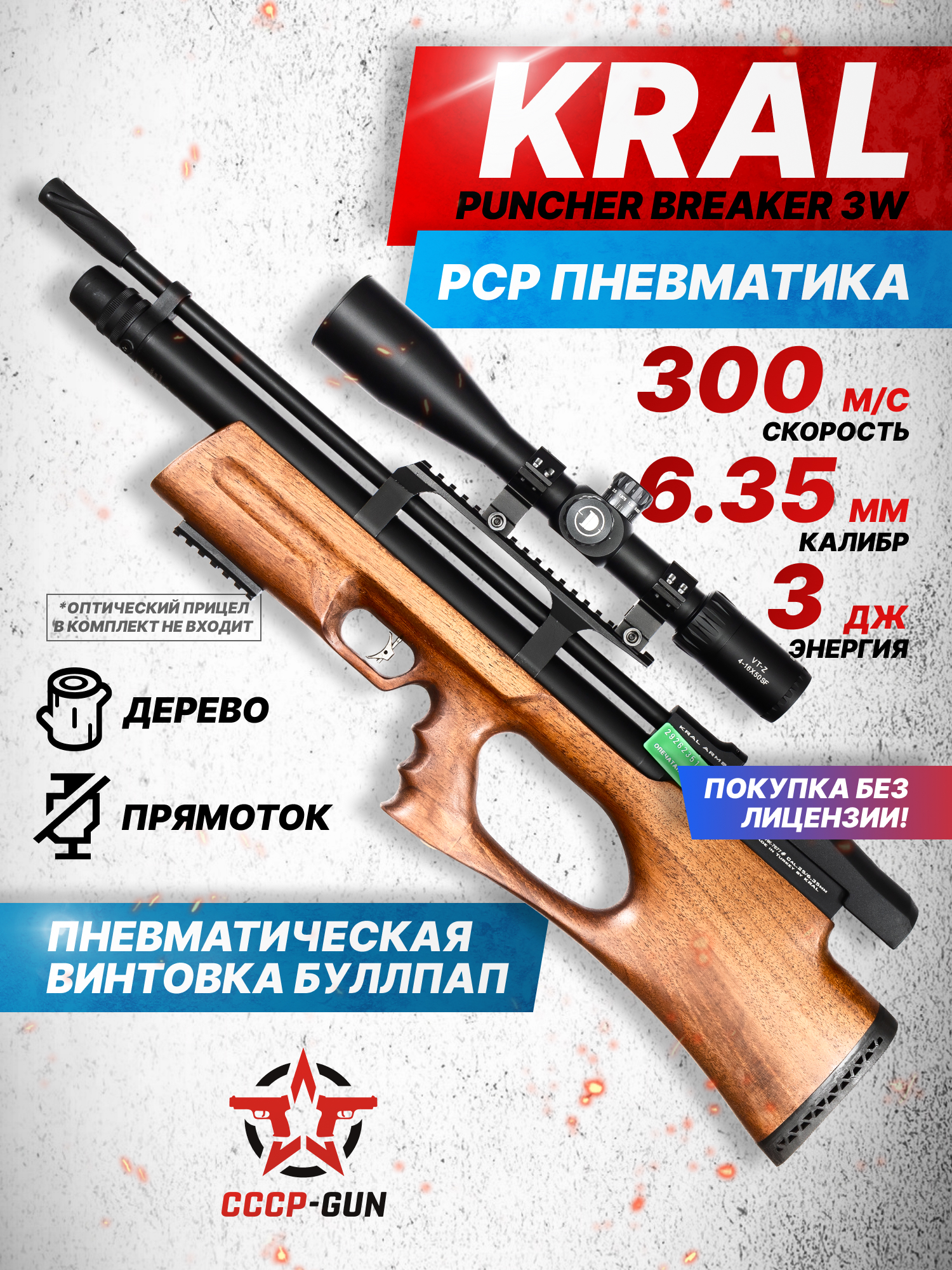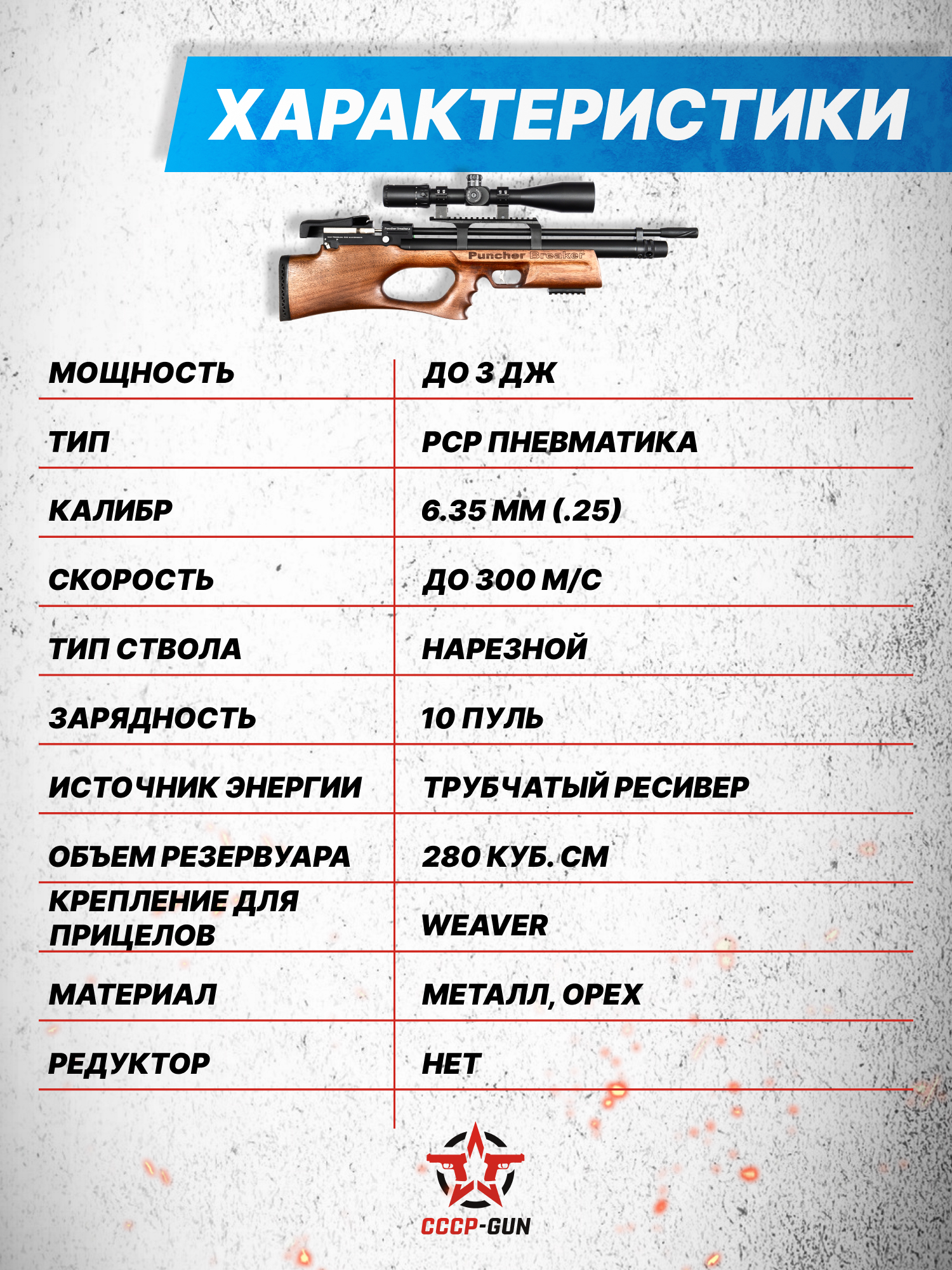 Рассматриваемая винтовка стреляет свинцовыми боеприпасами калибра 6.35 мм с мощностью дульной энергии до 3 Дж. При совокупности этих параметров разрешается покупать обозреваемое изделие на территории РФ без получения лицензии. Сразу хочется отметить, что после усиления модель рассчитана на скорость выстрела в 300 метров в секунду, позволяя эффективно использовать изделие на профессиональных спортивных состязаниях.
