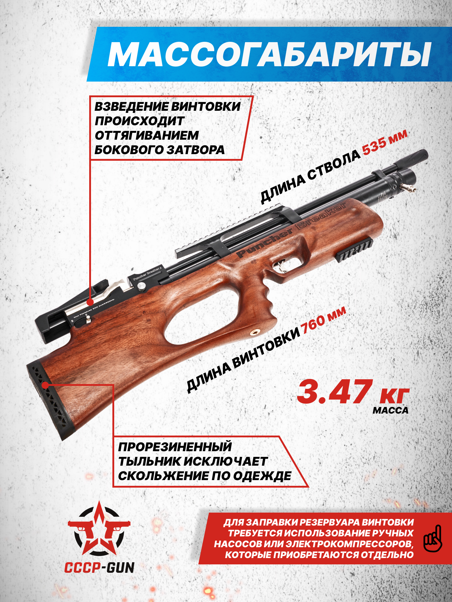 По механизму и расположению резервуара с сжатым воздухом, PCP модель Крал Панчер Брейкер 3 W использует привычную и проверенную временем конструкцию. Металлический ресивер на 280 куб. сантиметров сжатого воздуха, считается достаточно крепким, чтобы держать давление в 200 Бар. Именно до такой отметки компания Крал советует закачивать воздух, поэтому для контроля показателя на винтовке установлен манометр.