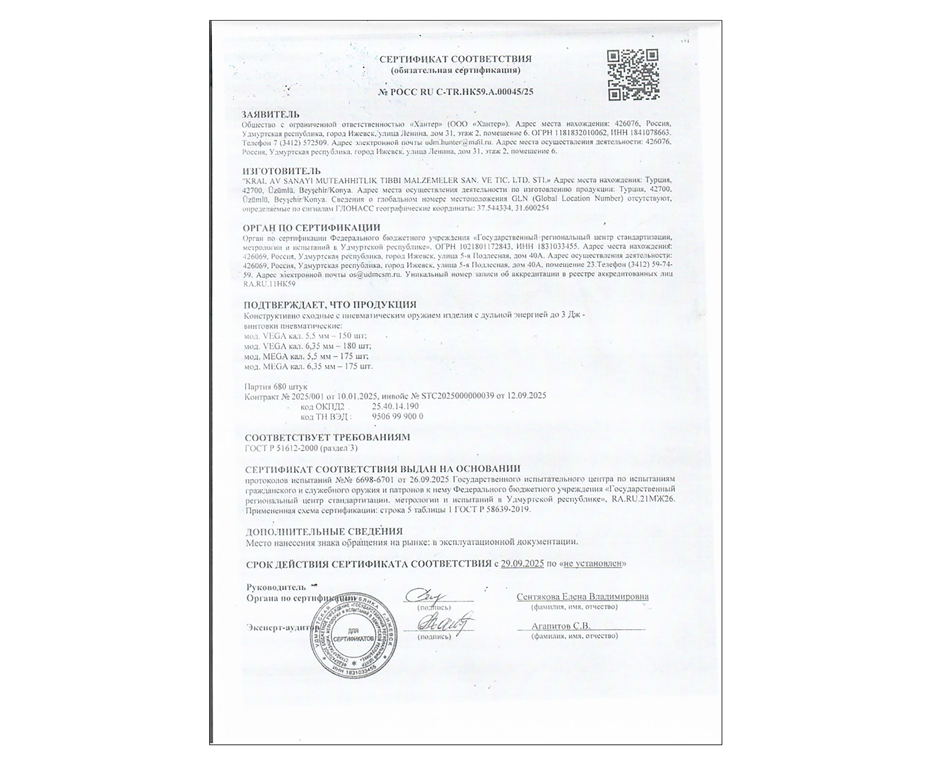 Представленный набор Хантер содержит в себе винтовку серии Vega V-01 с «переламывающимся» стволом. Образец выступает усовершенствованием модели Смерш, из-за чего сформировалось хорошее сочетание рабочих параметров и эргономики ложа. Помимо этого, в конструкции установлен нарезной бланк 455 миллиметров, что обеспечило повышение кучности при ведении стрельбы.