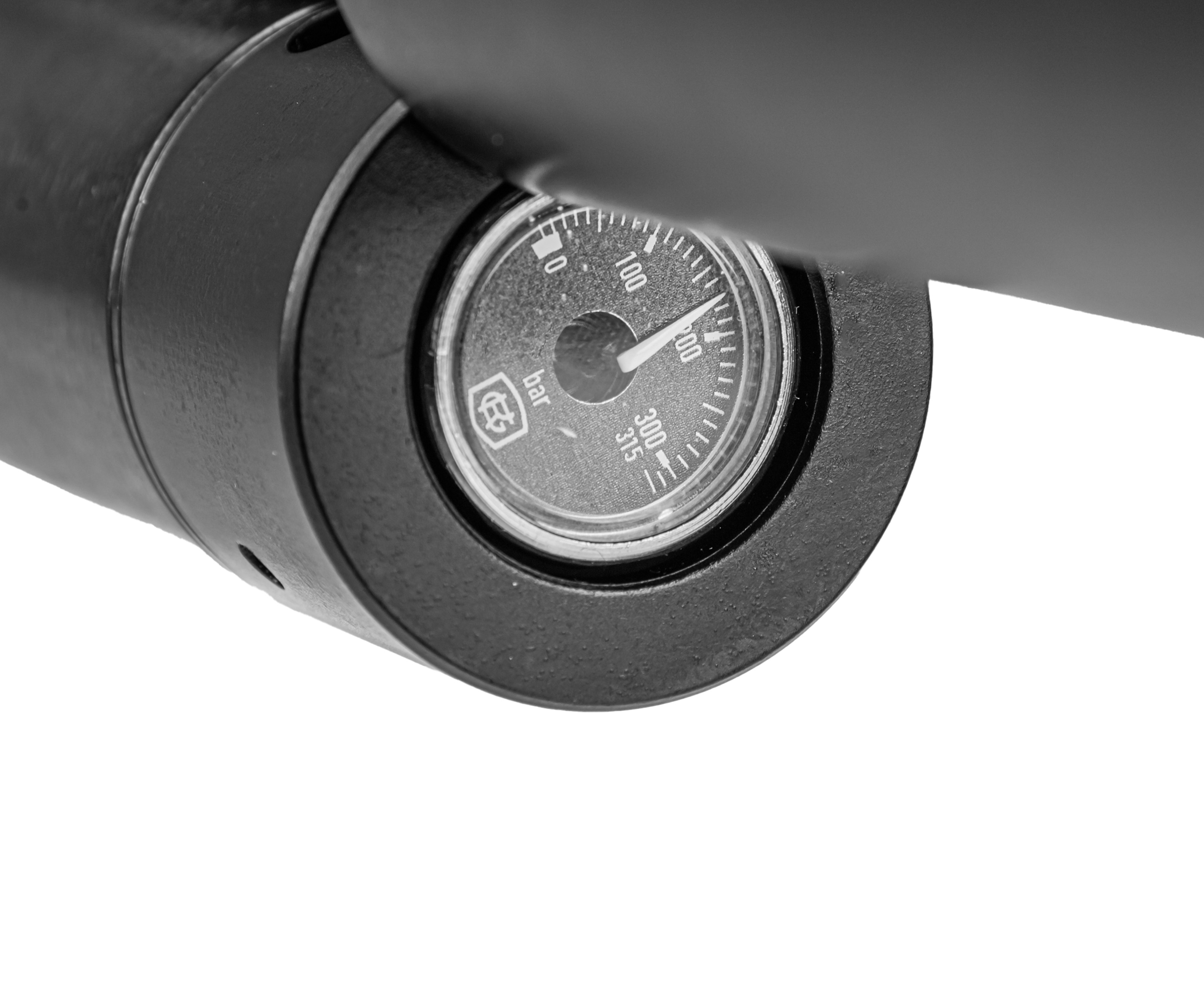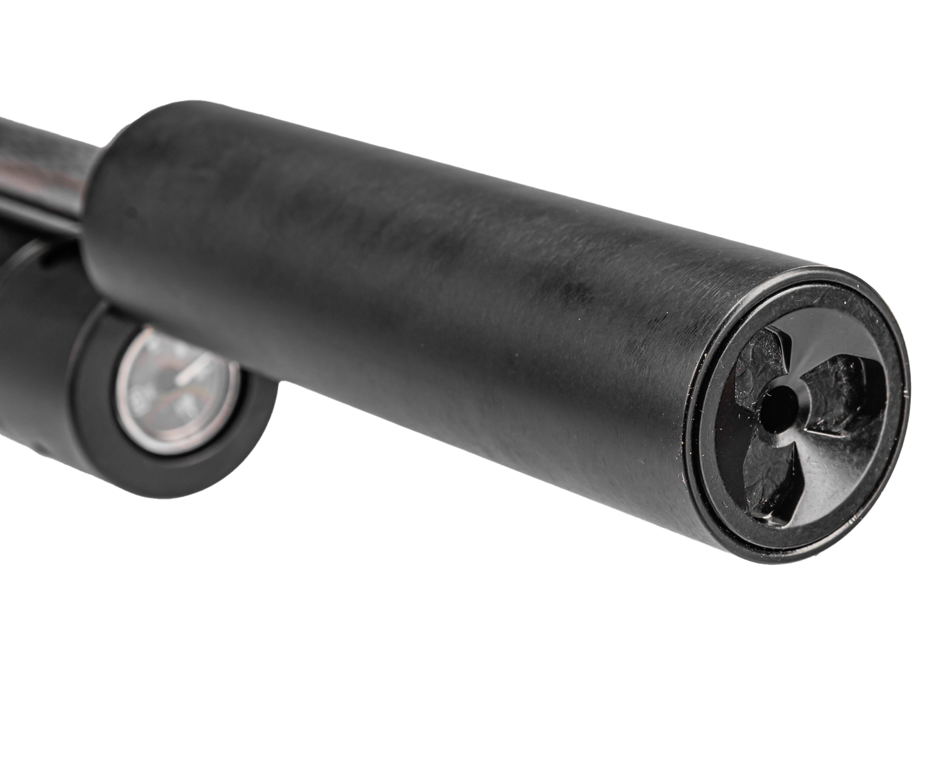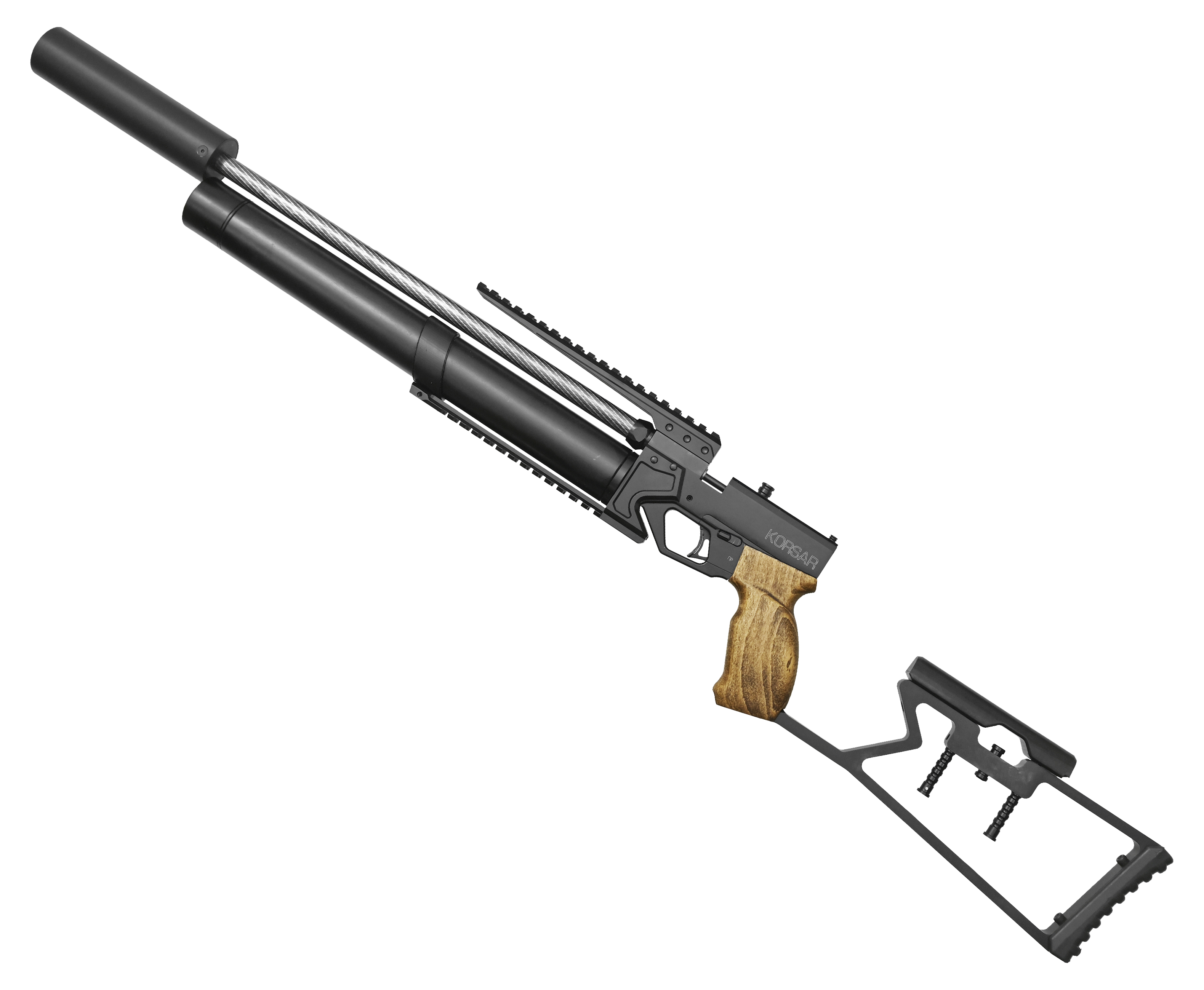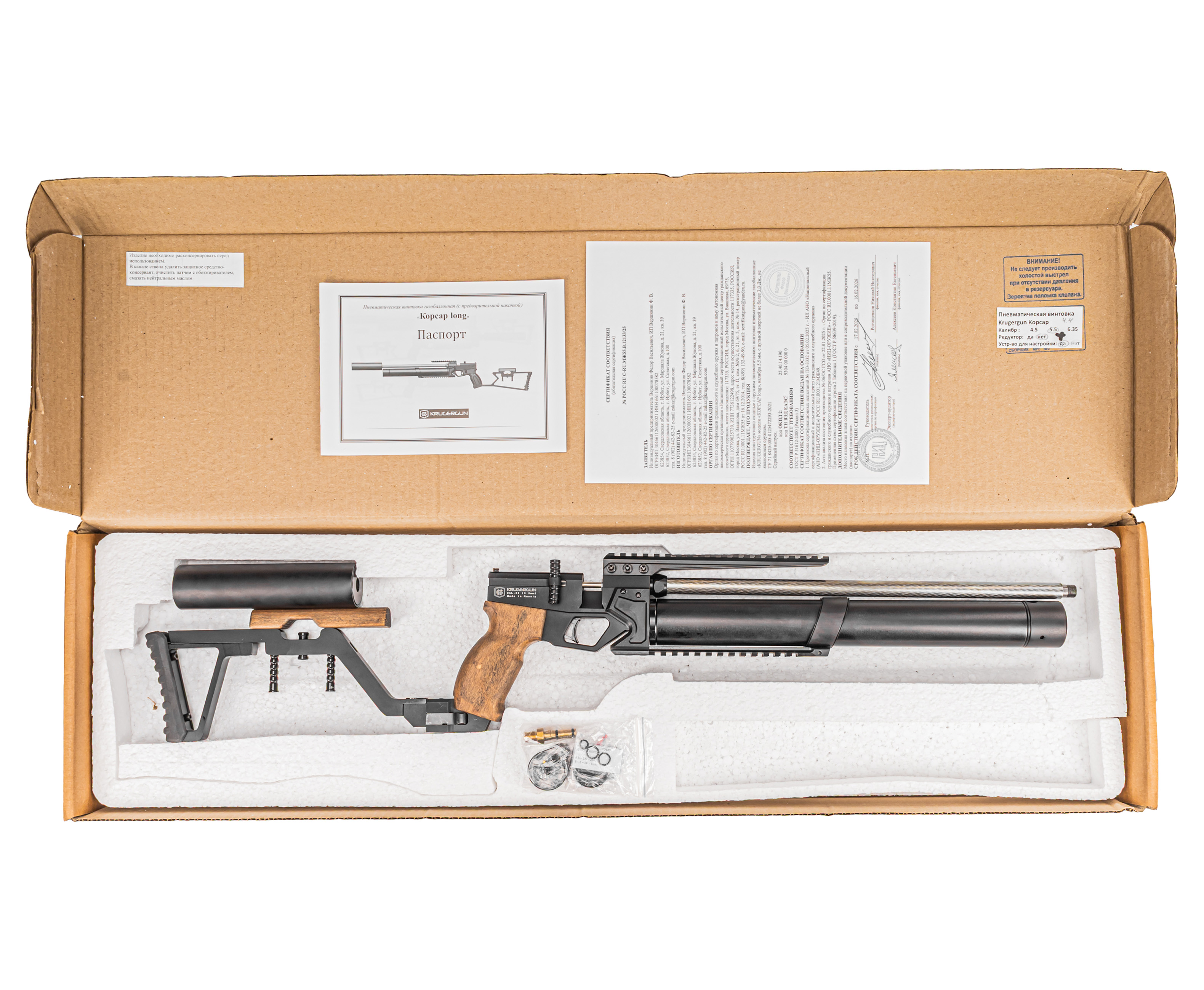 Обозреваемая пневматика KrugerGun Корсар Long в дереве входит в перечень образцов оружия, использующих для стрельбы силу расширения сжатого газа, который содержится в специальном интегрированном ресивере. Штатный трубчатый баллон, расположенный под стволом винтовки, способен вмещать до 277 куб. сантиметров воздушной массы под давлением в 250 атмосфер. Для контроля обозначенных показателей на торце цилиндрического резервуара производитель установил манометр.