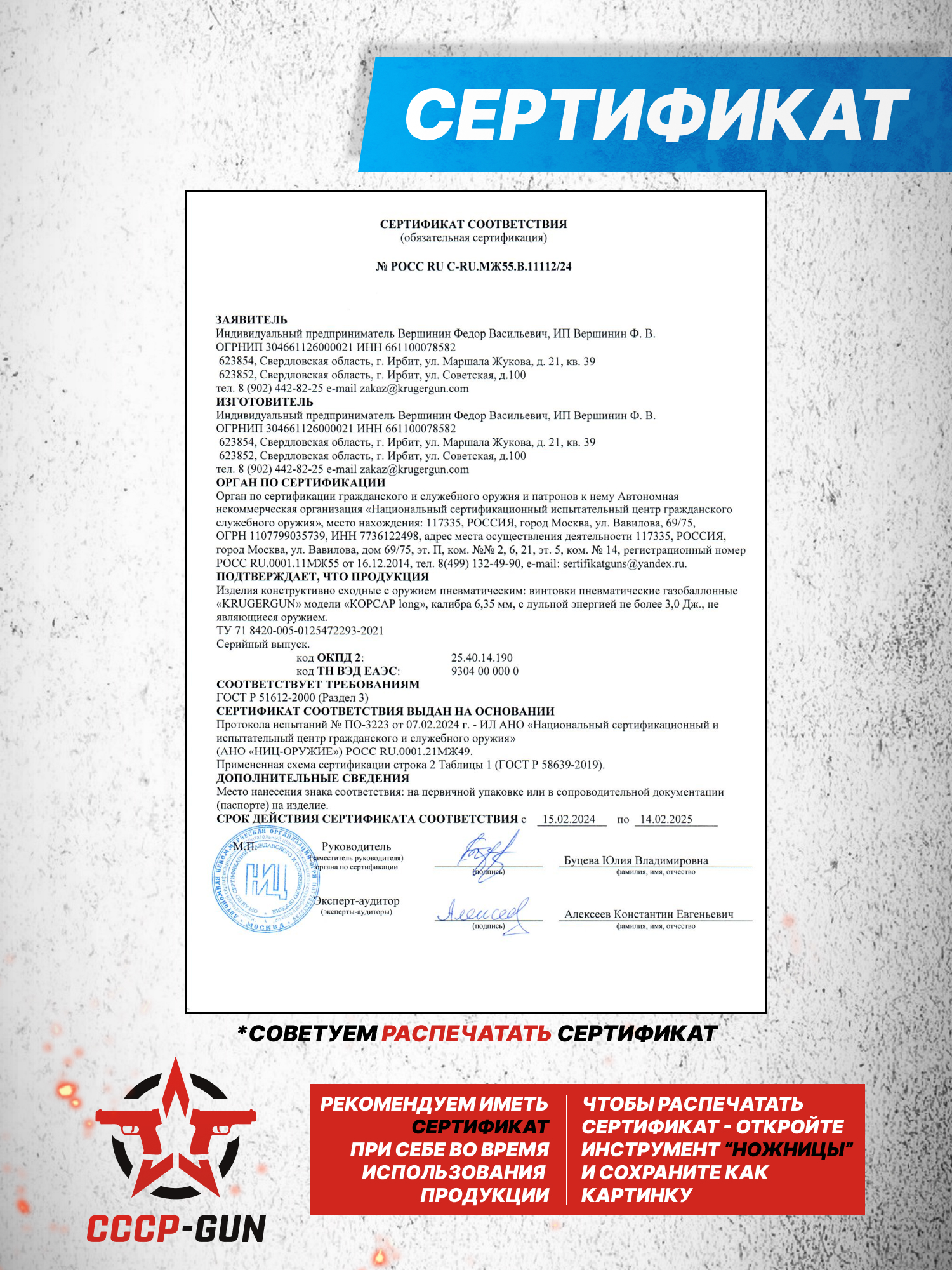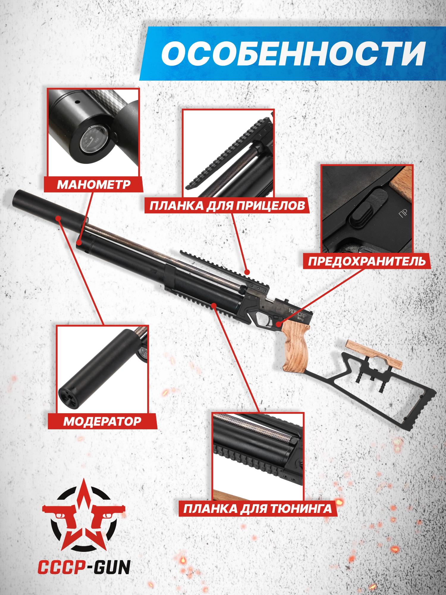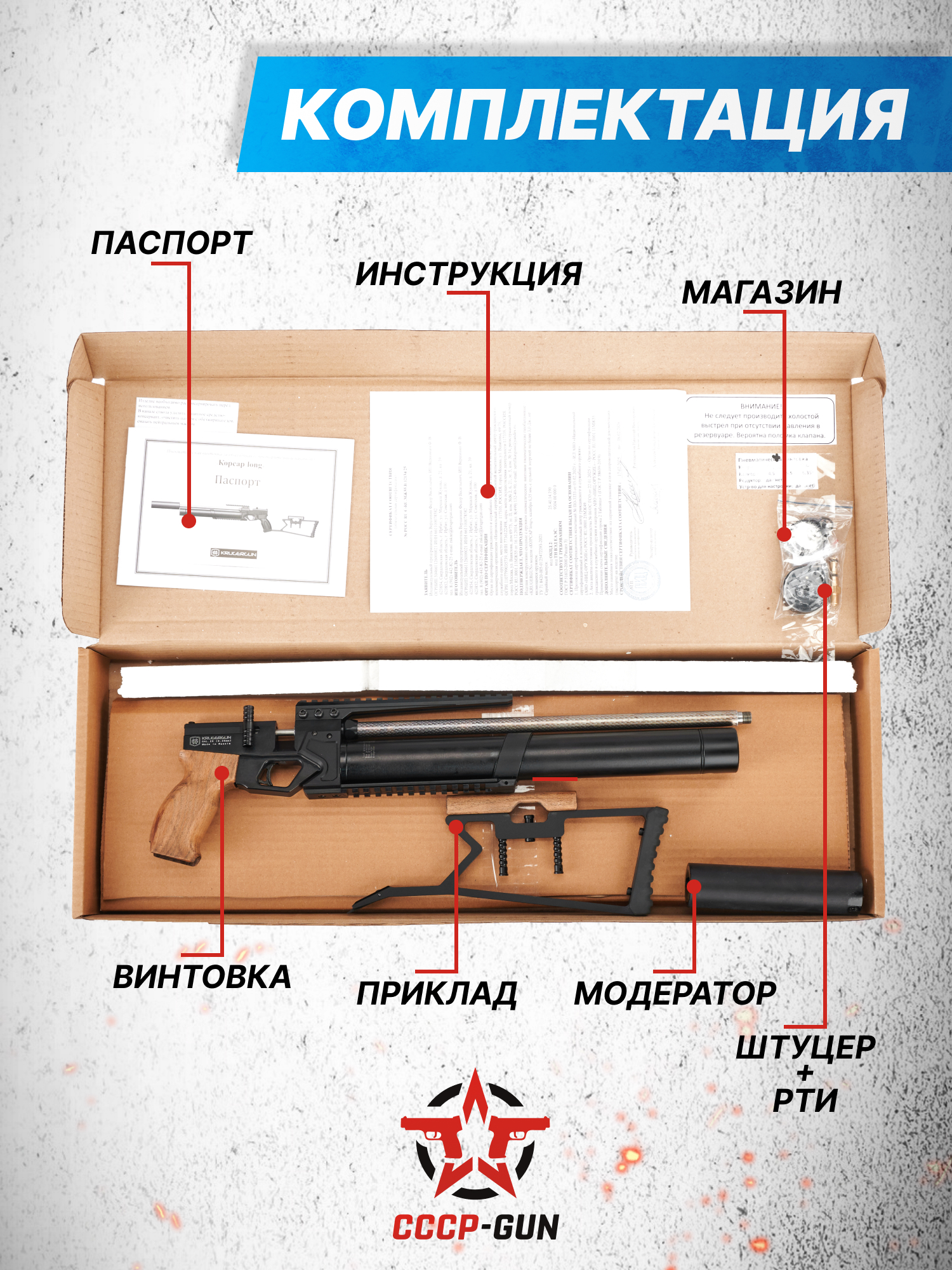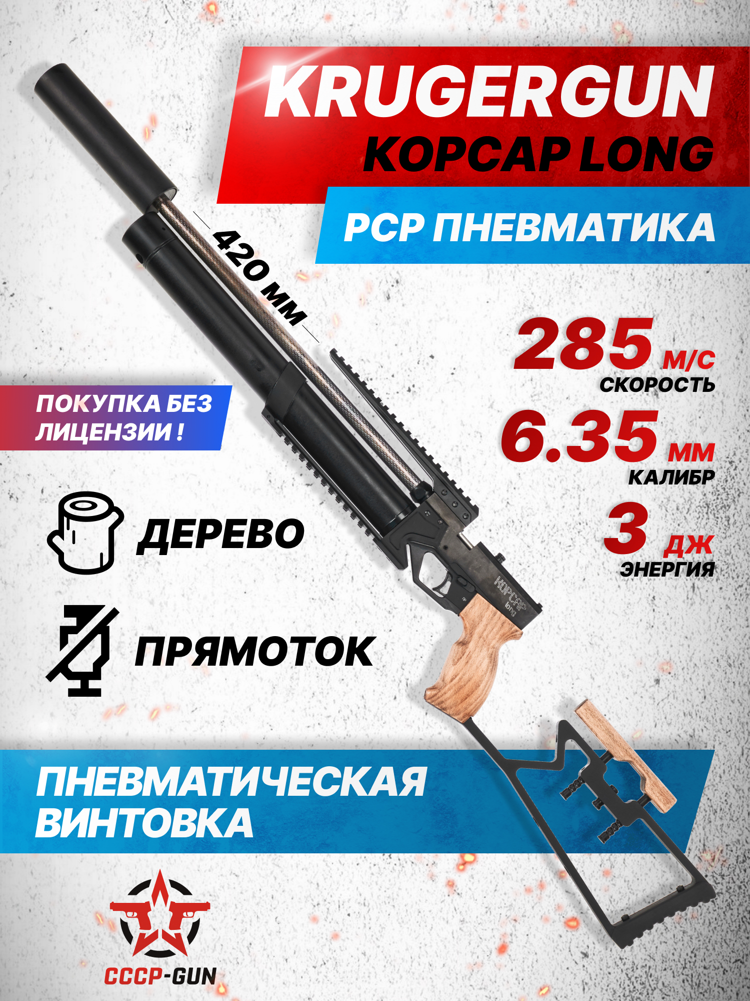Внимание! Данная модель поставляется в разрешенной мощности для свободного приобретения на территории Российской Федерации. При этом в модели имеется возможность увеличения мощности путем замены части деталей или настройки конструкции, однако не стоит забывать о Федеральном законе «Об оружии» № 150 - ФЗ. В случае необходимости, опираясь на данный закон и руководствуясь им, возможно, потребуется получить разрешение от ЛЛР ГУ МВД России после вмешательства в конструкцию.