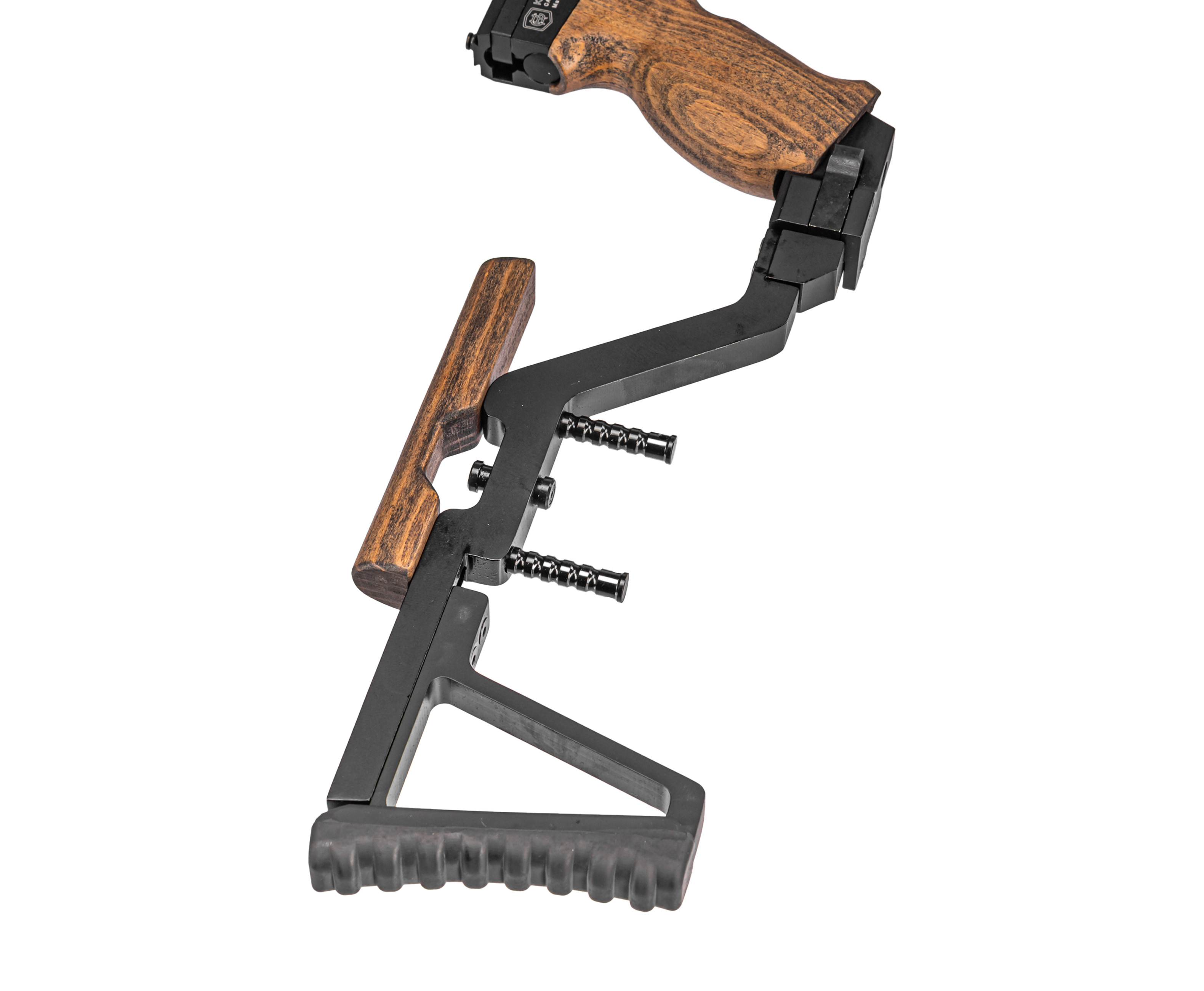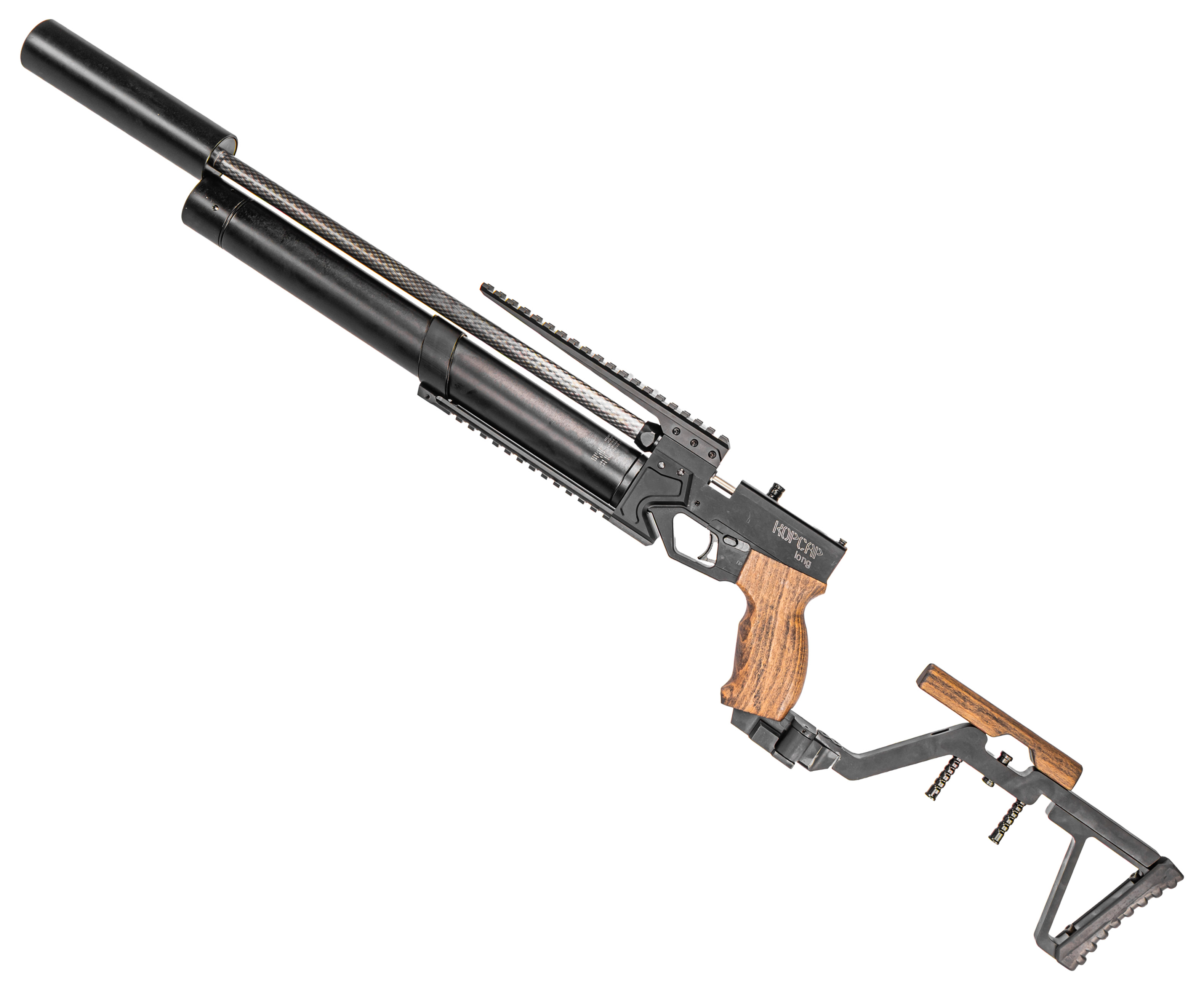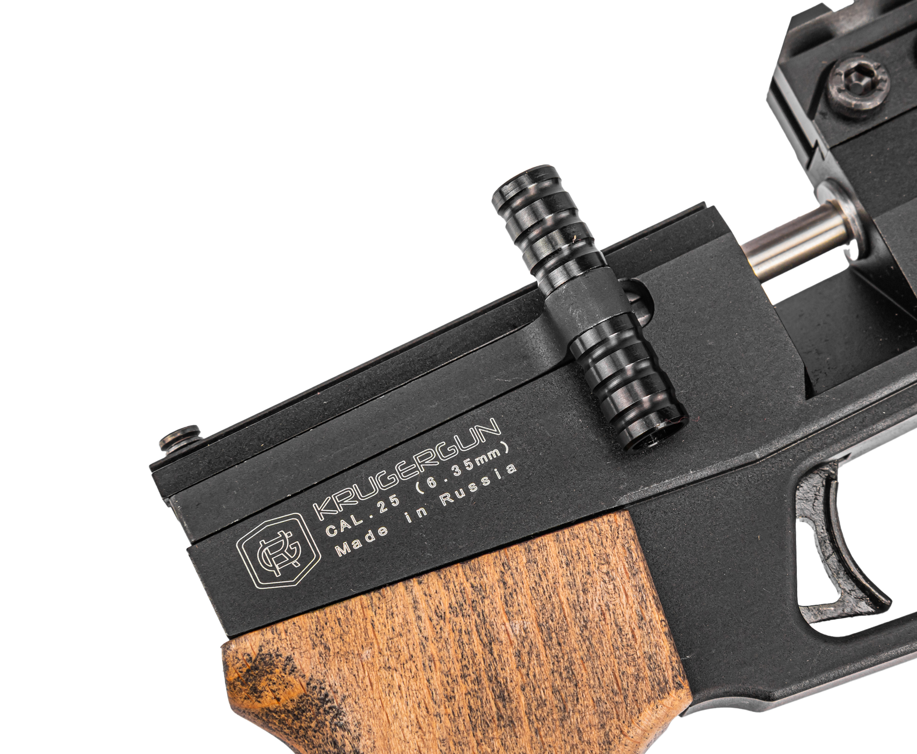 KrugerGun Корсар 6.35 мм предусматривает опцию монтажа дополнительных элементов внешнего тюнинга, например, сошек, рукоятей или осветительных приборов, которые фиксируются на планке Weaver 22 мм под резервуаром. Аналогичный формат крепежной платформы расположен над стволом и выступает интерфейсом для установки оптических, а также коллиматорных прицельных приспособлений, дающих повысить результативность стрельбы на разных дистанциях.